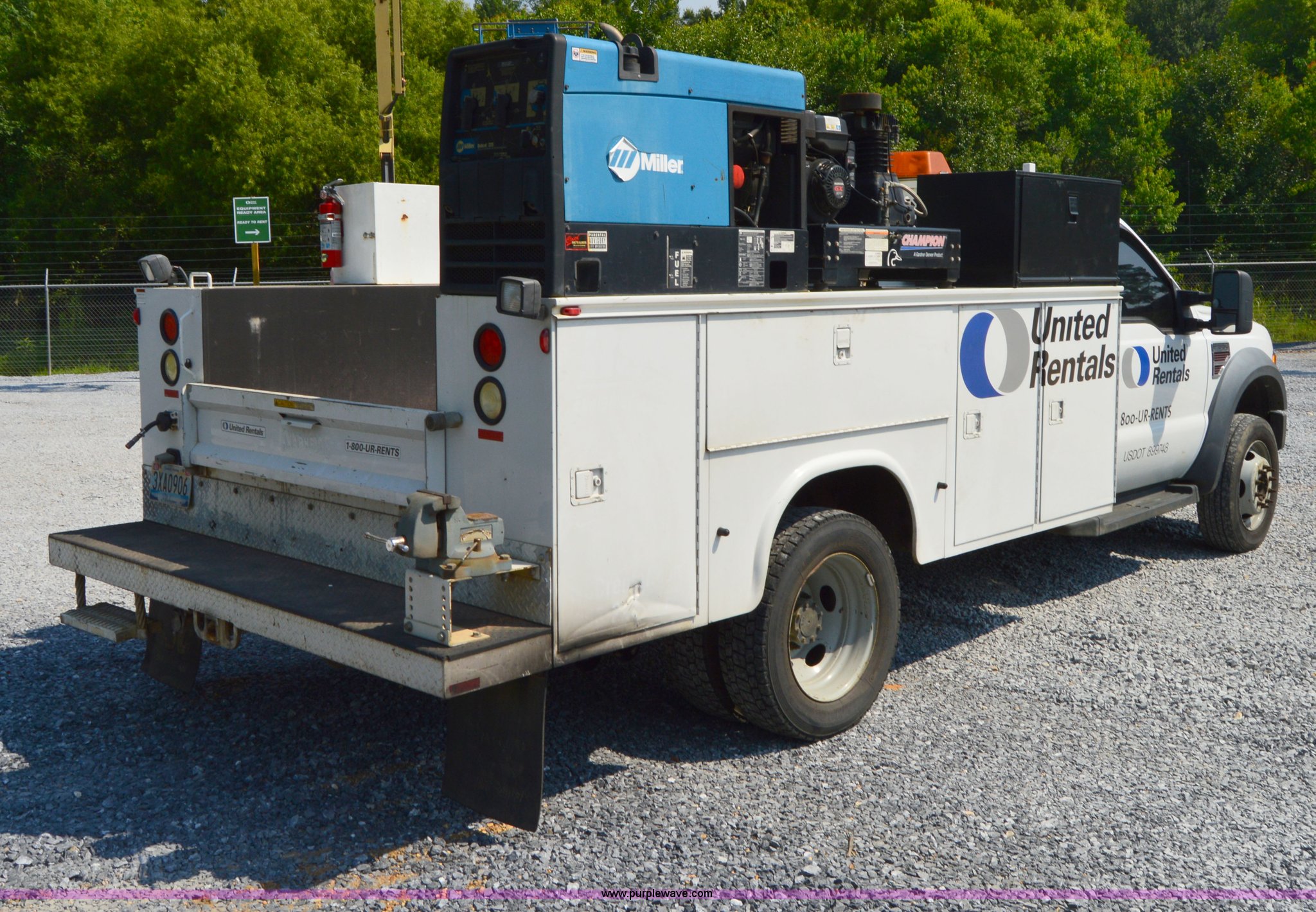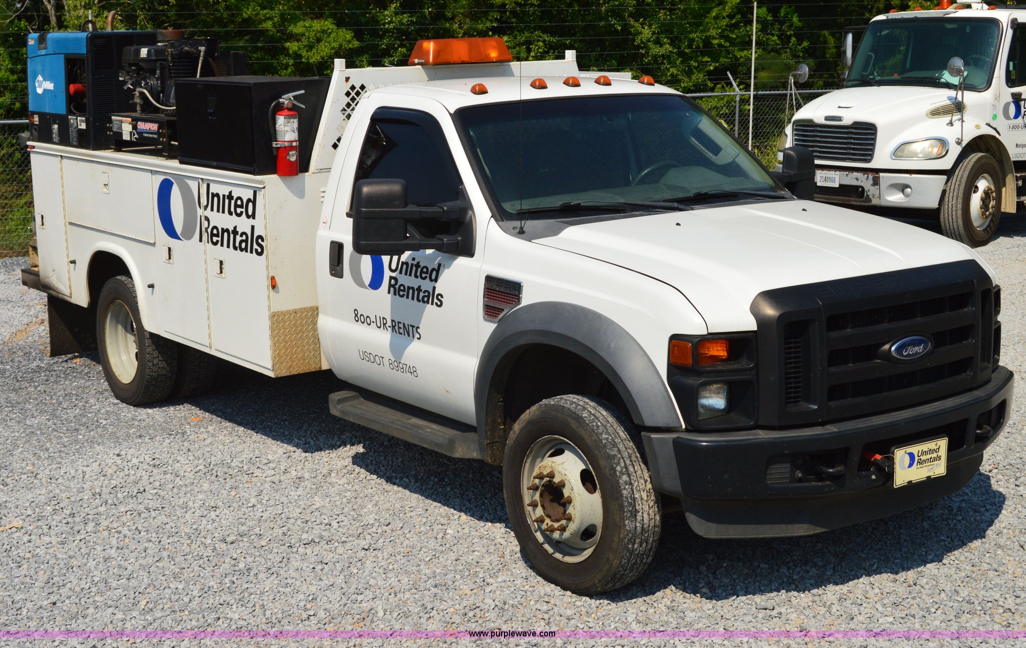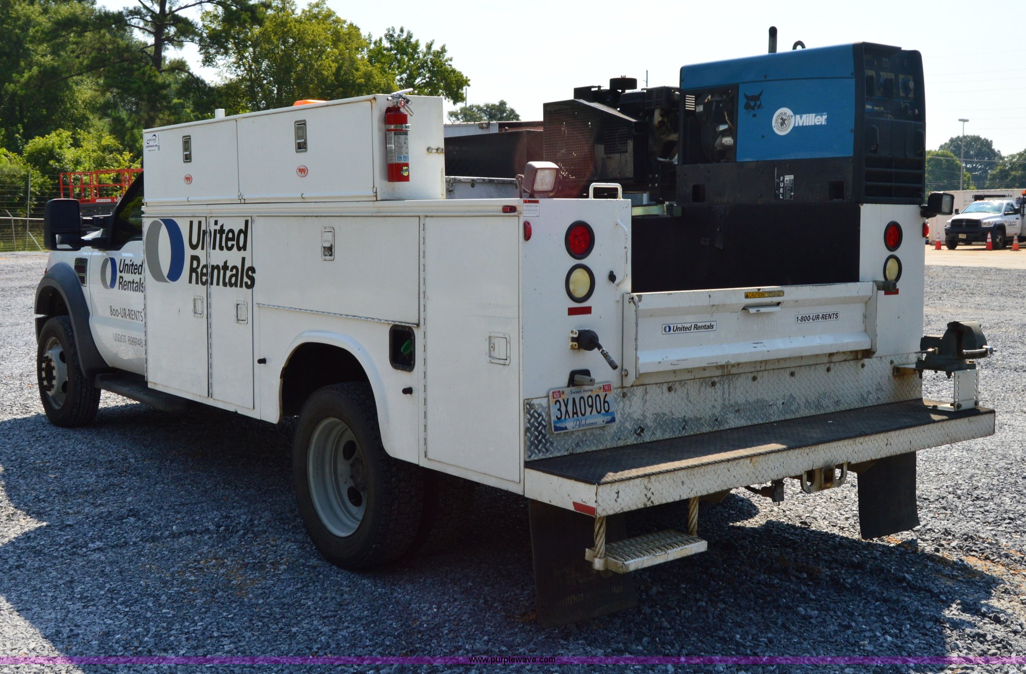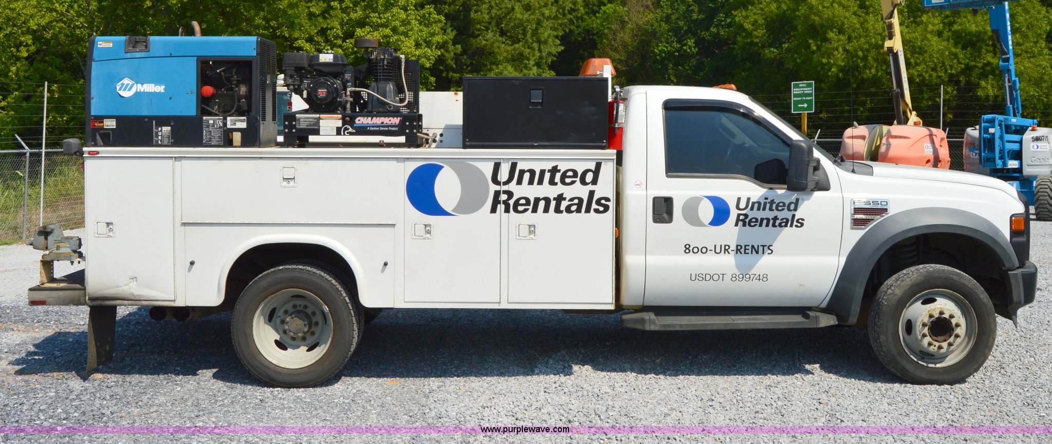 2008 Ford F550 service truck. 203,161 miles on odometer, 6.4L V8 OHV 32V turbo diesel engine, Automatic transmission, AC and heat, Tilt, Cruise, AM/FM/CD, Manual windows and locks, Vinyl interior, Front tow hooks, Trailer brake controller, Miller Bobcat 225 welder/generator Kohler two cylinder gas engine, 120/240V outlets, 10,000 watt generator, Champion AS2-SH09-CHP air compressor Honda GX2770 single cylinder gas engine, 175 max psi, Serial 20078238, Receiver hitch, Trailer wiring, 225/70R19.5 tires, Recently repaired ground wire, Recently replaced diode, Interior/exterior cosmetic damage, EIN 739174RA. View item removal requirement and like-kind exchange information. 1FDAF56R08EC95956. United Rentals - Montgomery. 2901 Wetumpka Hwy. Montgomery, AL 36110