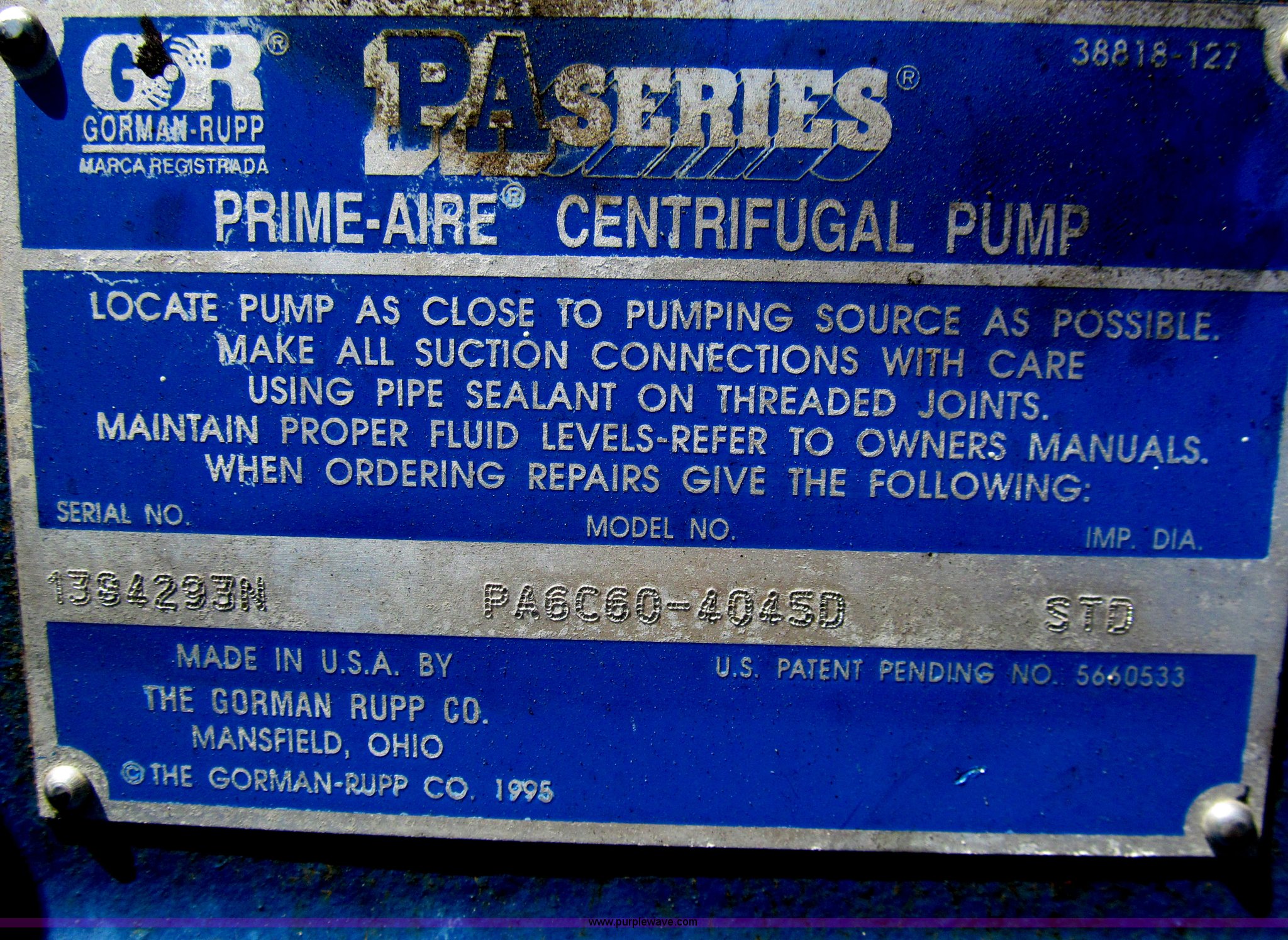 2007 Gorman Rupp 6" trash pump. Model PA6C60-4045D, 2,015 hours on meter, John Deere four cylinder diesel engine, Pintle hitch, ST225/75R15 tires, Serial 1384293N, EIN 732361RA. View item removal requirement and like-kind exchange information. United Rentals - St. Rose. 10385 Airline Hwy. St. Rose, LA 70087