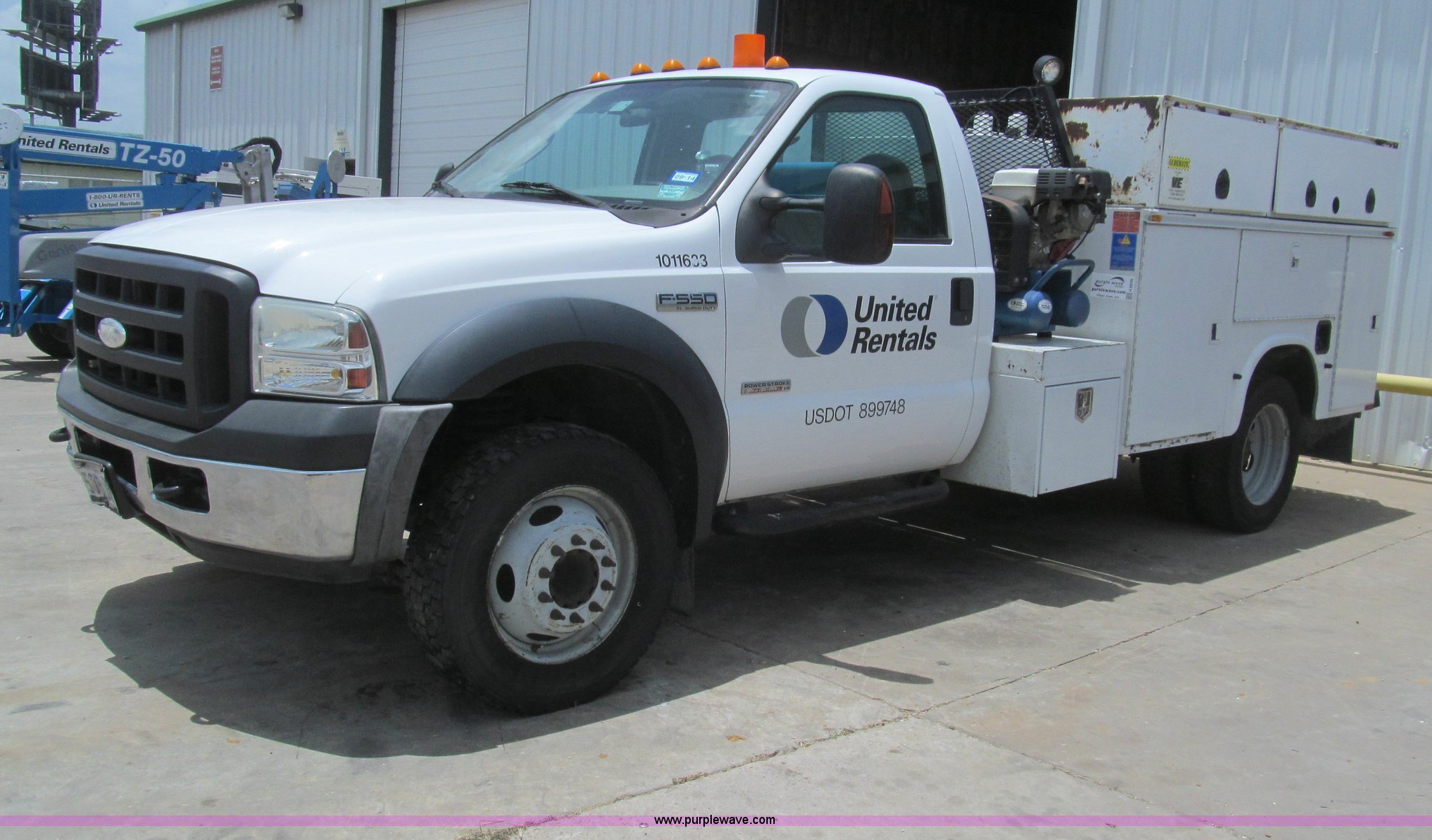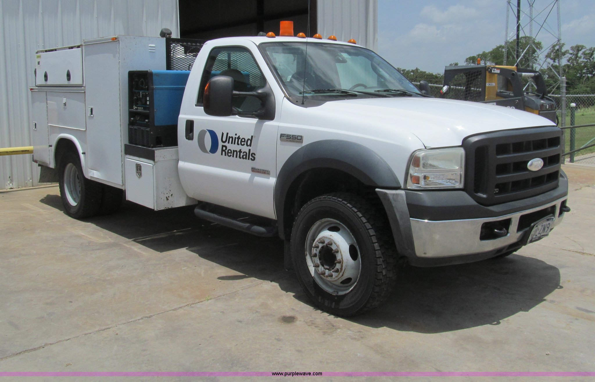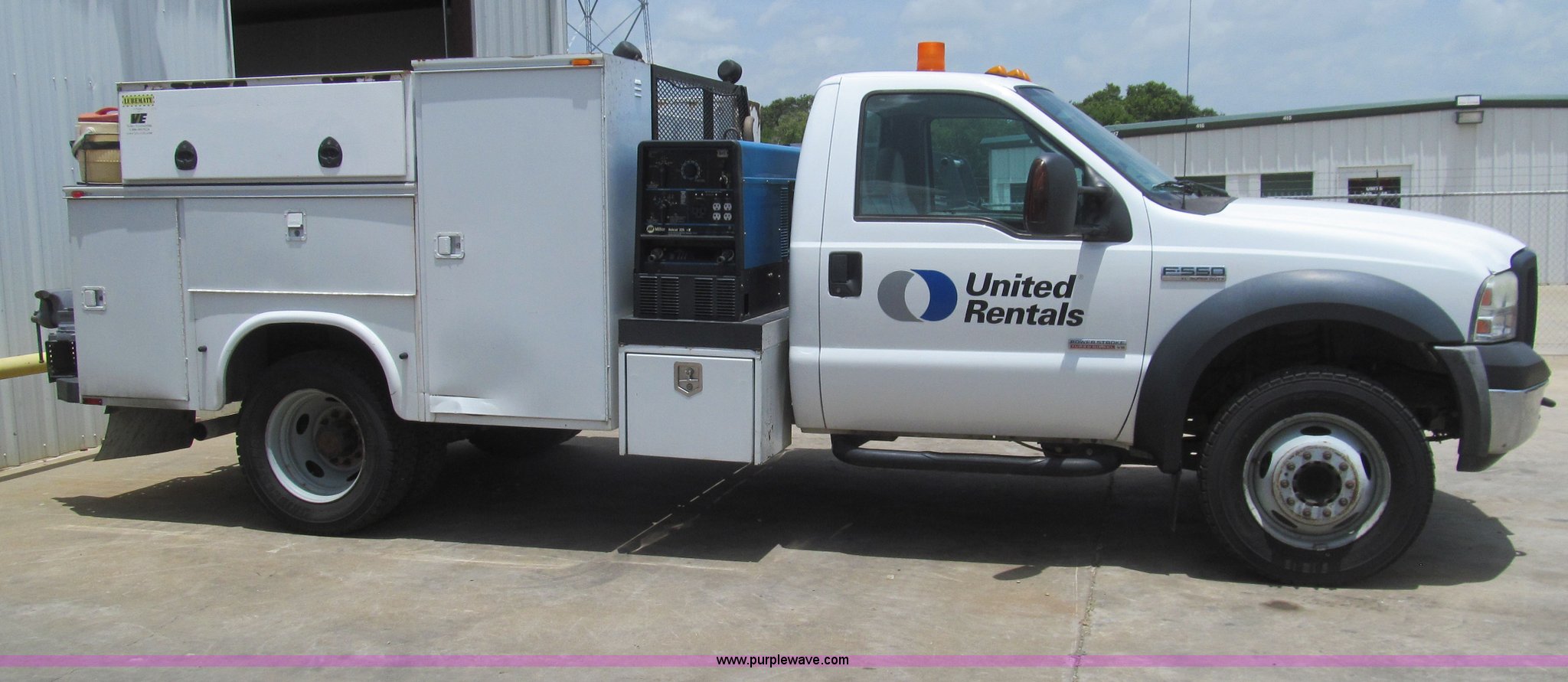 2007 Ford F550 Super Duty XL service truck. 188,256 miles on odometer, 6.0L V8 OHV 32V turbo diesel engine, Automatic transmission, AC and heat, Tilt, Cruise, AM/FM/CD, Power windows, locks, and mirrors, Vinyl interior, Auxiliary switches, Knapheide utility bed 9'L, Toolboxes, Rhino spray-in bed liner, Vice, Work lights, Puma 150 psi air compressor Honda 8 HP gas engine, Reel, hose, and nozzle assembly, Graco oil, lube, and grease system Recovery reservoirs, Mini Fire-ball pumps, Husky 1040 diaphram pump, Reelcraft hose, reel, and nozzle assembly, Miller Bobcat 225 welder/generator 155 hours on meter, Kohler 12.75 HP gas engine, 10,000 watt generator, CC/CV, AC/DC welder, Running boards, Front tow hooks, Front auxiliary outlet, Receiver hitch, 245/70R19.5 tires, Two injectors recently replaced, EIN 1011633. View item removal requirement and like-kind exchange information. 1FDAF56P97EB39024. United Rentals - Brenham. 2700 W Highway 290. Brenham, TX 77833