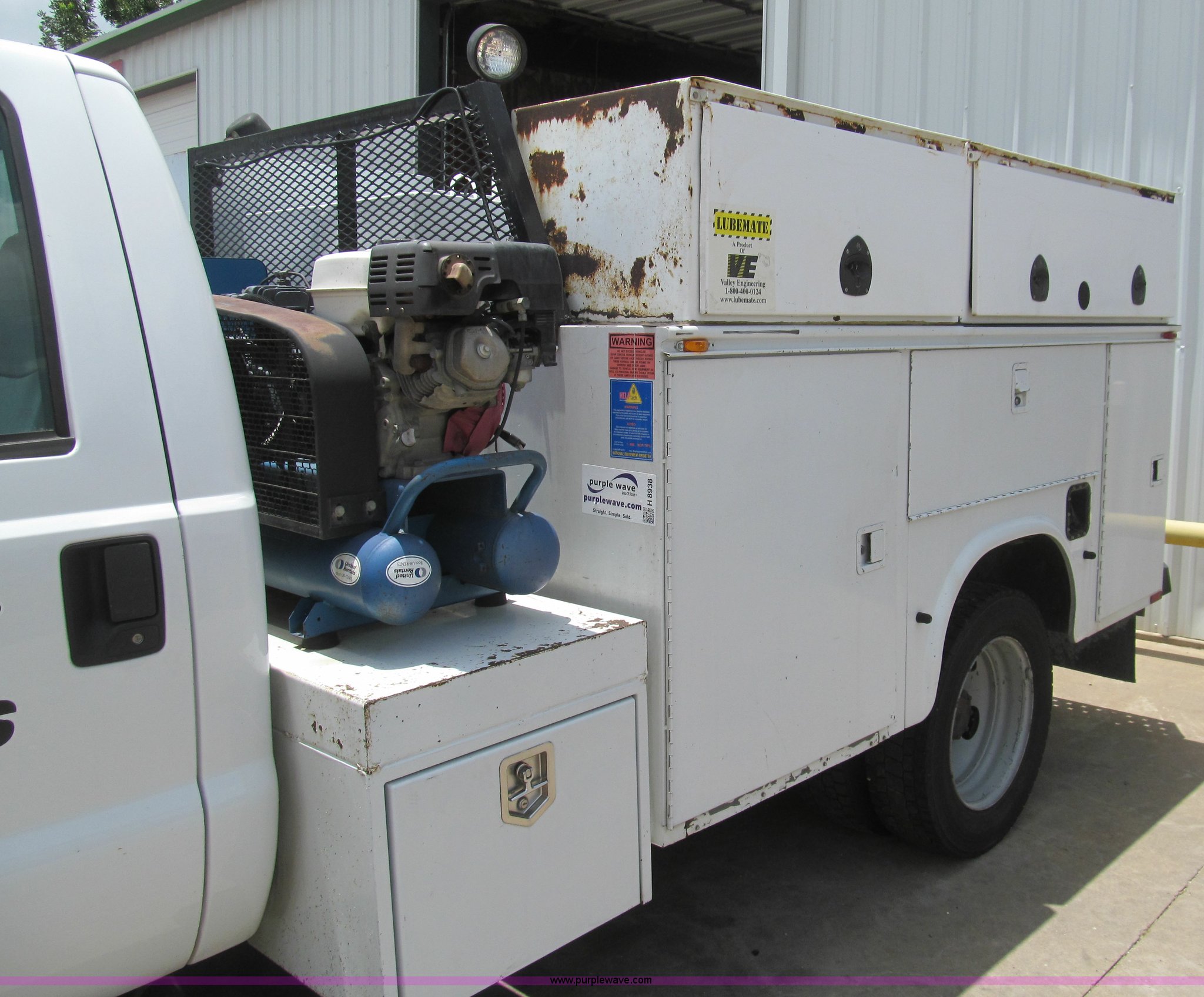 Purple Wave is selling a used Service Truck in Texas. This item is a 2007 Ford F550 Super Duty XL service truck with the following: 188,256 miles on odometer, 6.0L V8 OHV 32V turbo diesel engine, Automatic transmission, AC and heat, Tilt, Cruise, AM/FM/CD, Power windows, locks, and mirrors, Vinyl interior, Auxiliary switches, Knapheide utility bed, 9'L, Toolboxes, Rhino spray-in bed liner, Vice, Work lights, Puma 150 psi air compressor, Honda 8 HP gas engine, Reel, hose, and nozzle assembly, Graco oil, lube, and grease system, Recovery reservoirs, Mini Fire-ball pumps, Husky 1040 diaphram pump, Reelcraft hose, reel, and nozzle assembly, Miller Bobcat 225 welder/generator, 155 hours on meter, Kohler 12.75 HP gas engine, 10,000 watt generator, CC/CV, AC/DC welder, Running boards, Front tow hooks, Front auxiliary outlet, Receiver hitch, 245/70R19.5 tires, Two injectors recently replaced, EIN 1011633