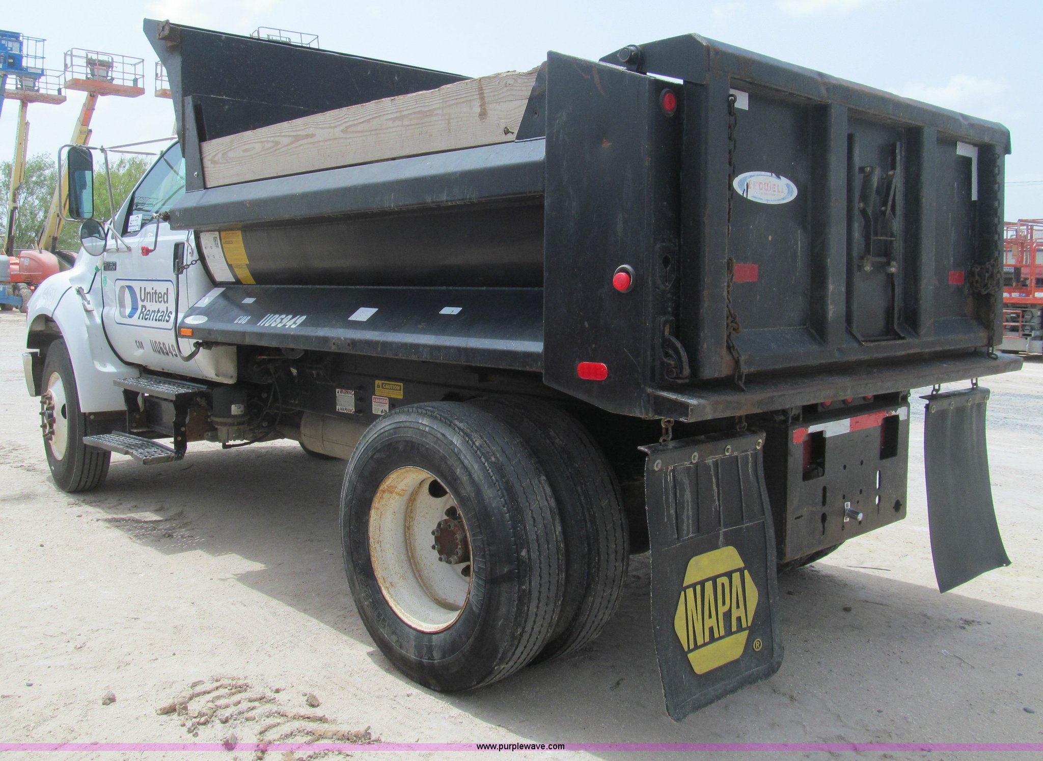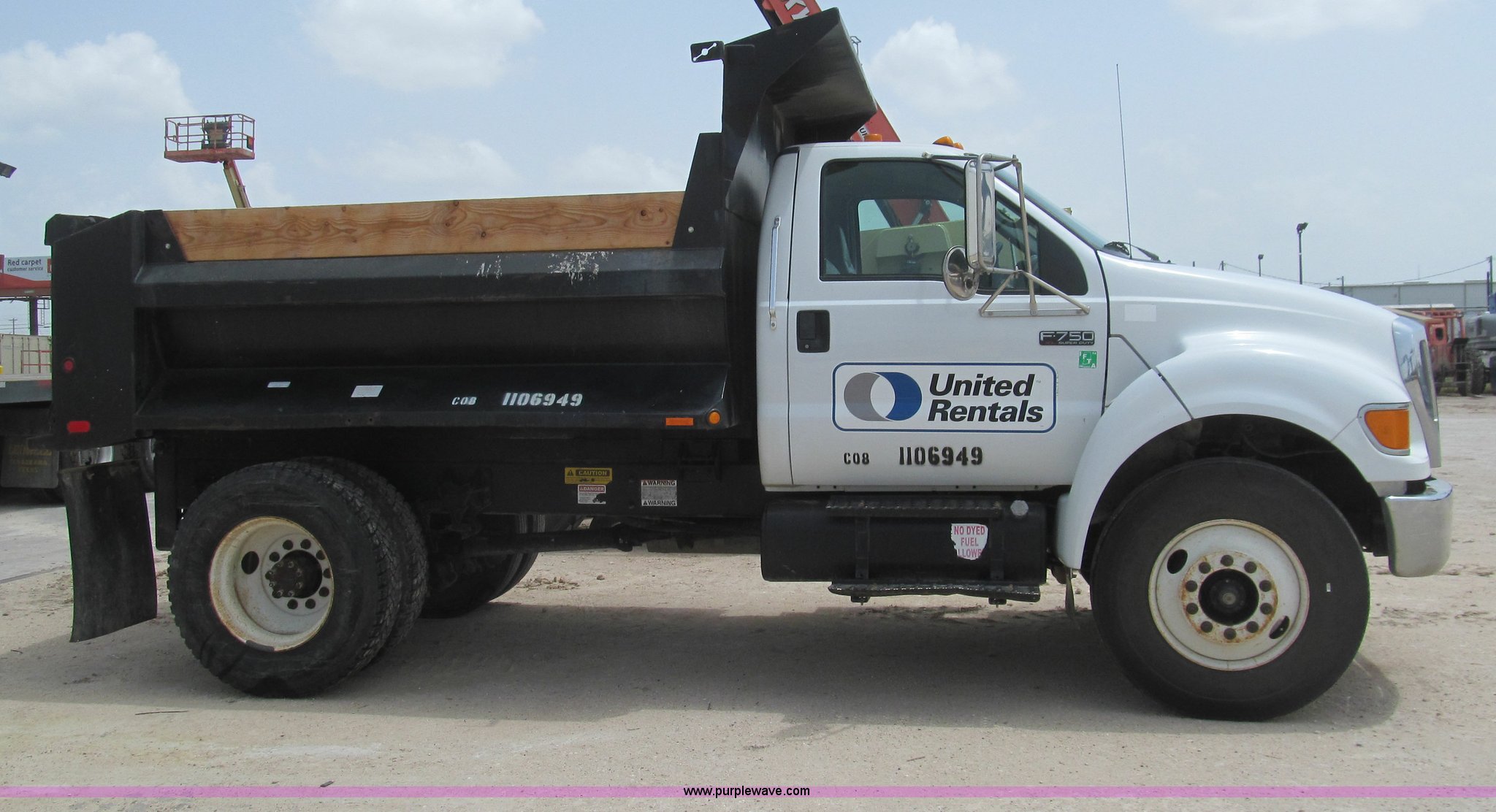 2007 Ford F750 Super Duty XL dump truck. 19,327 actual miles, Cummins ISB 5.9L L6 diesel engine, Six speed manual transmission, AC and heat, Cruise, AM/FM, Chelsea PTO, Ledwell LW5/6TD dump bed 10'L x 8'W, 3'H sideboards, Air operated end gate, Class B, Five cubic yard capacity, 45 gallon fuel tank, Chrome bumper, Spring suspension, Air brakes, 158" wheelbase, 11R22.5 tires, GVWR 33,000 lbs, FAWR 12,000 lbs, RAWR 21,000 lbs, Engine issues Rod bearing spun, EIN 1106949. View item removal requirement and like-kind exchange information. 3FRXF75E07V509570. United Rentals - Pharr. 3925 North Cage Blvd. Pharr, TX 78577