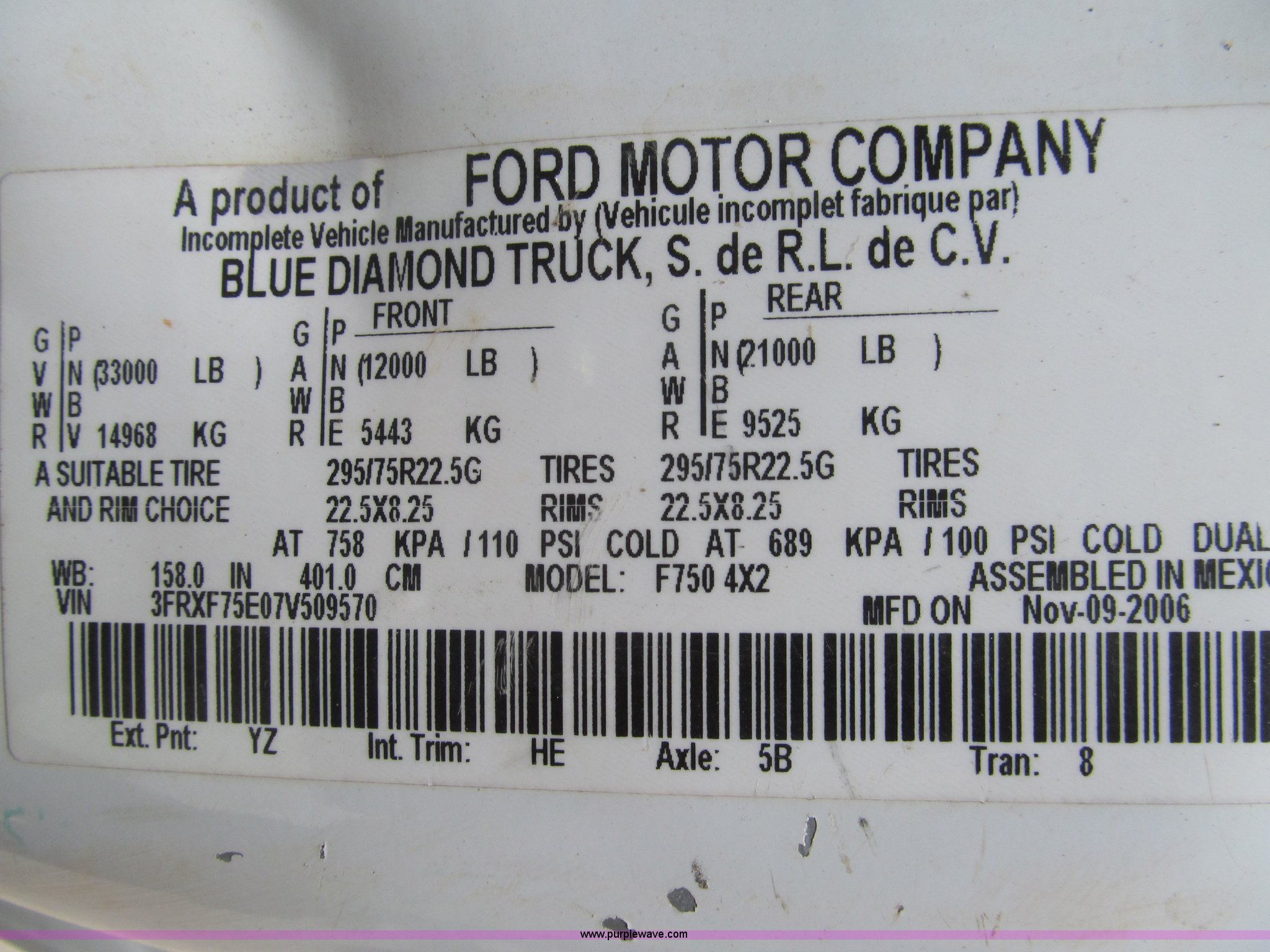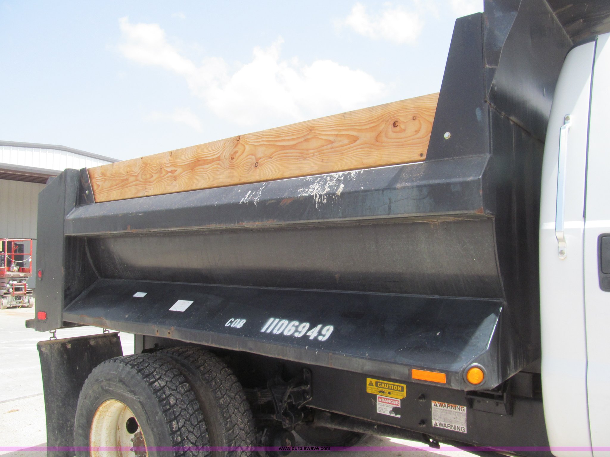 Purple Wave is selling a used Construction Dump Truck in Texas. This item is a 2007 Ford F750 Super Duty XL dump truck with the following: 19,327 actual miles, Cummins ISB 5.9L L6 diesel engine, Six speed manual transmission, AC and heat, Cruise, AM/FM, Chelsea PTO, Ledwell LW5/6TD dump bed, 10'L x 8'W, 3'H sideboards, Air operated end gate, Class B, Five cubic yard capacity, 45 gallon fuel tank, Chrome bumper, Spring suspension, Air brakes, 158" wheelbase, 11R22.5 tires, GVWR 33,000 lbs, FAWR 12,000 lbs, RAWR 21,000 lbs, Engine issues, Rod bearing spun, EIN 1106949