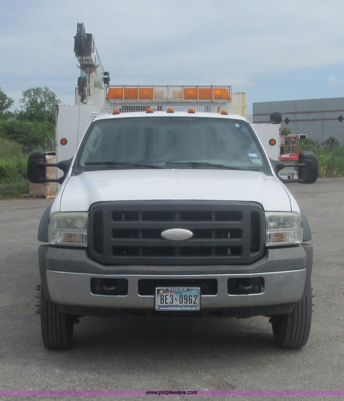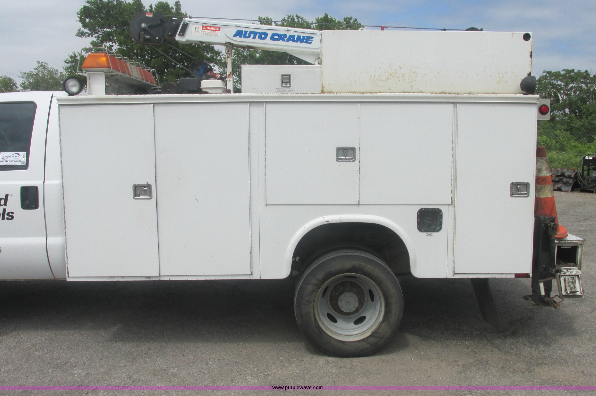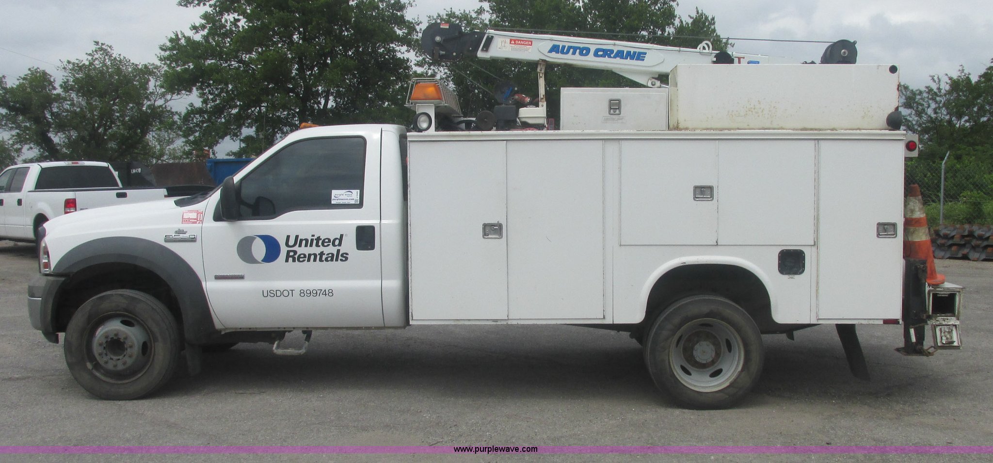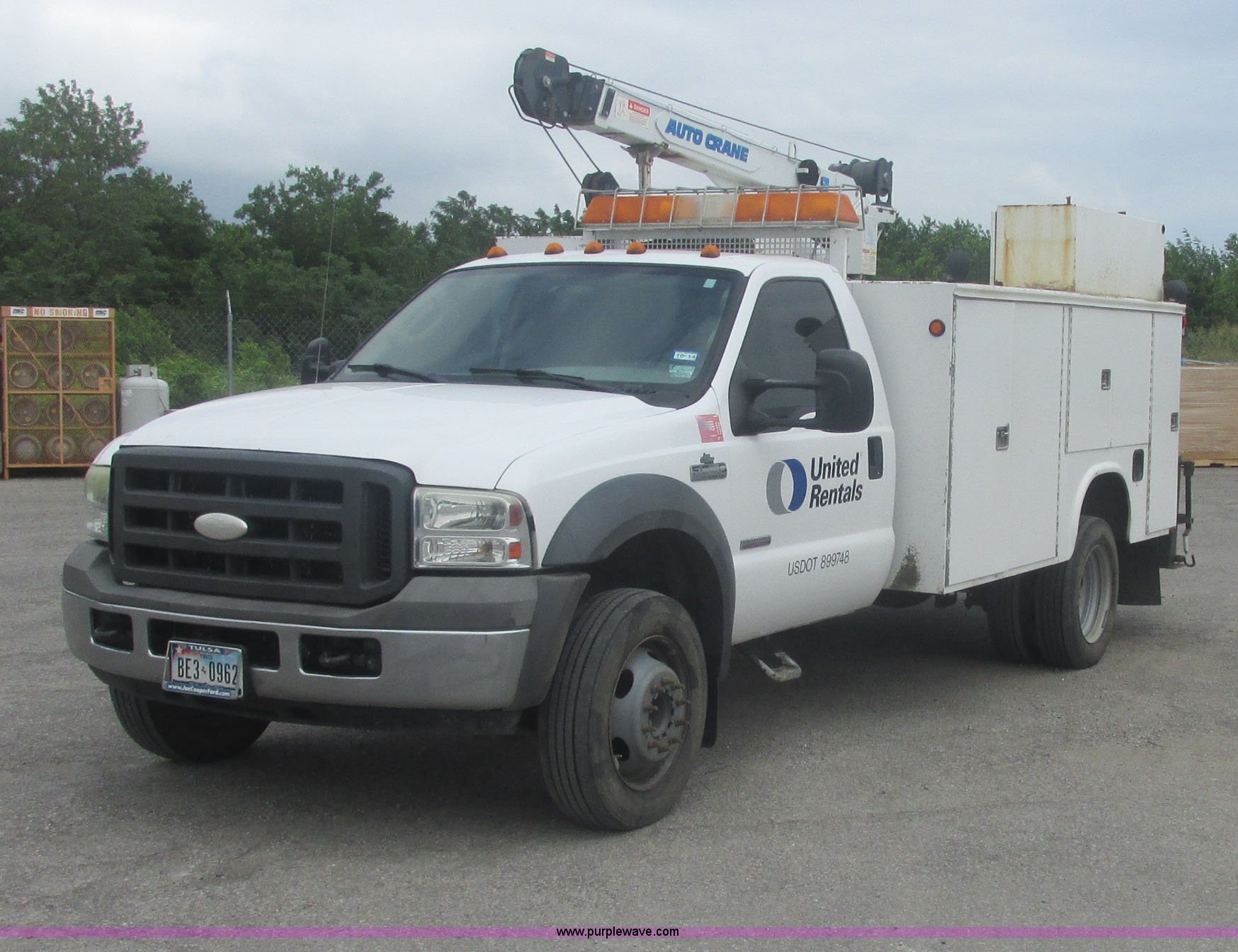 Purple Wave is selling a used Service Truck in Oklahoma. This item is a 2005 Ford F550 Super Duty XL service truck with crane with the following: 234,663 actual miles, 6.0L V8 OHV 32V turbo diesel engine, Automatic transmission, AC and heat, Cruise, AM/FM/CD, Manual windows and locks, Cloth interior, Auto Crane 60065H crane, Rear stabilizer jacks, Manchester 6105-1HCM3-3 air compressor, Hose, Serial D004407, Top mounted lights, 600 watt power converter, Backup alarm, Receiver hitch, P225/70R19.5 tires, EIN 535155RA
