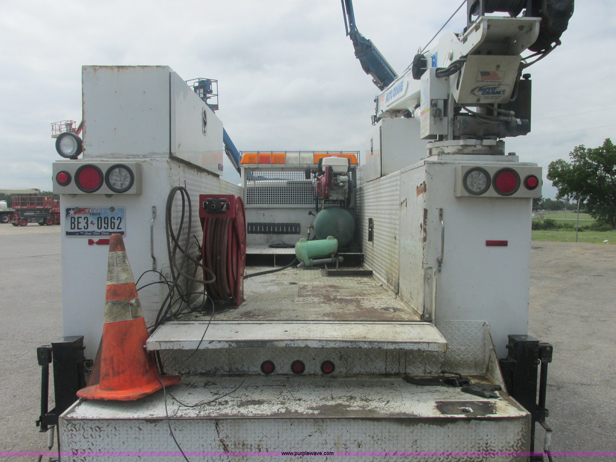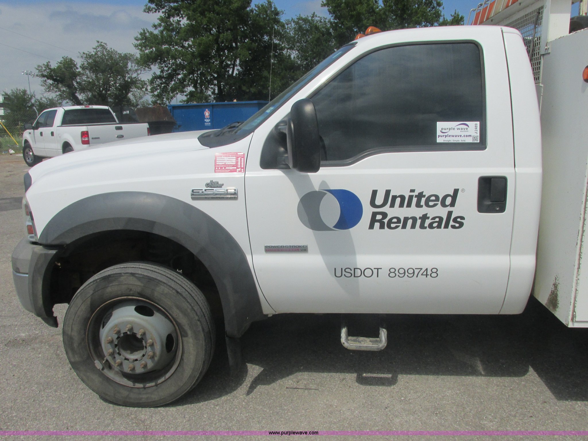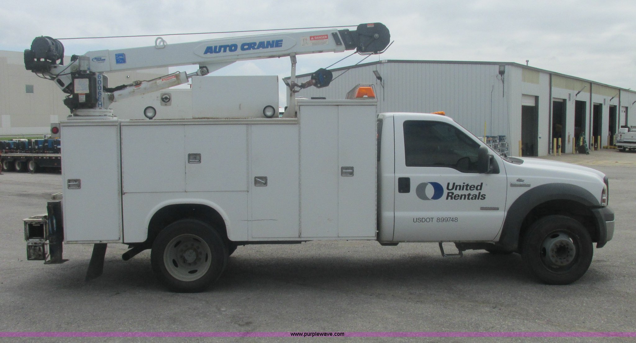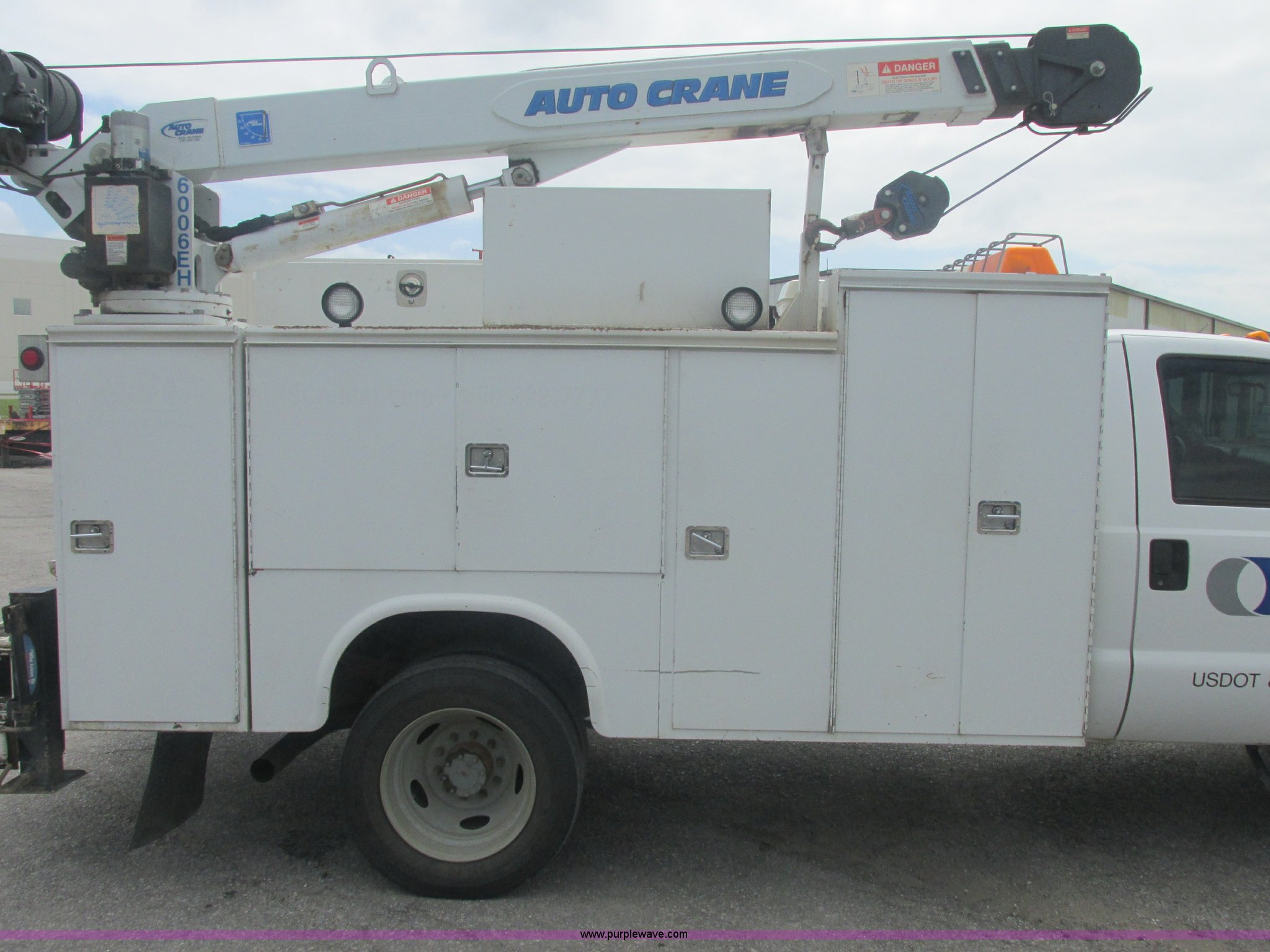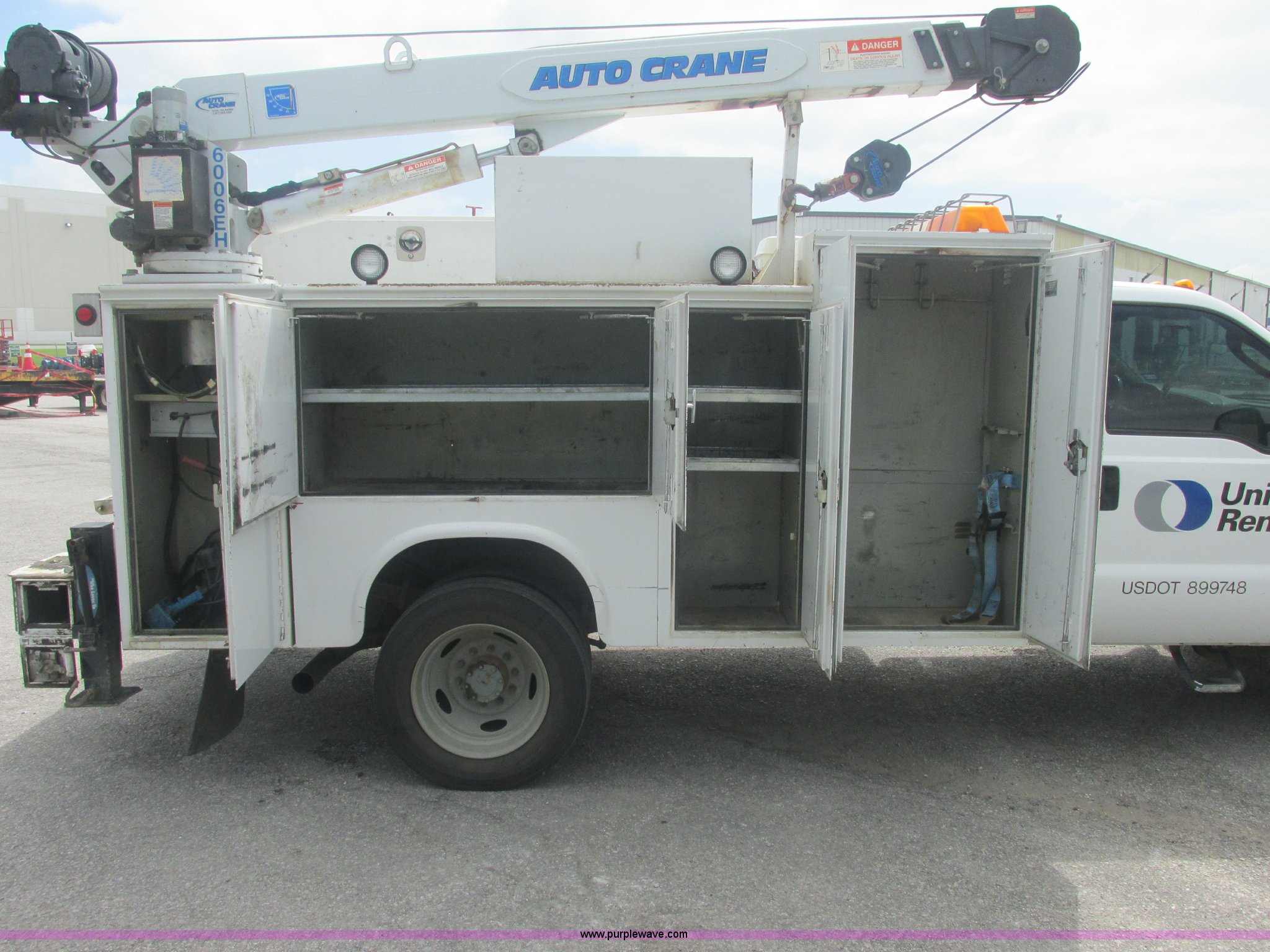 Purple Wave is selling a used Service Truck in Oklahoma. This item is a 2005 Ford F550 Super Duty XL service truck with crane with the following: 234,663 actual miles, 6.0L V8 OHV 32V turbo diesel engine, Automatic transmission, AC and heat, Cruise, AM/FM/CD, Manual windows and locks, Cloth interior, Auto Crane 60065H crane, Rear stabilizer jacks, Manchester 6105-1HCM3-3 air compressor, Hose, Serial D004407, Top mounted lights, 600 watt power converter, Backup alarm, Receiver hitch, P225/70R19.5 tires, EIN 535155RA