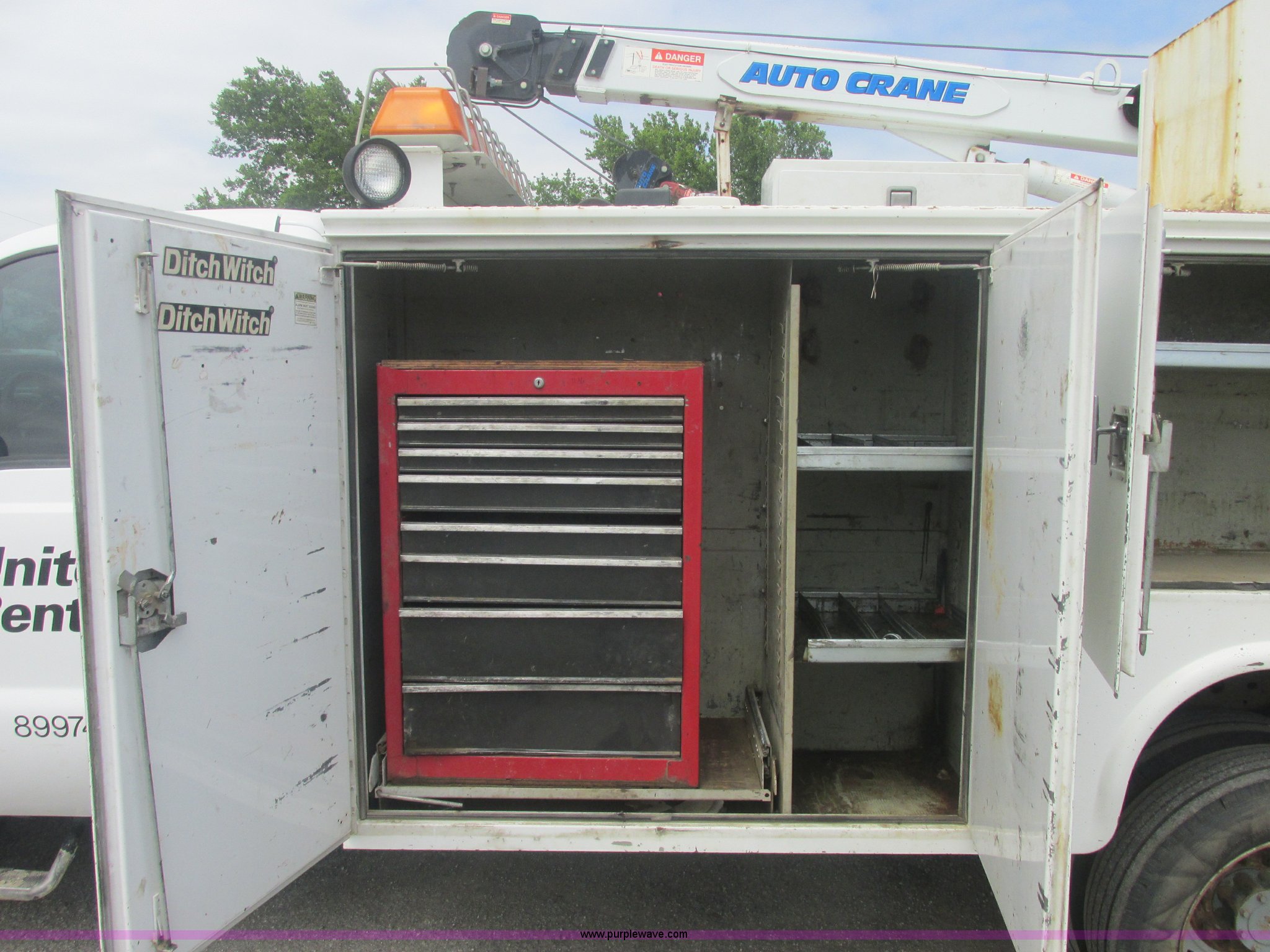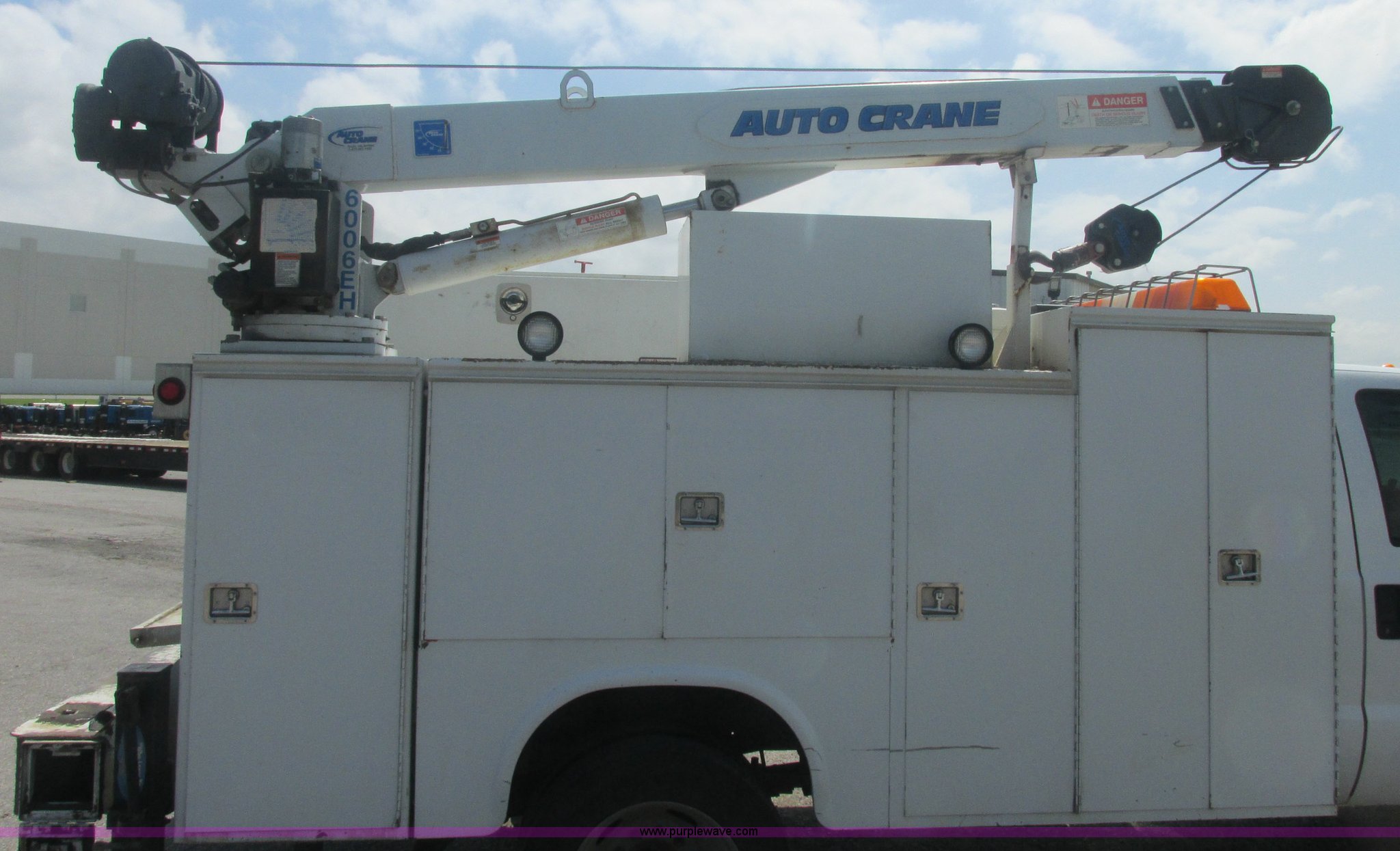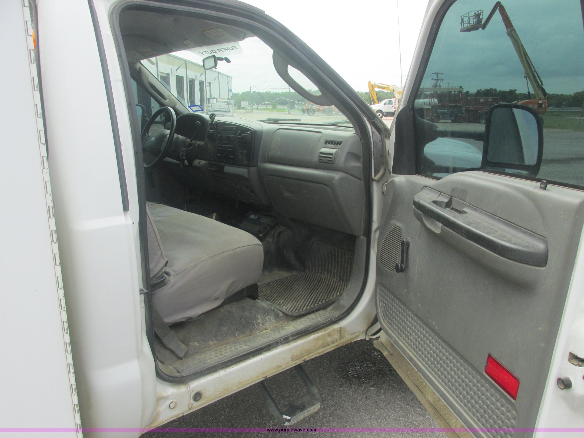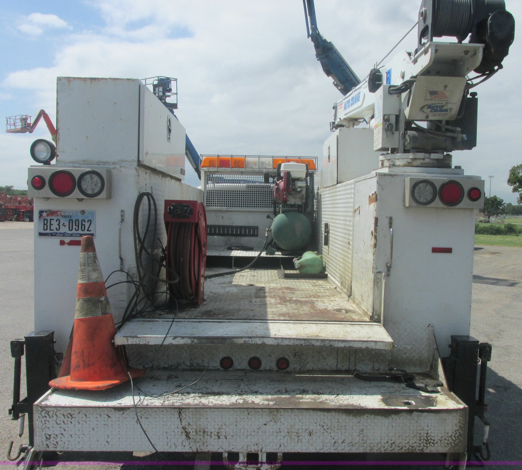 Purple Wave is selling a used Service Truck in Oklahoma. This item is a 2005 Ford F550 Super Duty XL service truck with crane with the following: 234,663 actual miles, 6.0L V8 OHV 32V turbo diesel engine, Automatic transmission, AC and heat, Cruise, AM/FM/CD, Manual windows and locks, Cloth interior, Auto Crane 60065H crane, Rear stabilizer jacks, Manchester 6105-1HCM3-3 air compressor, Hose, Serial D004407, Top mounted lights, 600 watt power converter, Backup alarm, Receiver hitch, P225/70R19.5 tires, EIN 535155RA