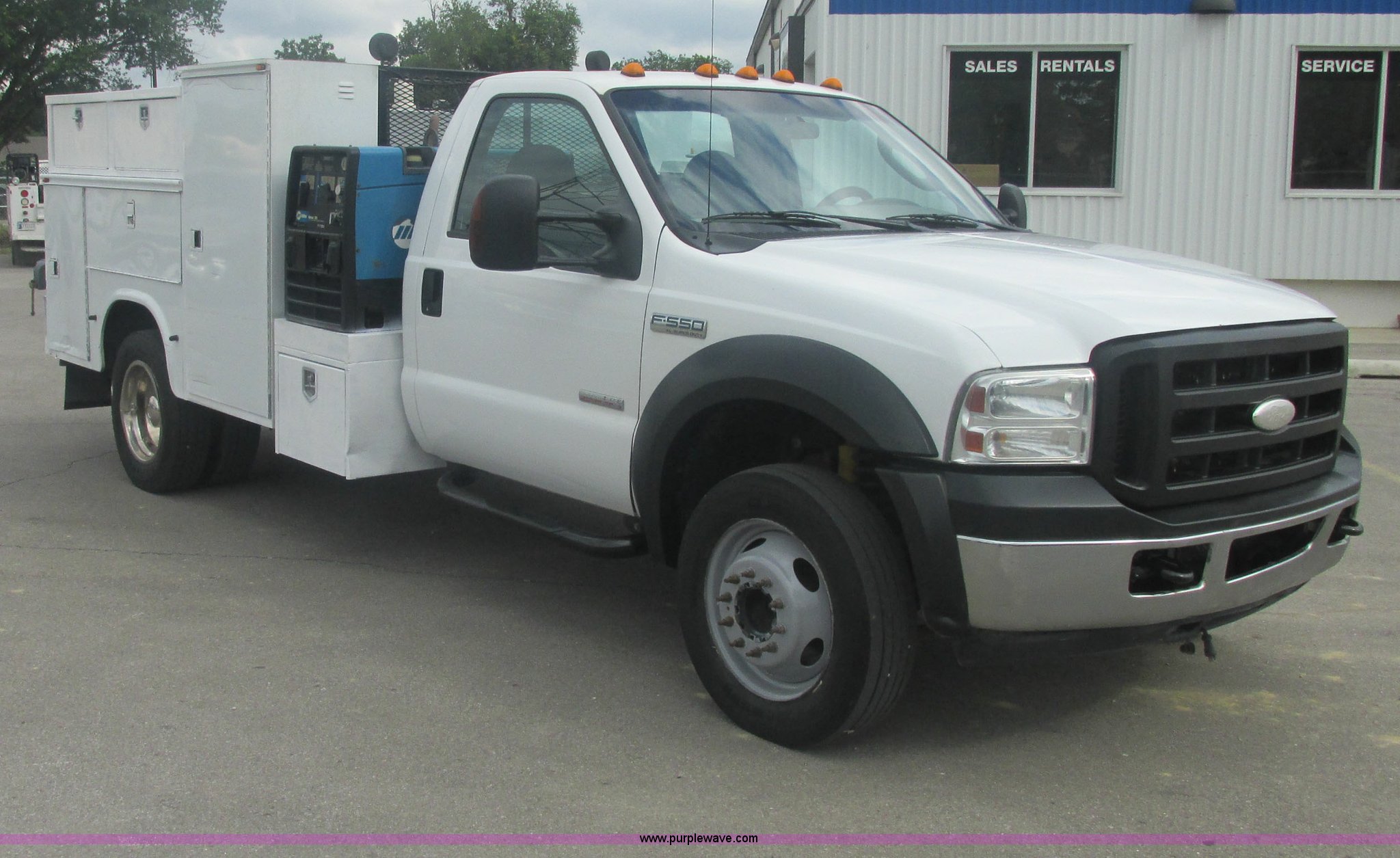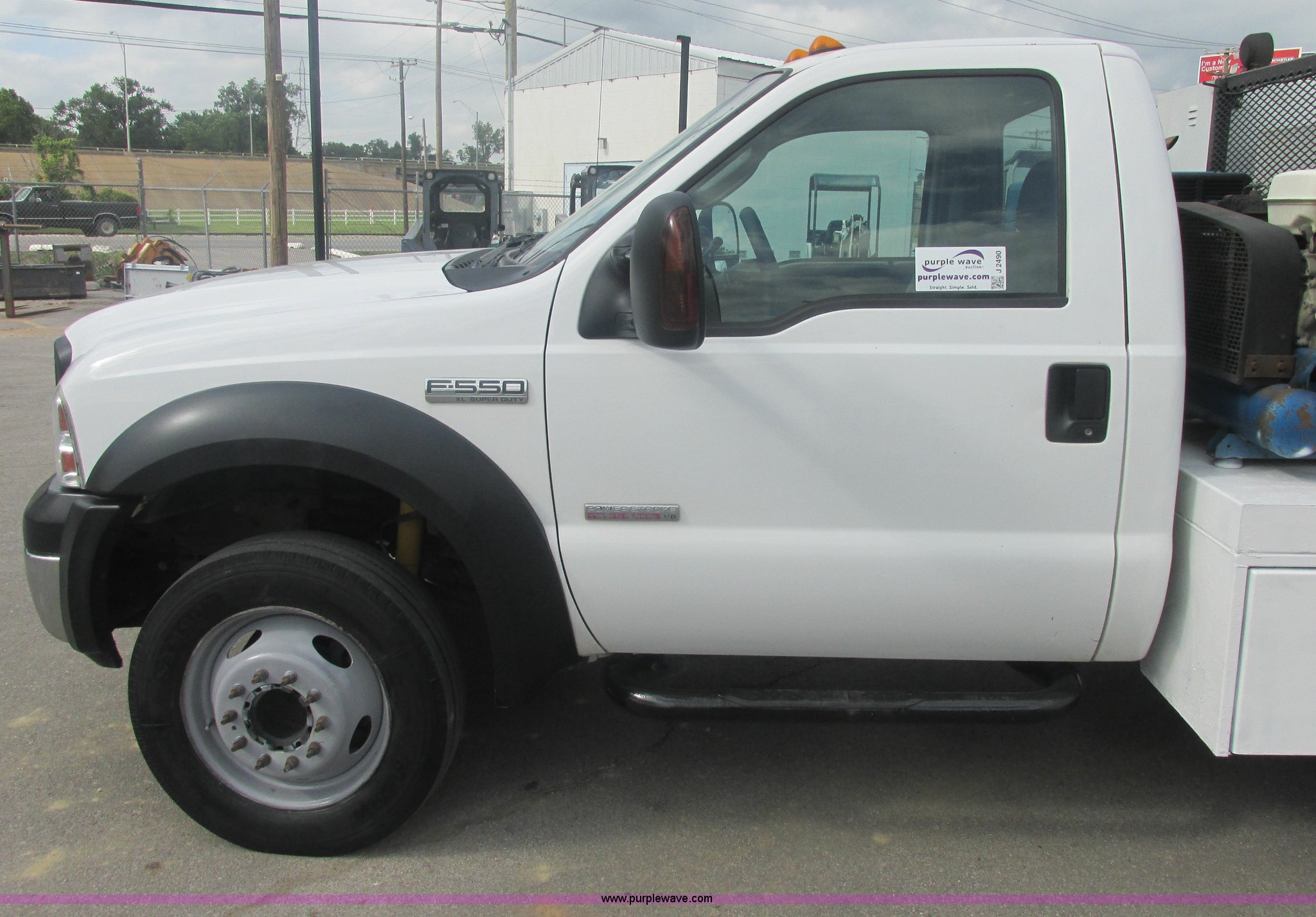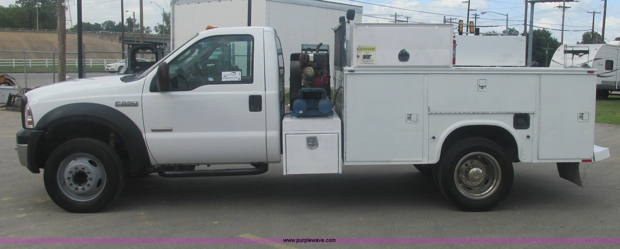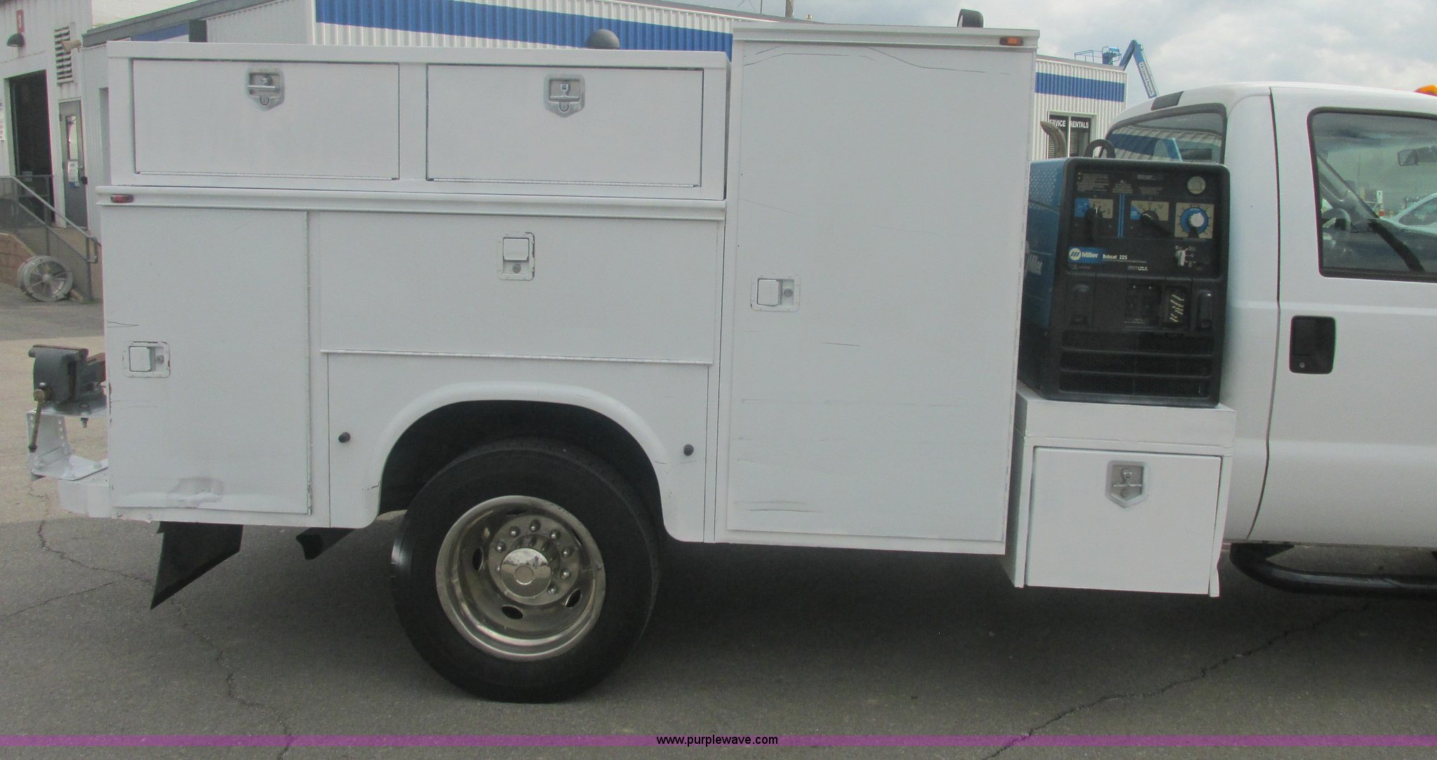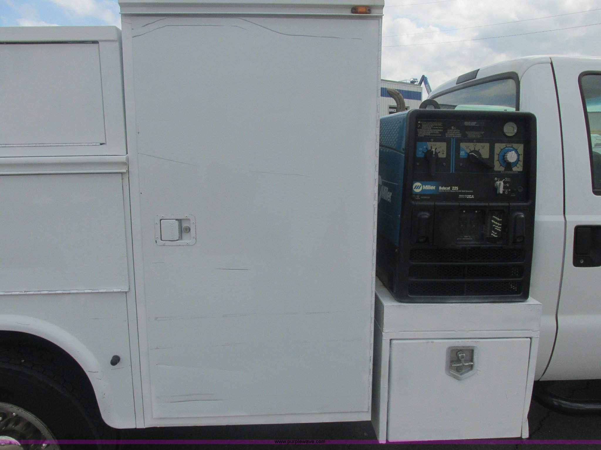 Purple Wave is selling a used Service Truck in Oklahoma. This item is a 2007 Ford F550 Super Duty XL service truck with the following: 220,451 actual miles, 6.0L V8 OHV 32V turbo diesel engine, Automatic transmission, AC and heat, Tilt, Cruise, AM/FM, Power windows, locks, and mirrors, Cloth interior, Knapheide 610805460J utility bed, Serial 20070822-0084609, Rear mounted vice, Honda GX240 8 HP air compressor, Miller Bobcat 225 welder/generator, CC/CV, AC/DC welder, 10,000 watt generator, Stock No. 907209, Battery dead, Hydraulic oil reservoir, Oil reservoir, 25 gallon waste tank, 225/70R19.5 tires, Injectors replaced eight months ago, EIN 1016956