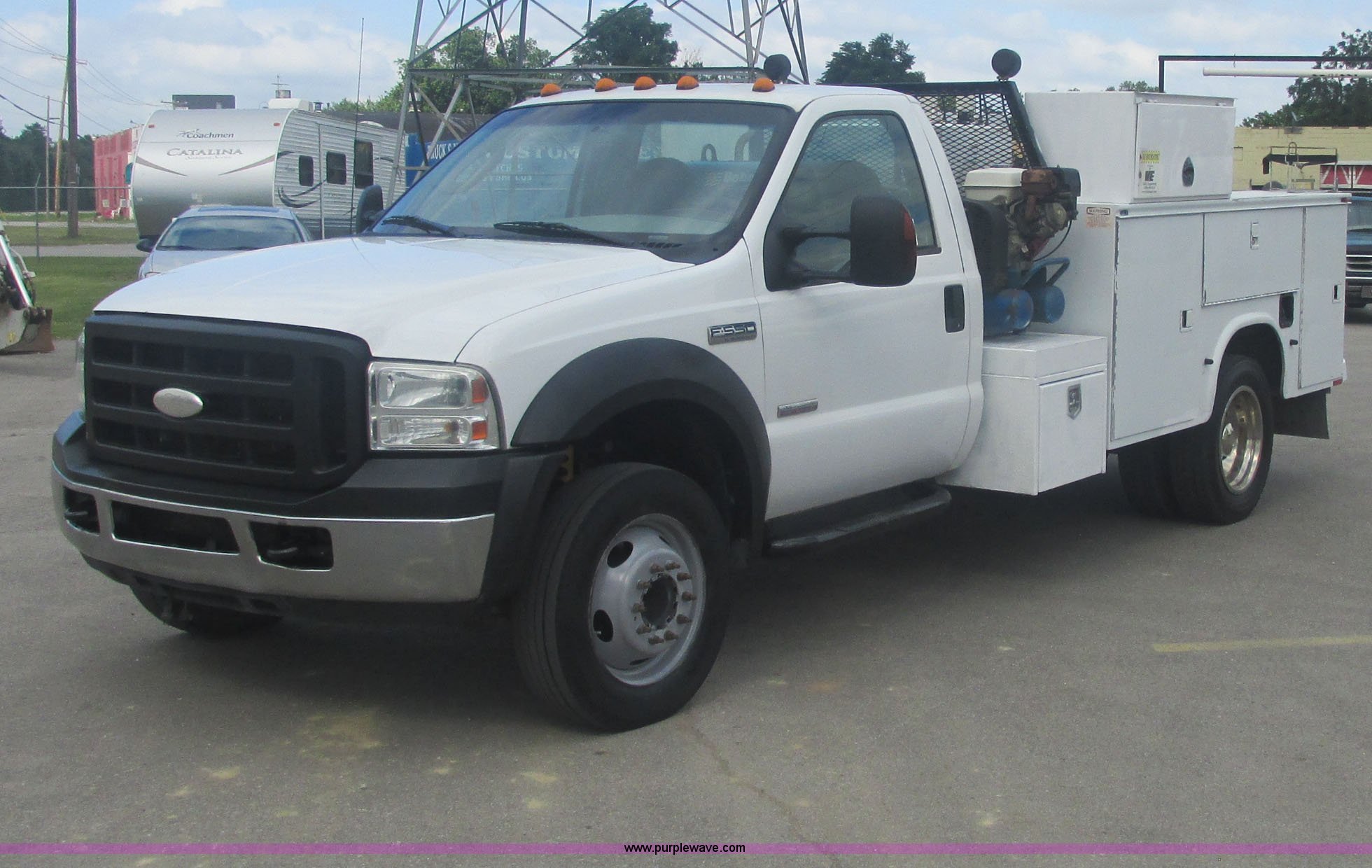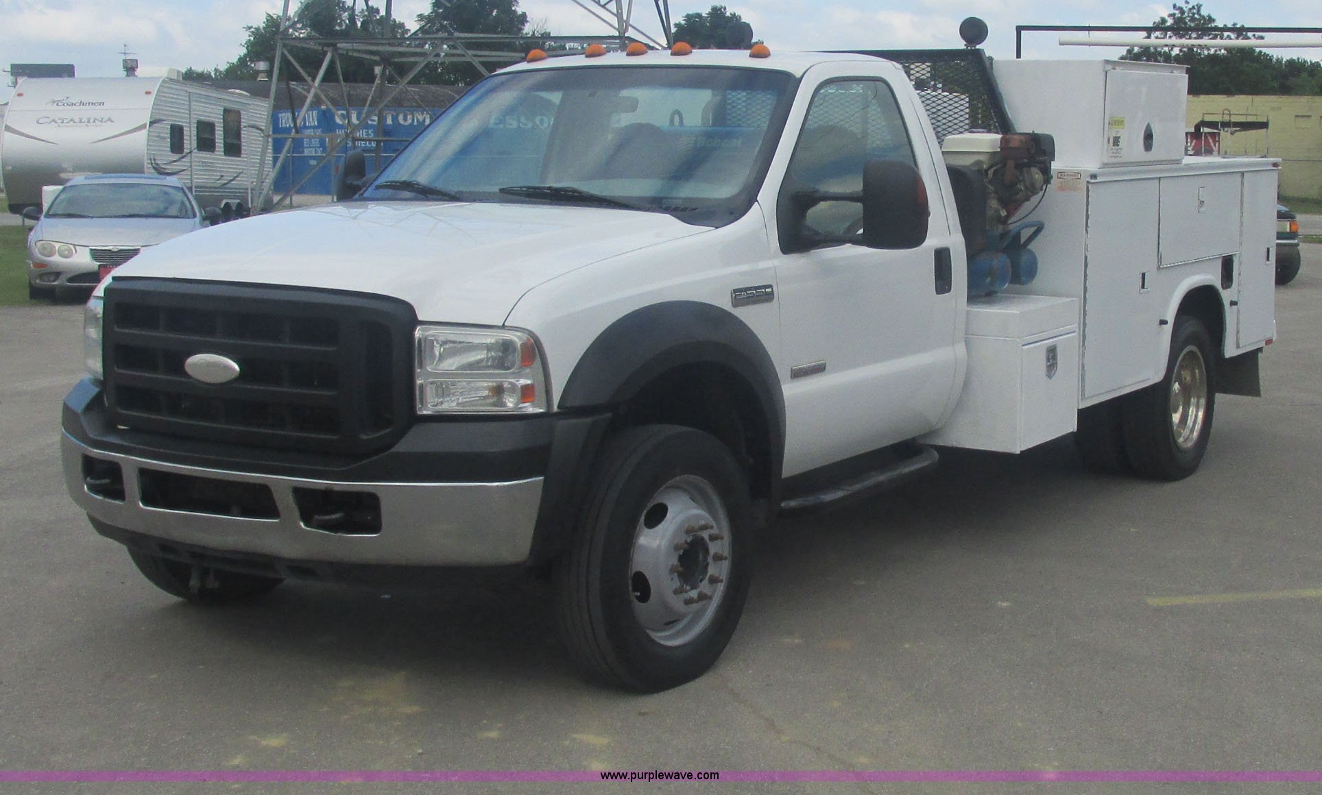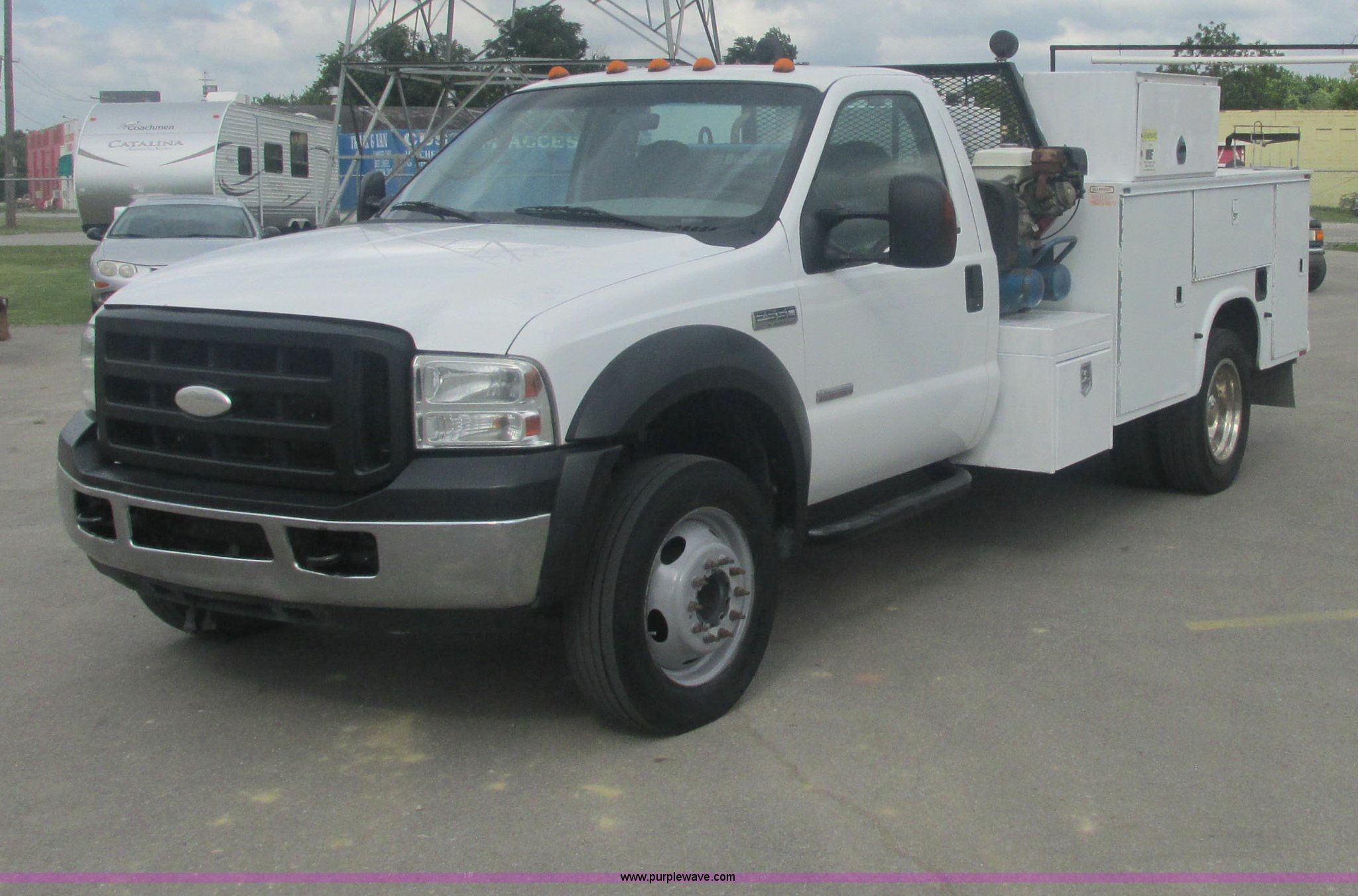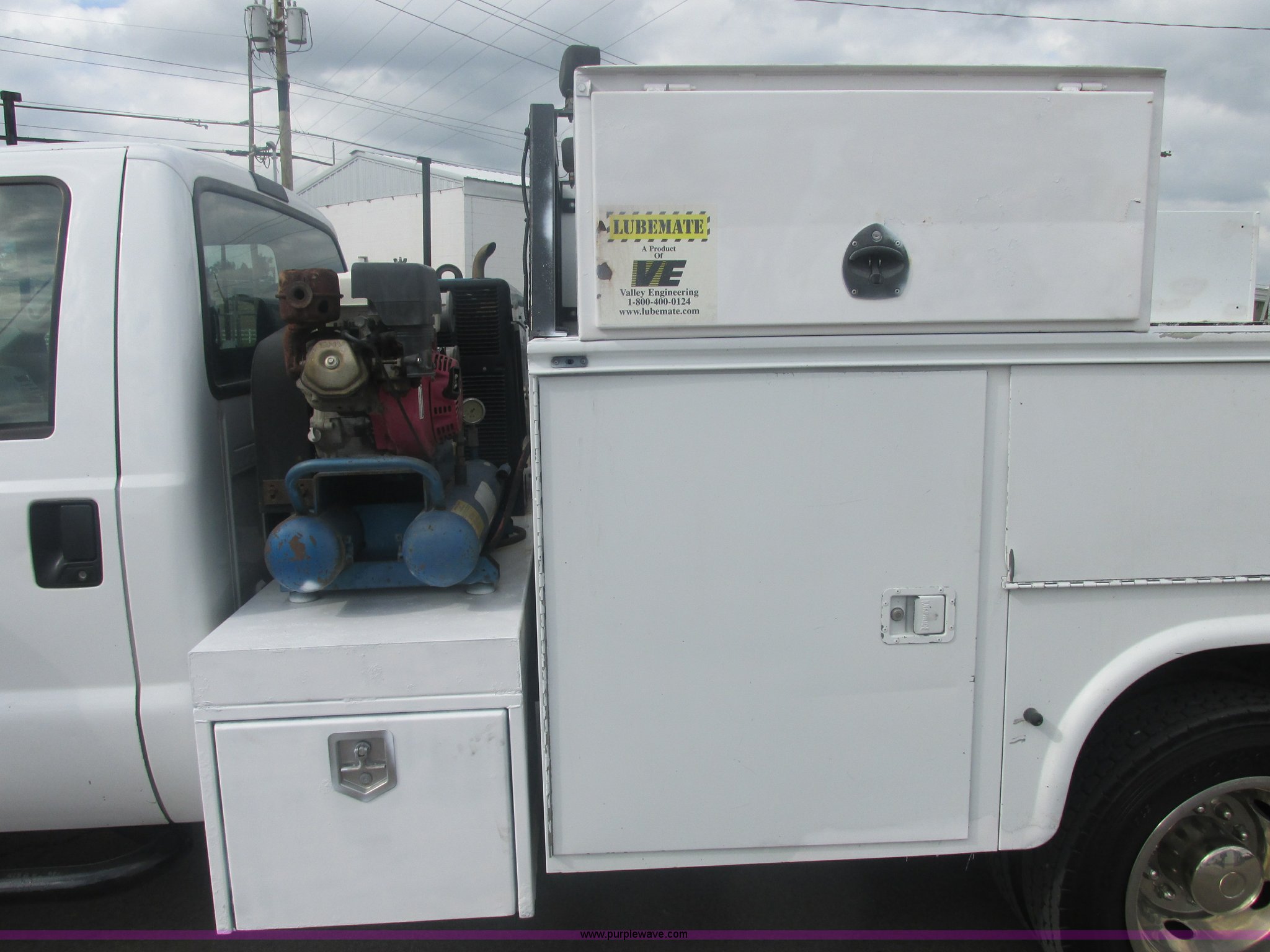 Purple Wave is selling a used Service Truck in Oklahoma. This item is a 2007 Ford F550 Super Duty XL service truck with the following: 220,451 actual miles, 6.0L V8 OHV 32V turbo diesel engine, Automatic transmission, AC and heat, Tilt, Cruise, AM/FM, Power windows, locks, and mirrors, Cloth interior, Knapheide 610805460J utility bed, Serial 20070822-0084609, Rear mounted vice, Honda GX240 8 HP air compressor, Miller Bobcat 225 welder/generator, CC/CV, AC/DC welder, 10,000 watt generator, Stock No. 907209, Battery dead, Hydraulic oil reservoir, Oil reservoir, 25 gallon waste tank, 225/70R19.5 tires, Injectors replaced eight months ago, EIN 1016956