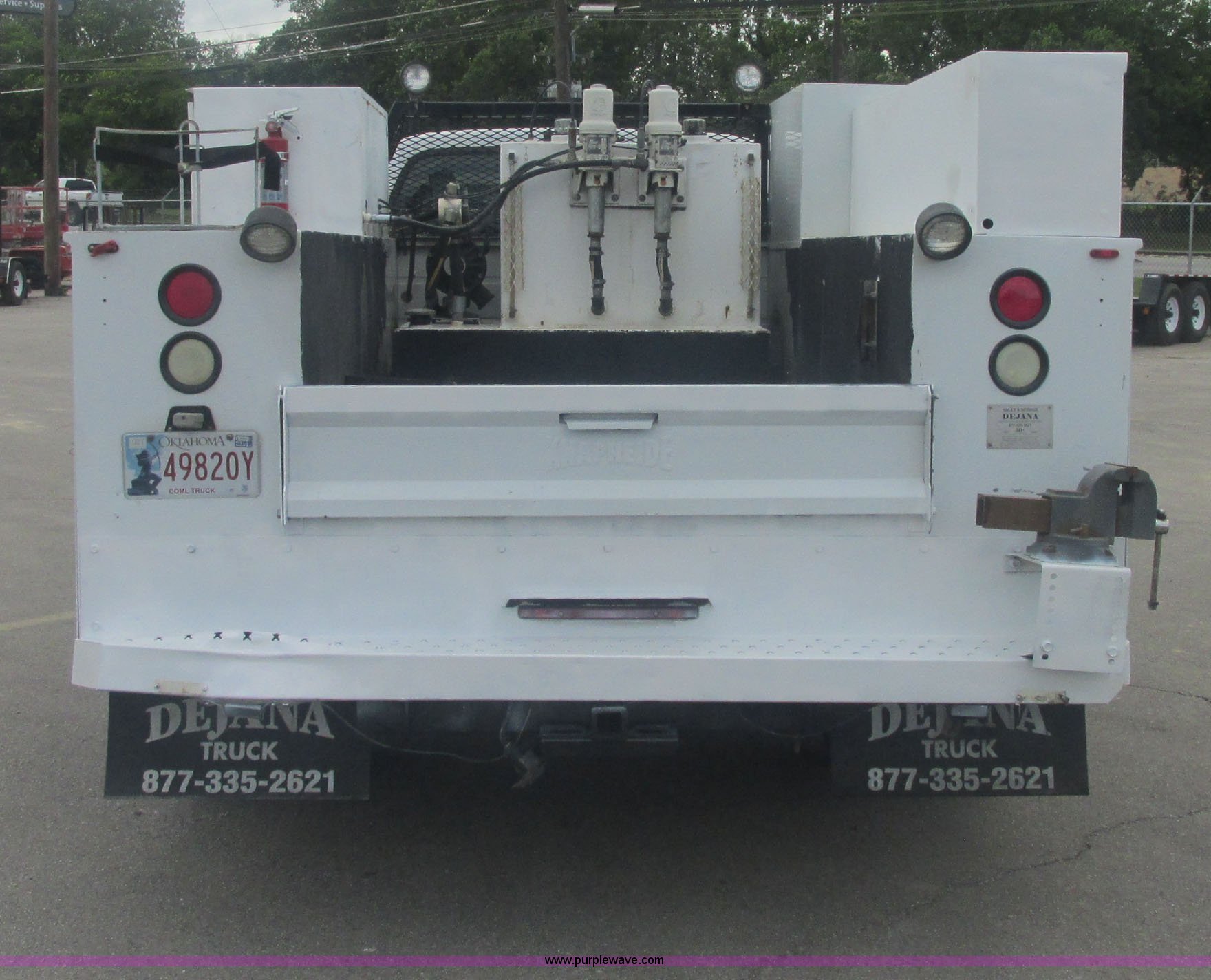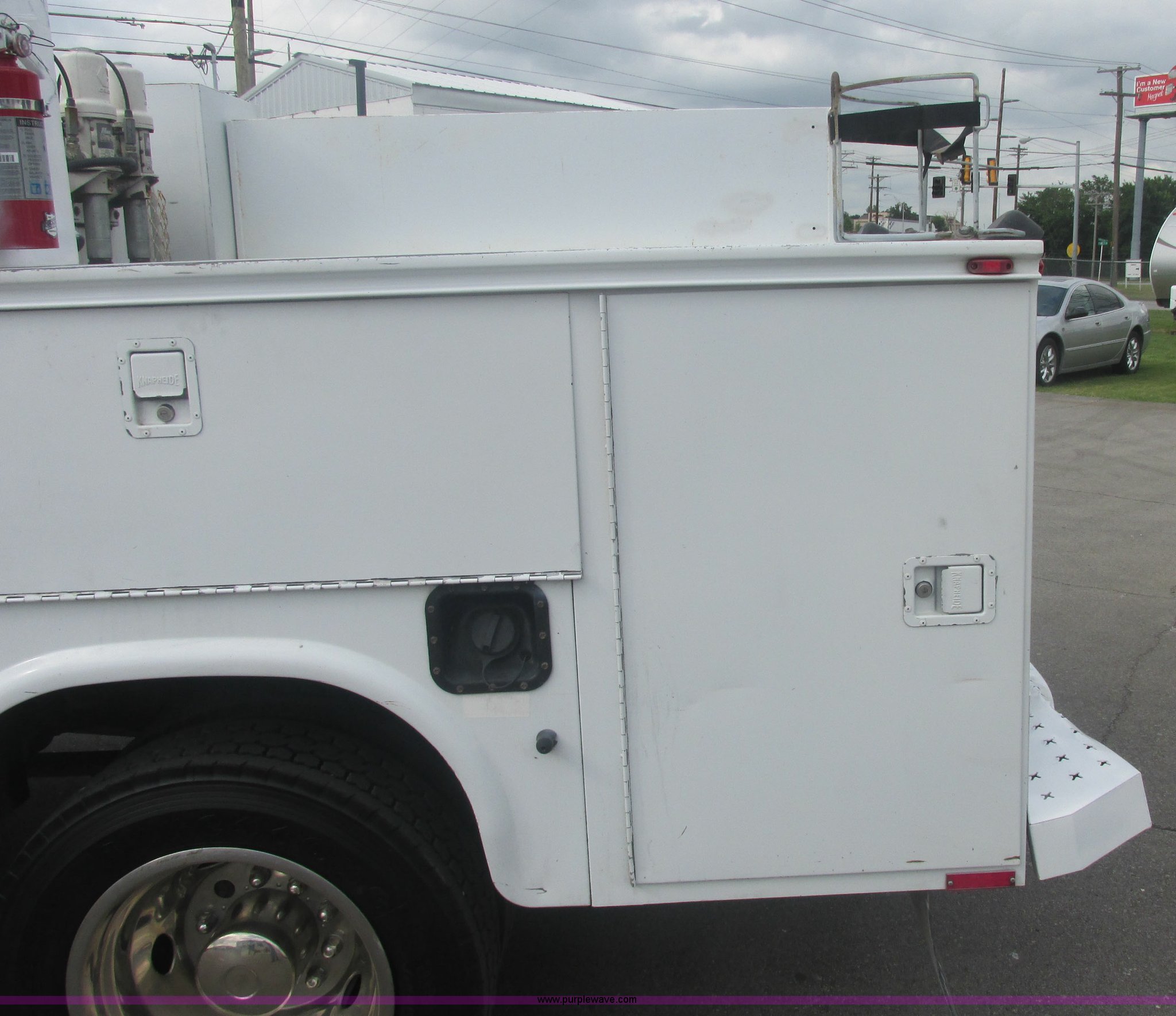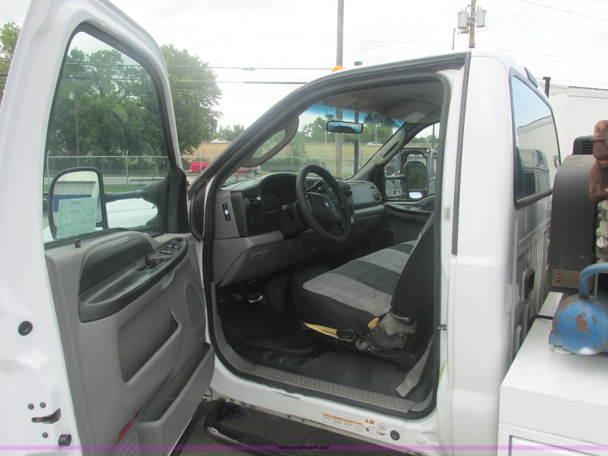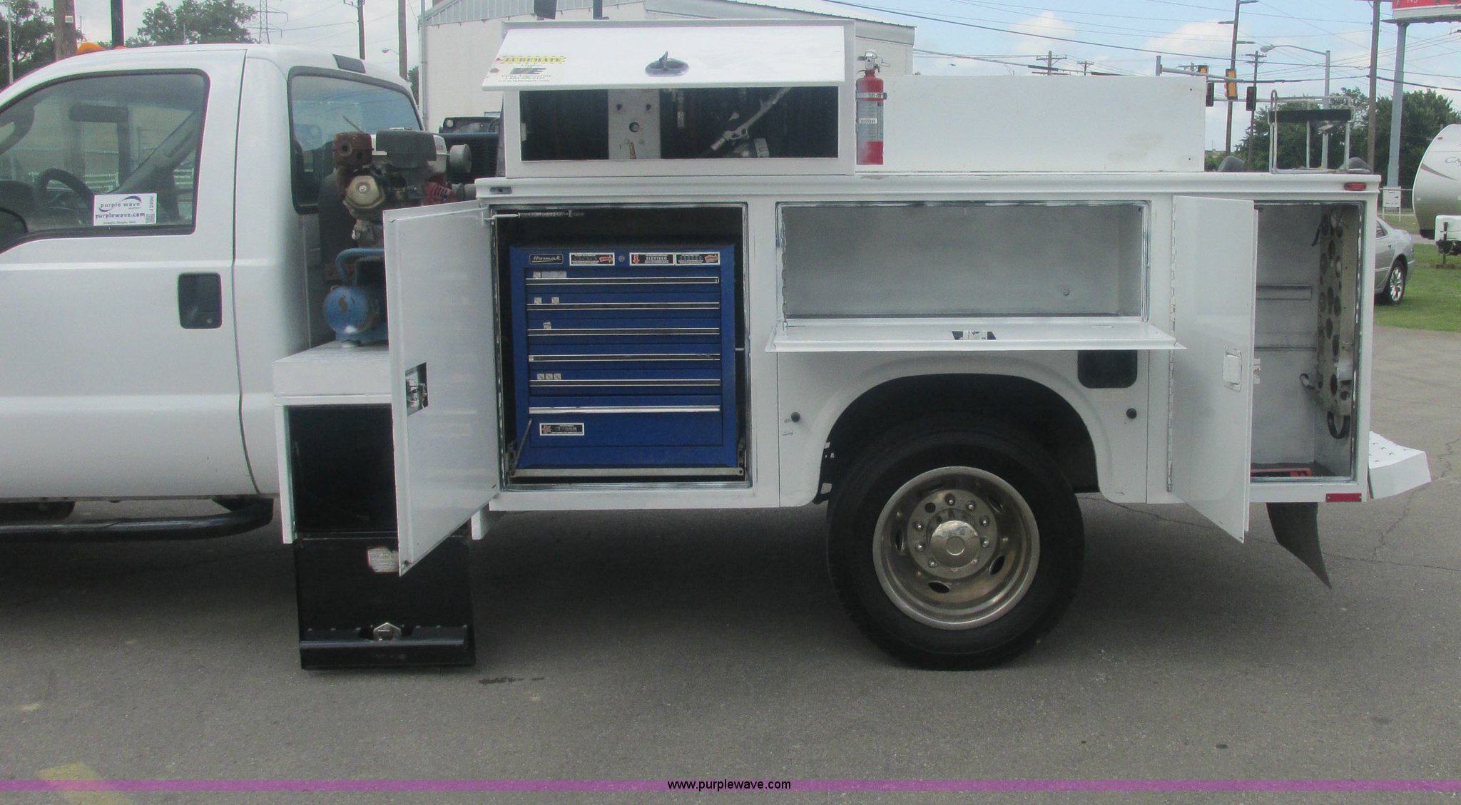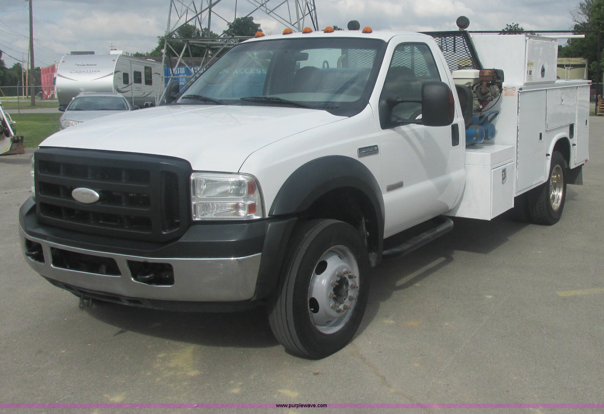 Purple Wave is selling a used Service Truck in Oklahoma. This item is a 2007 Ford F550 Super Duty XL service truck with the following: 220,451 actual miles, 6.0L V8 OHV 32V turbo diesel engine, Automatic transmission, AC and heat, Tilt, Cruise, AM/FM, Power windows, locks, and mirrors, Cloth interior, Knapheide 610805460J utility bed, Serial 20070822-0084609, Rear mounted vice, Honda GX240 8 HP air compressor, Miller Bobcat 225 welder/generator, CC/CV, AC/DC welder, 10,000 watt generator, Stock No. 907209, Battery dead, Hydraulic oil reservoir, Oil reservoir, 25 gallon waste tank, 225/70R19.5 tires, Injectors replaced eight months ago, EIN 1016956