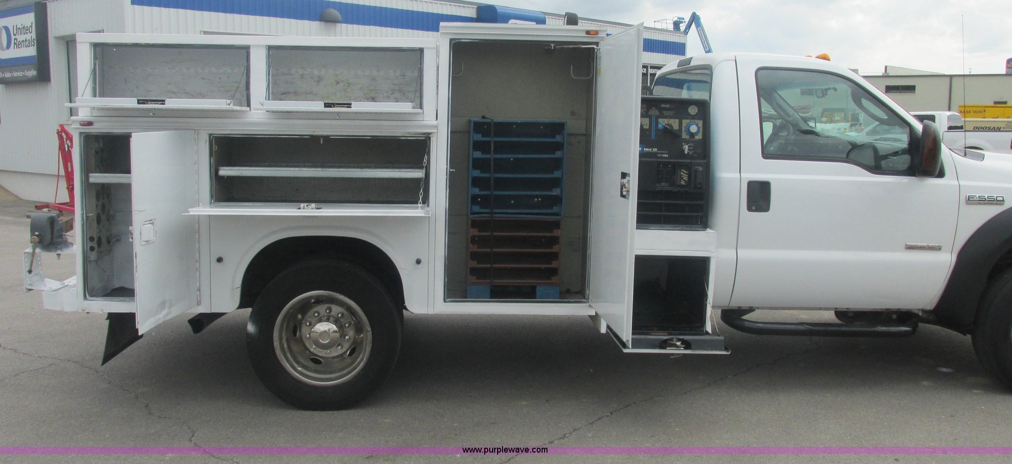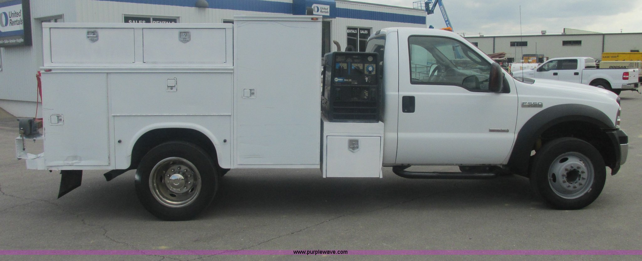 2007 Ford F550 Super Duty XL service truck. 220,451 actual miles, 6.0L V8 OHV 32V turbo diesel engine, Automatic transmission, AC and heat, Tilt, Cruise, AM/FM, Power windows, locks, and mirrors, Cloth interior, Knapheide 610805460J utility bed Serial 20070822-0084609, Rear mounted vice, Honda GX240 8 HP air compressor, Miller Bobcat 225 welder/generator CC/CV, AC/DC welder, 10,000 watt generator, Stock No. 907209, Battery dead, Hydraulic oil reservoir, Oil reservoir, 25 gallon waste tank, 225/70R19.5 tires, Injectors replaced eight months ago, EIN 1016956. View item removal requirement and like-kind exchange information. 1FDAF56P67EB39028. View equipment video. United Rentals - Sand Springs. 8200 Charles Page Blvd. Sand Springs, OK 74063