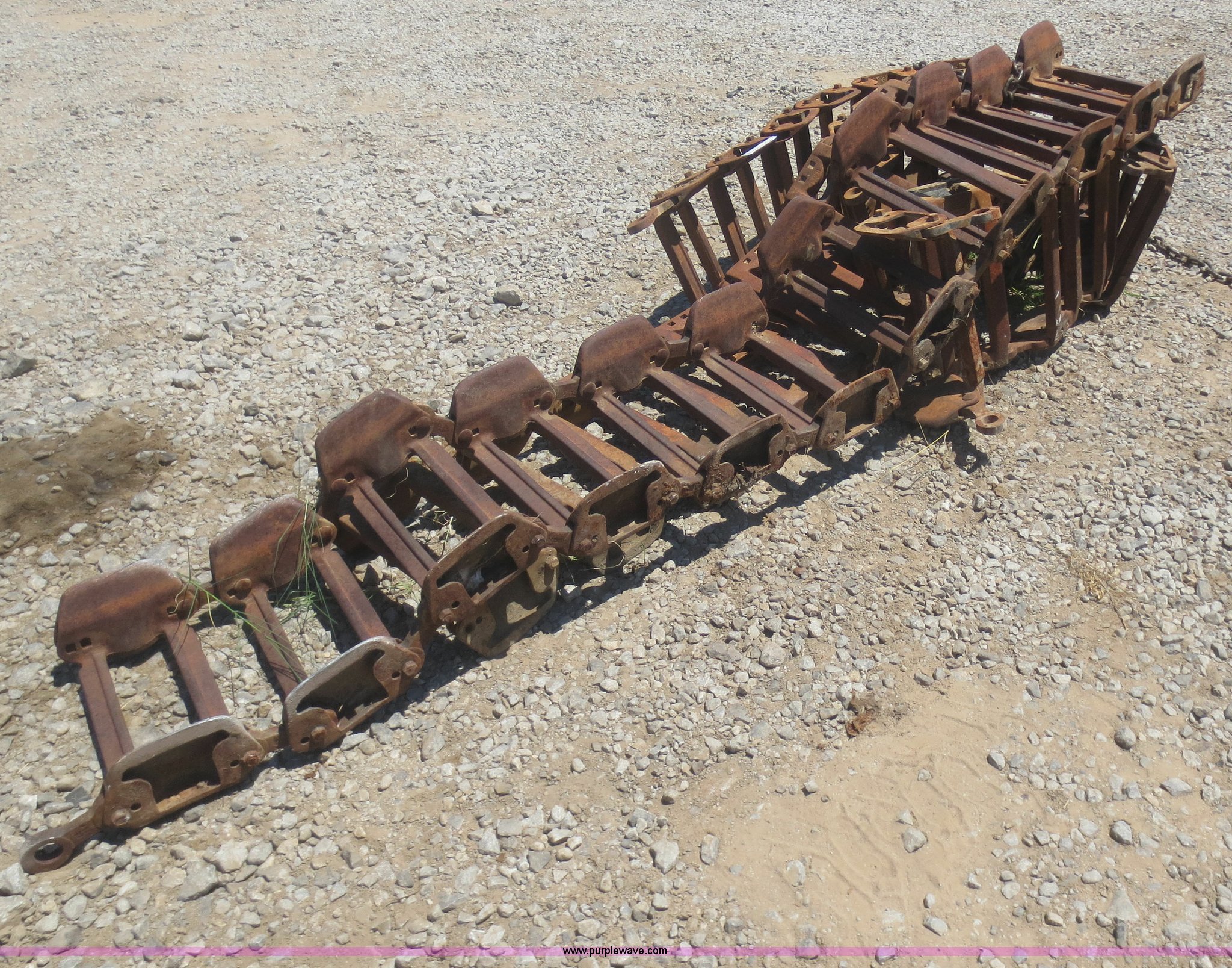 Purple Wave is selling a used Industrial Tires or Tracks in Oklahoma. This item is a John Deere steel skid steer tracks with the following: 14"W, Double grouser pads, Clips included, Fits John Deere 332 skid steer
