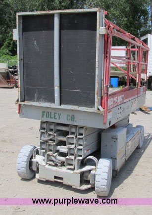 1999 Mec 2548 HT electric scissor lift. 1,000 lbs maximum lift capacity, 25' maximum lift height, 36V (6) 6V batteries, On-board chargers, Slide out platform extensions, Fork pockets, Power to the platform, Non-marking tires, Unknown operating condition, Serial 07104540. Foley Company. 7501 Front Street. Kansas City, MO 64120