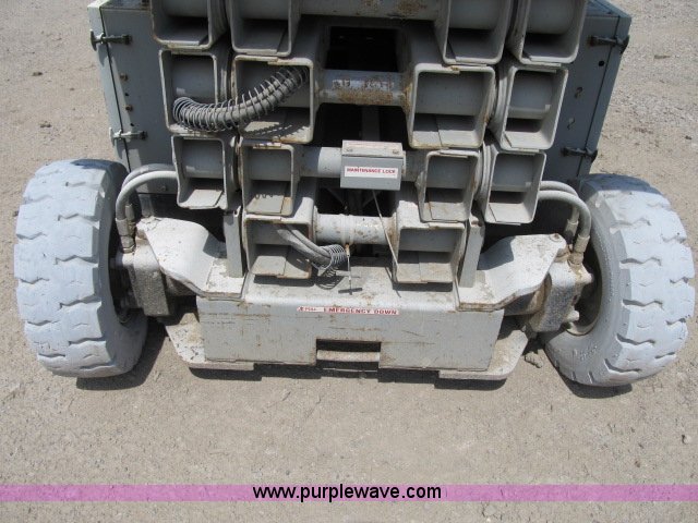 Purple Wave is selling a used Scissor or Vertical Lift in Missouri. This item is a 1999 Mec 2548 HT electric scissor lift with the following: 1,000 lbs maximum lift capacity, 25' maximum lift height, 36V, (6) 6V batteries, On-board chargers, Slide out platform extensions, Fork pockets, Power to the platform, Non-marking tires, Unknown operating condition, Serial 07104540