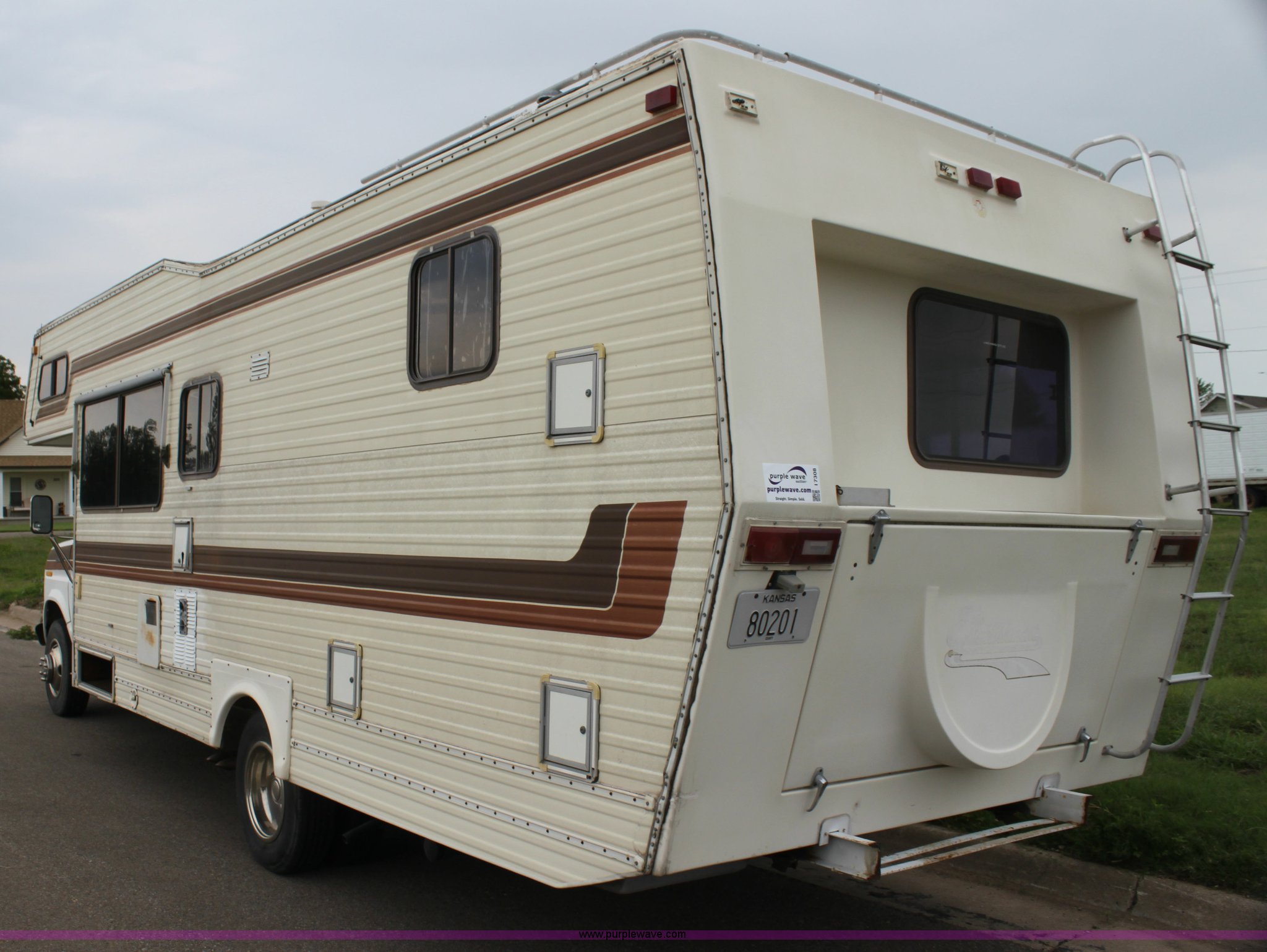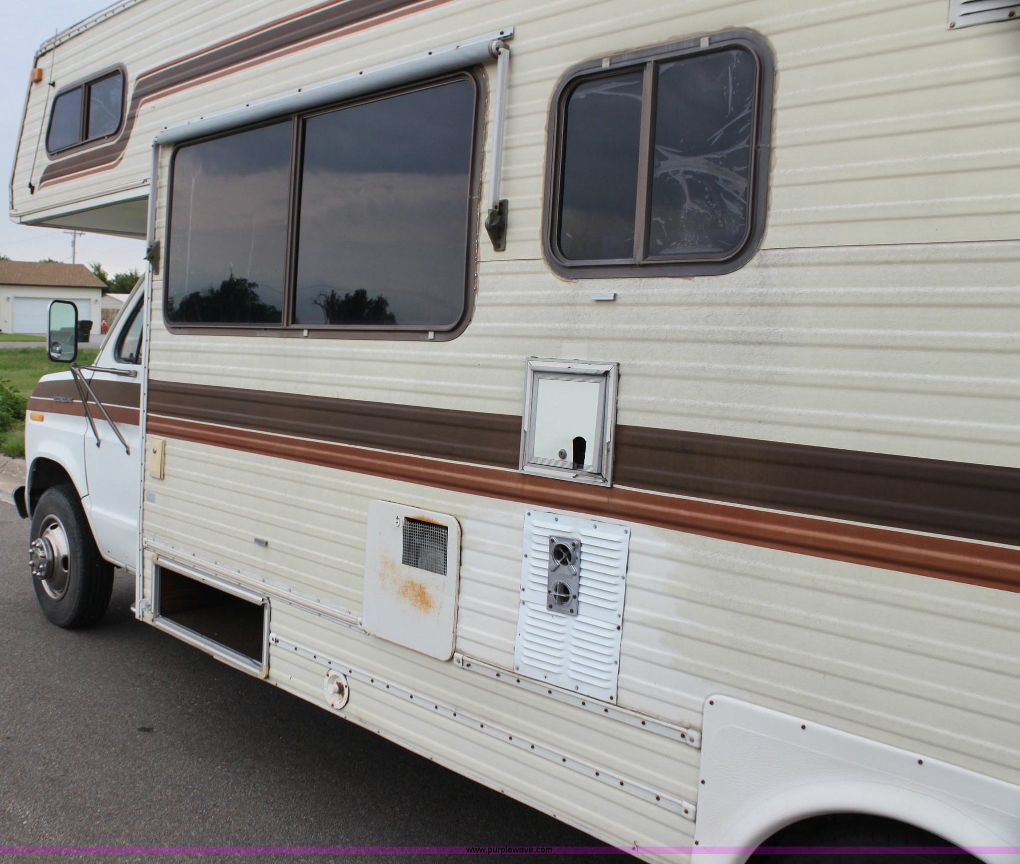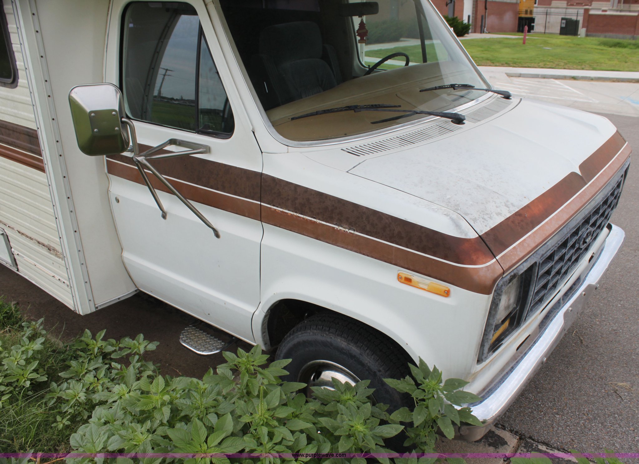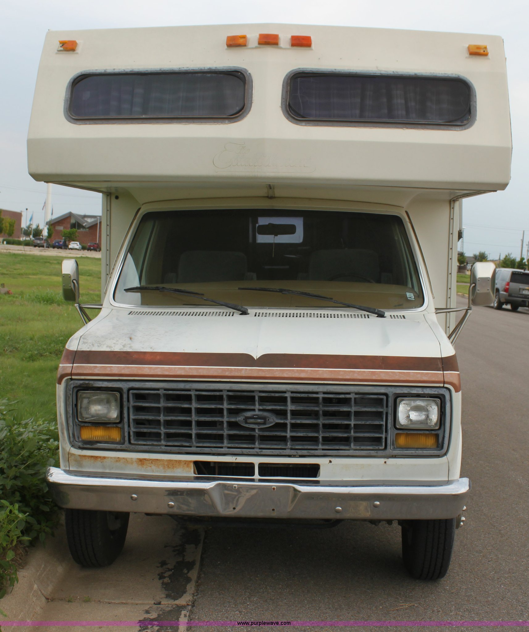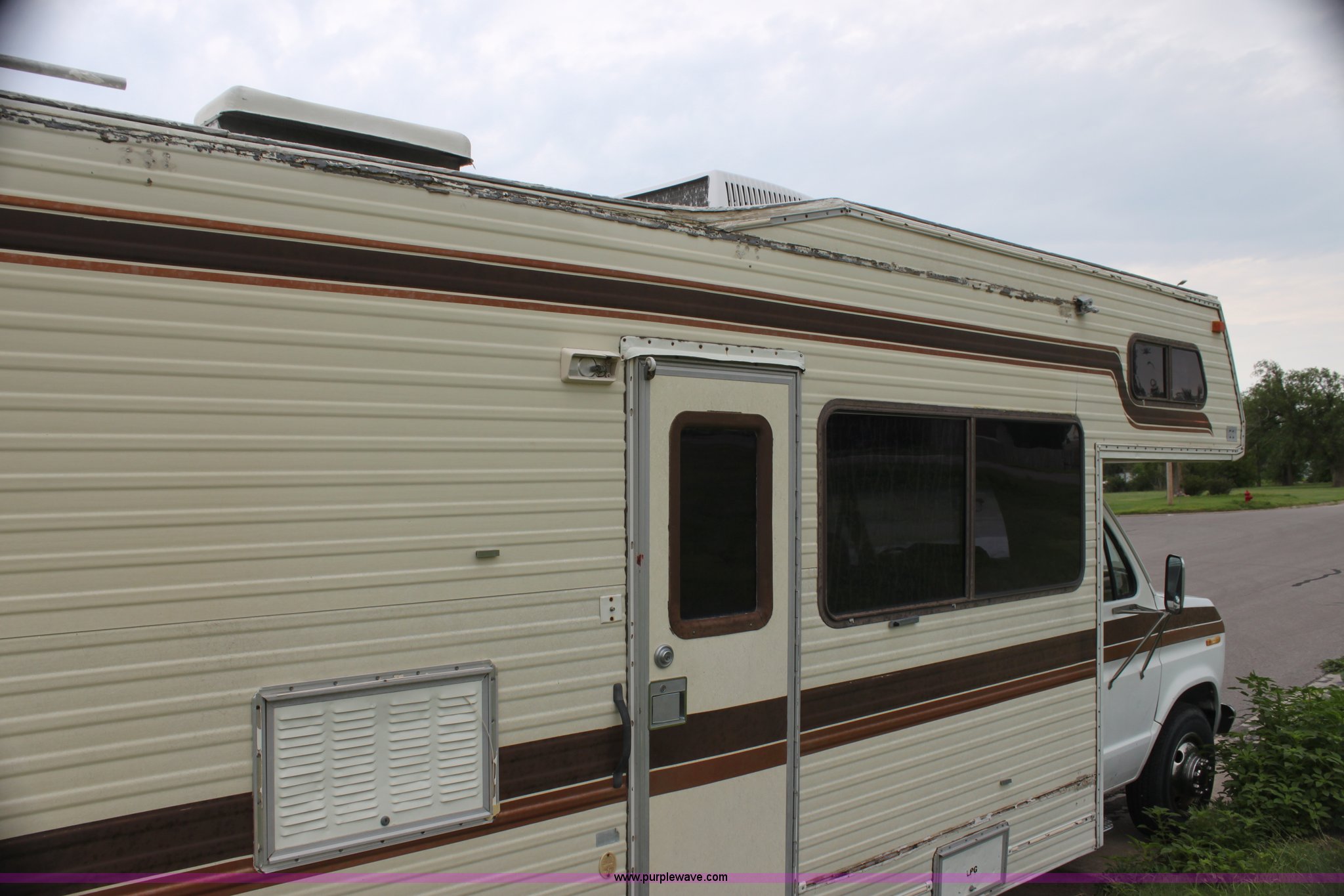 Purple Wave is selling a used RV in Kansas. This item is a 1984 Ford Econoline E350 RV with the following: 66,833 miles on odometer, 7.5L V8 OHV 16V gas engine, Automatic transmission, AC and heat, AM/FM, Manual windows and locks, Front bunk bed, Pull out couch, Master bed in rear, Stove and cook top, Electric/gas refrigerator/freezer, Unknown operating condition, Roof top AC, Onan GenSet generator, 4 kW, Electric start, 8.75/16.5 tires, Interior/exterior cosmetic damage, Sky light in shower broken