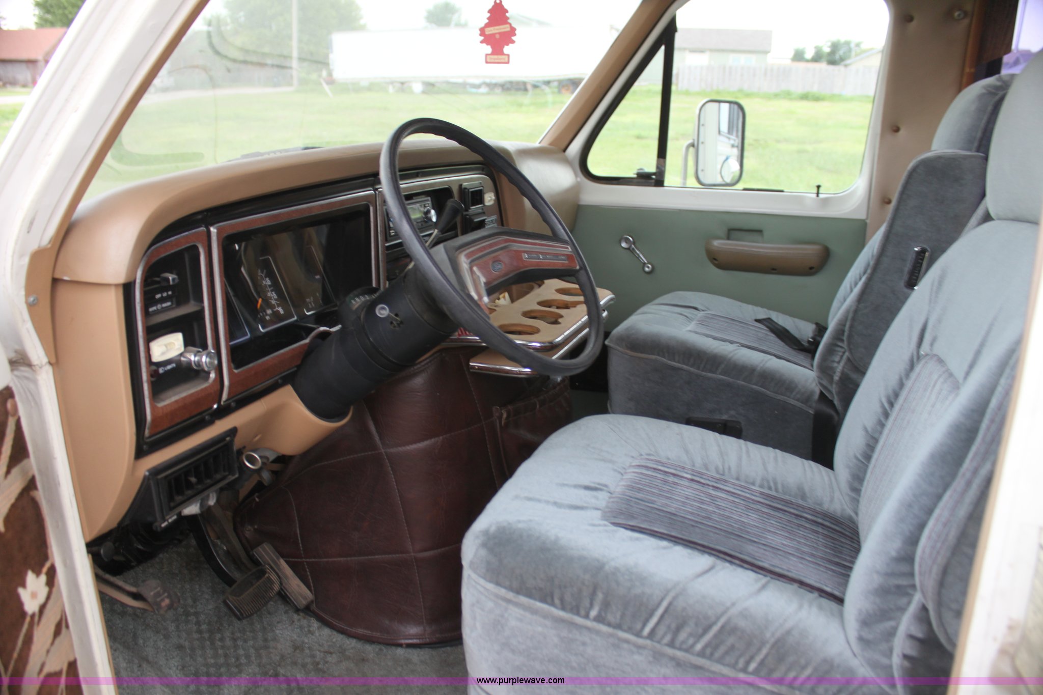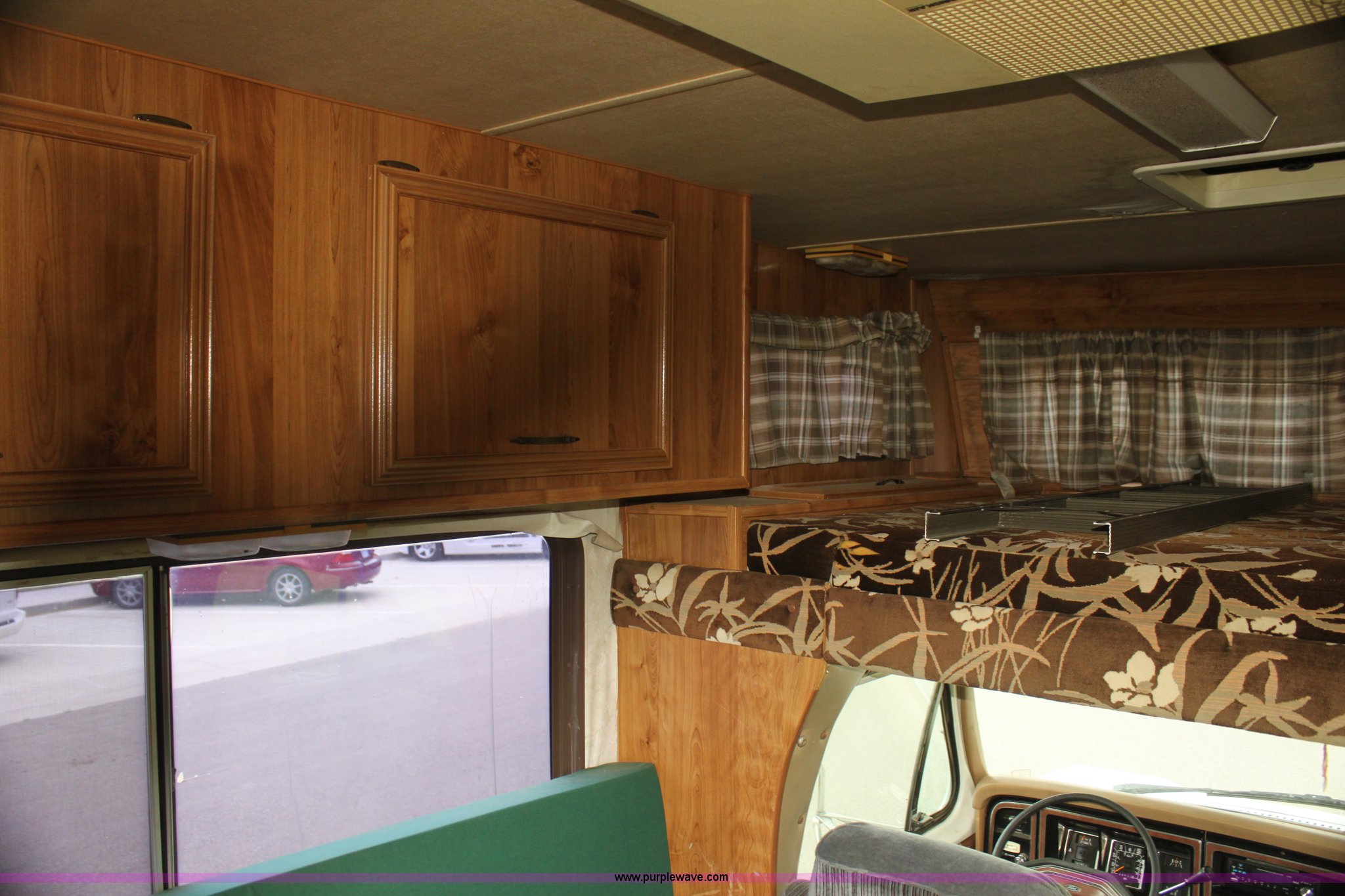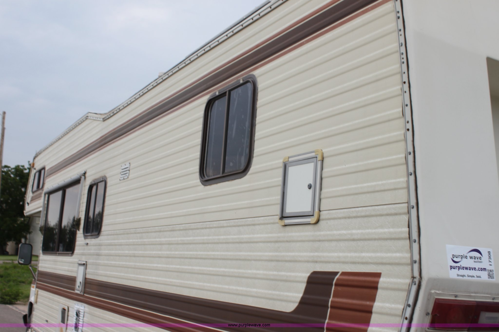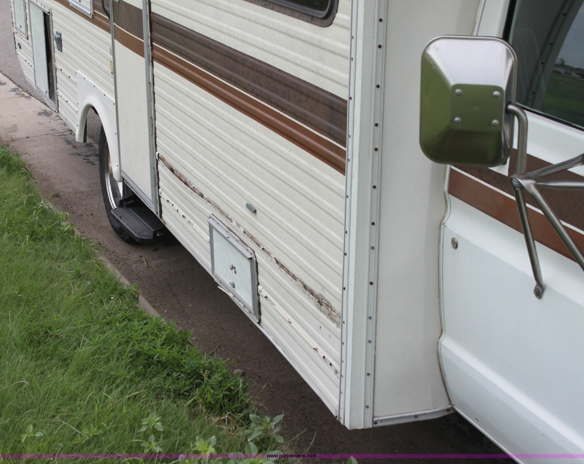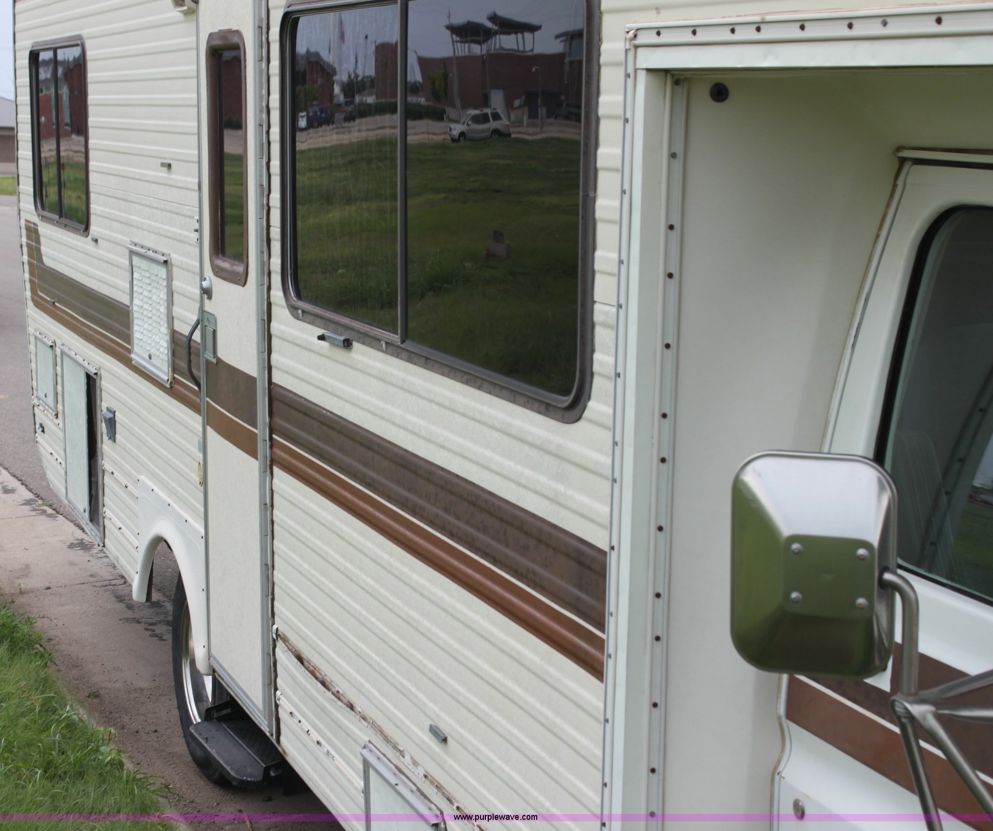 Purple Wave is selling a used RV in Kansas. This item is a 1984 Ford Econoline E350 RV with the following: 66,833 miles on odometer, 7.5L V8 OHV 16V gas engine, Automatic transmission, AC and heat, AM/FM, Manual windows and locks, Front bunk bed, Pull out couch, Master bed in rear, Stove and cook top, Electric/gas refrigerator/freezer, Unknown operating condition, Roof top AC, Onan GenSet generator, 4 kW, Electric start, 8.75/16.5 tires, Interior/exterior cosmetic damage, Sky light in shower broken