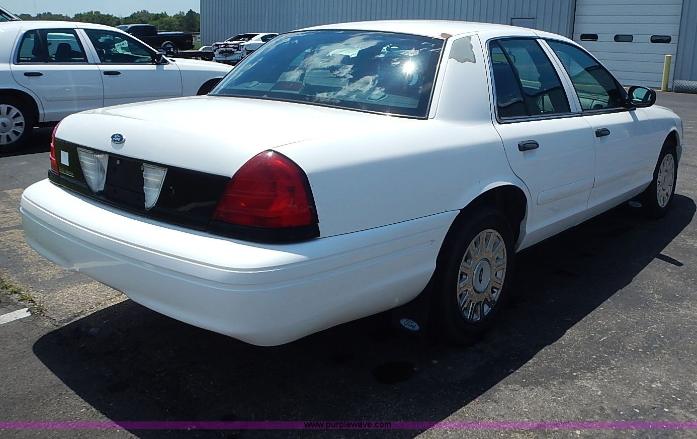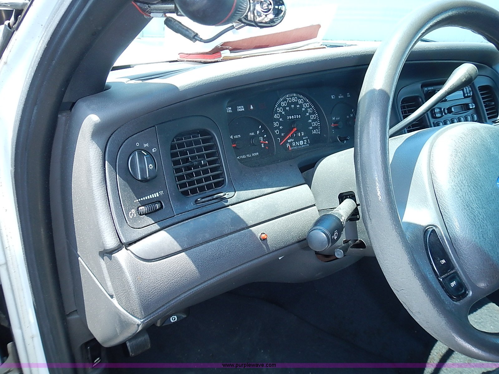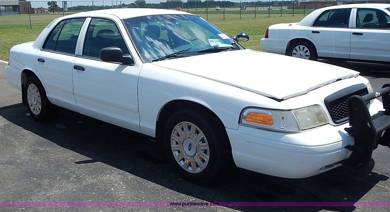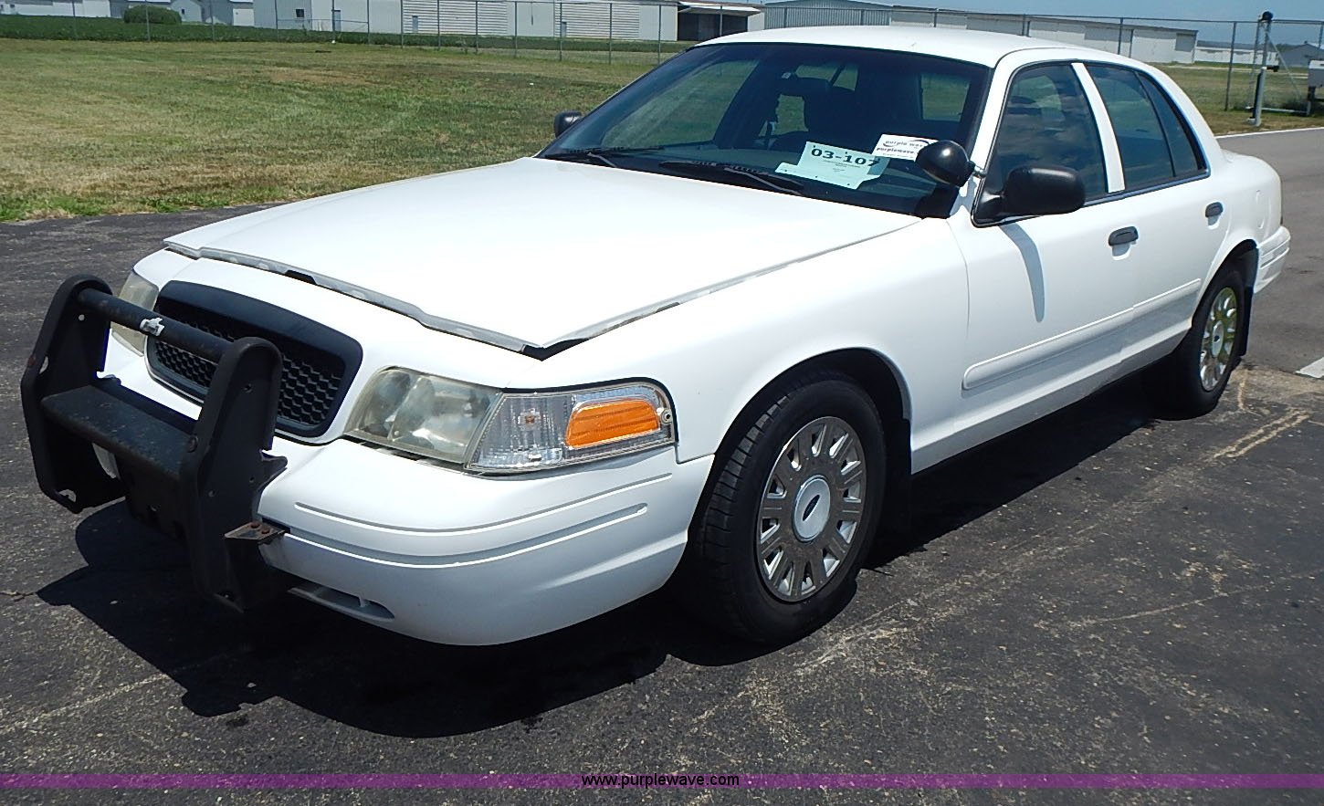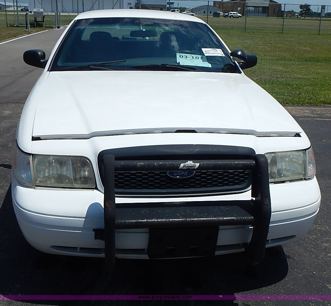 Purple Wave is selling a used Passenger Vehicle in Kansas. This item is a 2003 Ford Crown Victoria Police Interceptor with the following: 96,256 miles on odometer, 4.6L V8 SOHC 16V gas engine, Automatic transmission, AC and heat, Tilt, Cruise, AM/FM/cassette, Power windows, locks, mirrors, and seats, Cloth interior, Heated mirrors, Spot light, Push bar, 22560R16 tires, Weak battery, Paint peeling, Unit# 03-107