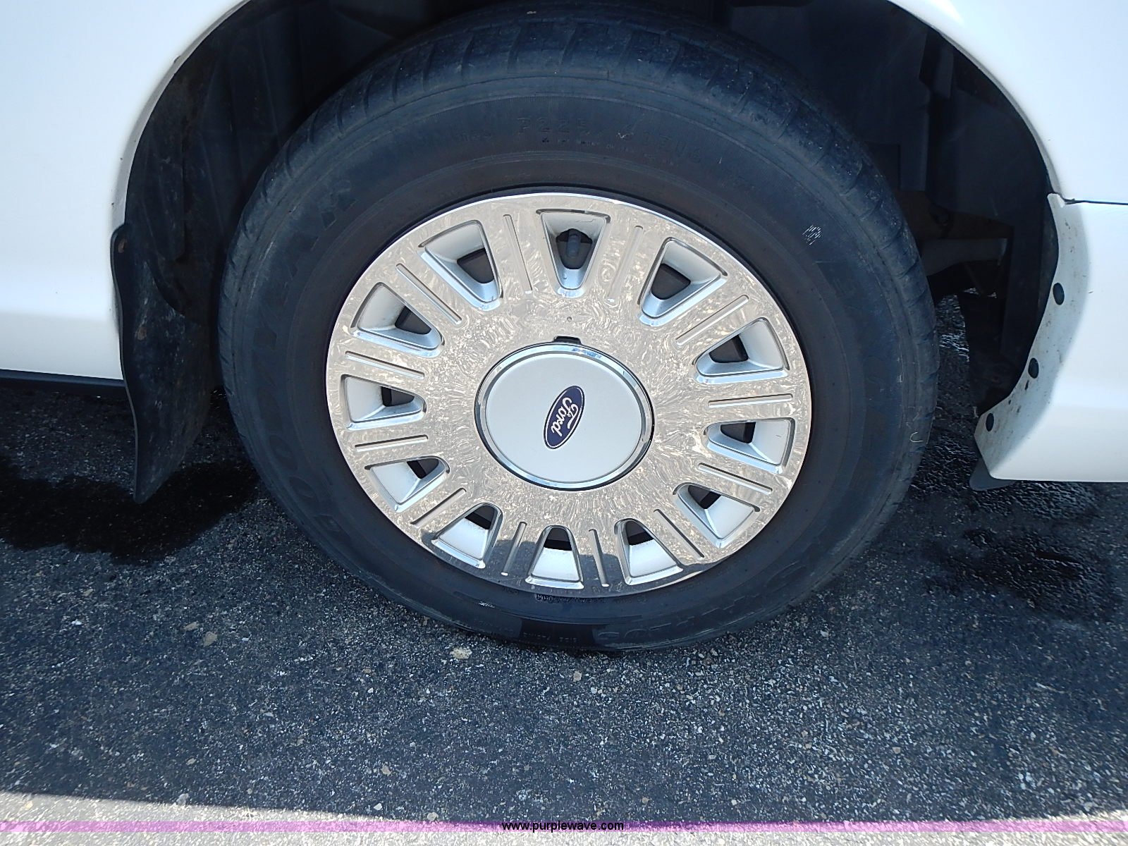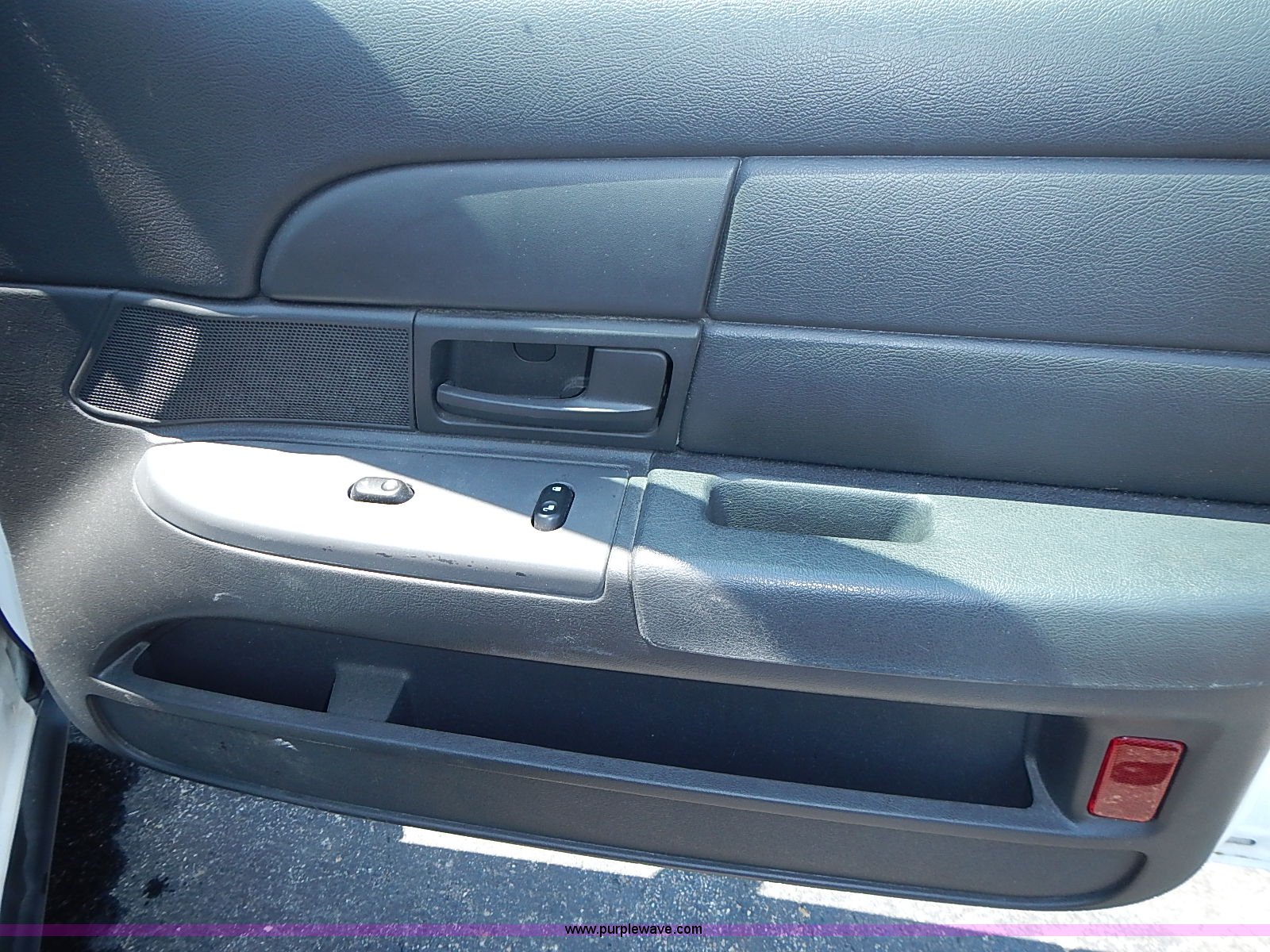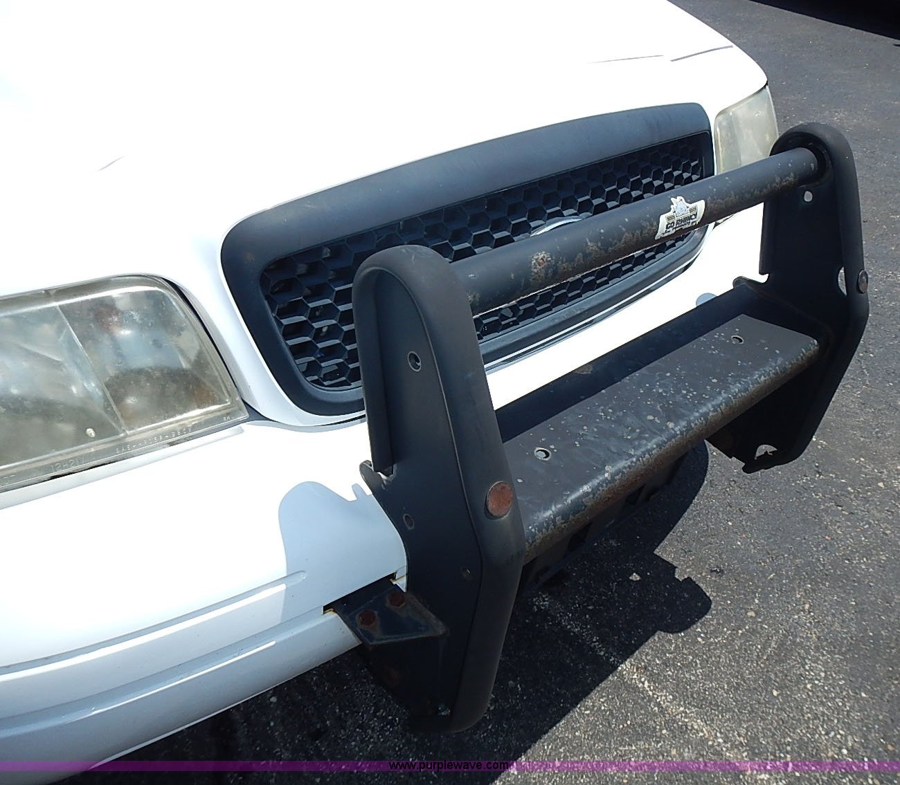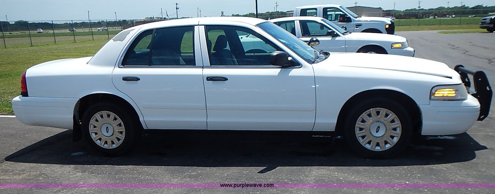 Purple Wave is selling a used Passenger Vehicle in Kansas. This item is a 2003 Ford Crown Victoria Police Interceptor with the following: 96,256 miles on odometer, 4.6L V8 SOHC 16V gas engine, Automatic transmission, AC and heat, Tilt, Cruise, AM/FM/cassette, Power windows, locks, mirrors, and seats, Cloth interior, Heated mirrors, Spot light, Push bar, 22560R16 tires, Weak battery, Paint peeling, Unit# 03-107