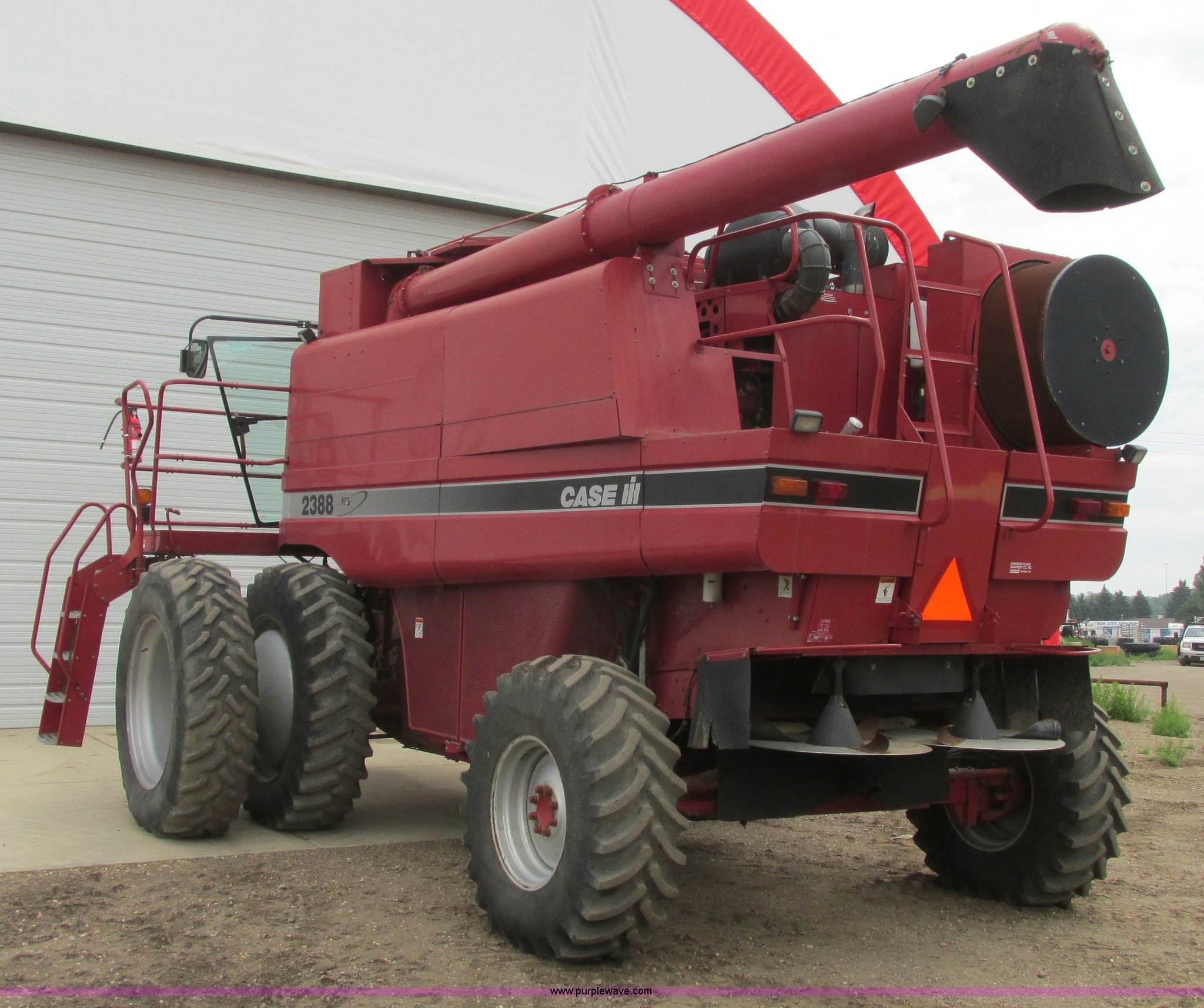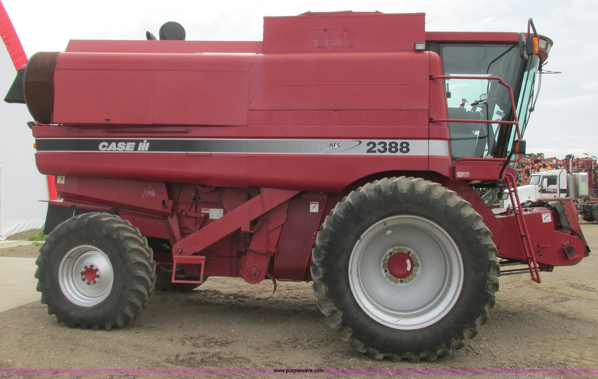 Purple Wave is selling a used Combine in North Dakota. This item is a 1998 Case IH 2388 RWA combine with the following: 884 engine hours on meter, 3,510 estimated engine hours, 3,150 estimated separator hours, Case 6TAA-830 8.3L six cylinder diesel engine, 280 HP, Serial 45736813, Hydrostatic transmission, 3F-3R gears, AC and heat, AM/FM/weatherband, Air suspension seat, Instructor's seat, Tilt steering wheel, Shades and visors, Case AFS GPS and grain monitor, Feeder house reverser, Clary Big Top bin extension, Work lights, Straw spreader, Operators manual, 18.4R42 dual front tires, 18.4R26 rear tires, Serial JJC0199954
