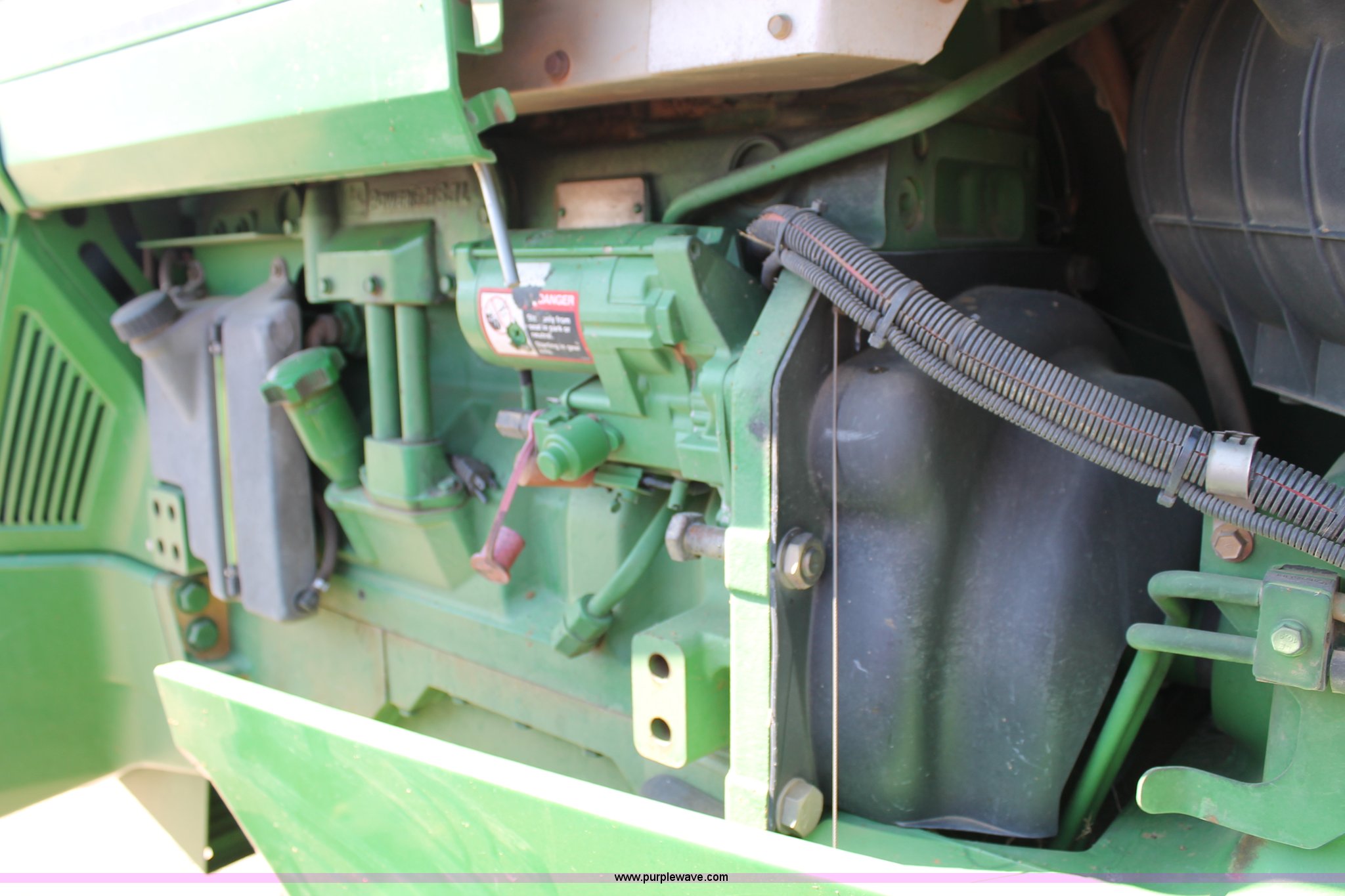 Purple Wave is selling a used Tractor in Texas. This item is a 2000 John Deere 8410 MFWD tractor with the following: 7,708 hours on meter, John Deere 6081HHW17 six cylinder diesel engine, 235 HP, Serial RG6081H102319, Powershift transmission, 16F-4R gears, AC and heat, AM/FM/cassette, Air suspension seat, Tilt steering wheel, Pull down shade, Three point, Quick attach, Draw bar, Auxiliary outlet, 1000 PTO, (4) rear hydraulic remotes, 135 gallon fuel tank, (20) suitcase weights, Wheel weight, 380/85R34 front tires, 480/80R46 rear tires, Serial RW8410P002309