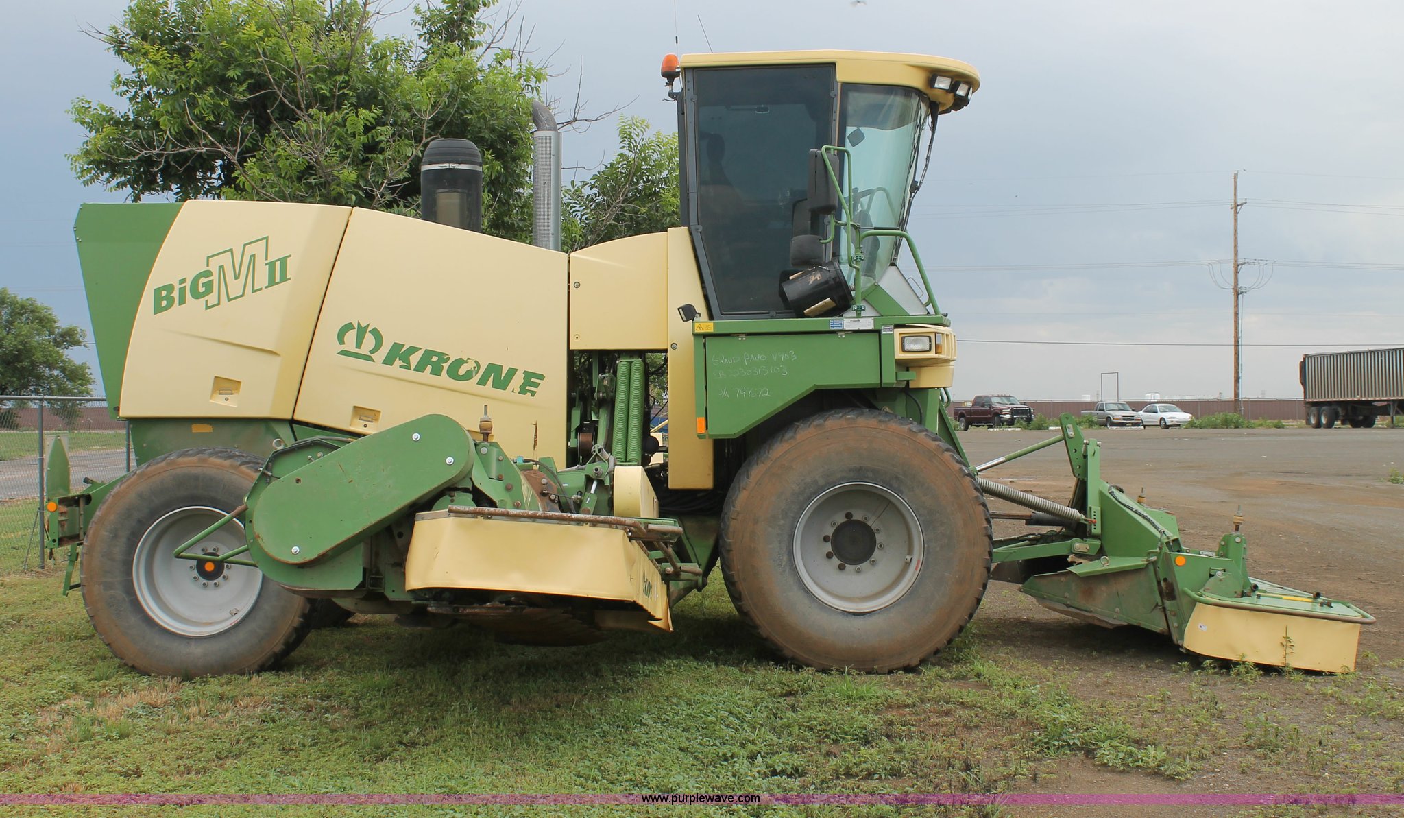 Purple Wave is selling a used Windrower Self Propelled in Texas. This item is a 2008 Krone Big M II mower conditioner with the following: 3,558 engine hours on meter, 2,343 cutting hours on meter, Mercedes-Benz 12.8L six cylinder Tier III diesel engine, Model OM 460 LA, 365 HP, Two speed infinitely variable transmission, Four wheel drive, AC and heat, AM/FM/CD/cassette, Air suspension seat, Instructor's seat, Performance monitor, 30' cutting width, Steel conditioners, Integrated merger system, Hydraulic folding wings, Rear hitch, 600/60R30.5 tires, 750/60R30.5 tires, Approx. 30,000 lbs. base operating weight, Serial BM749672