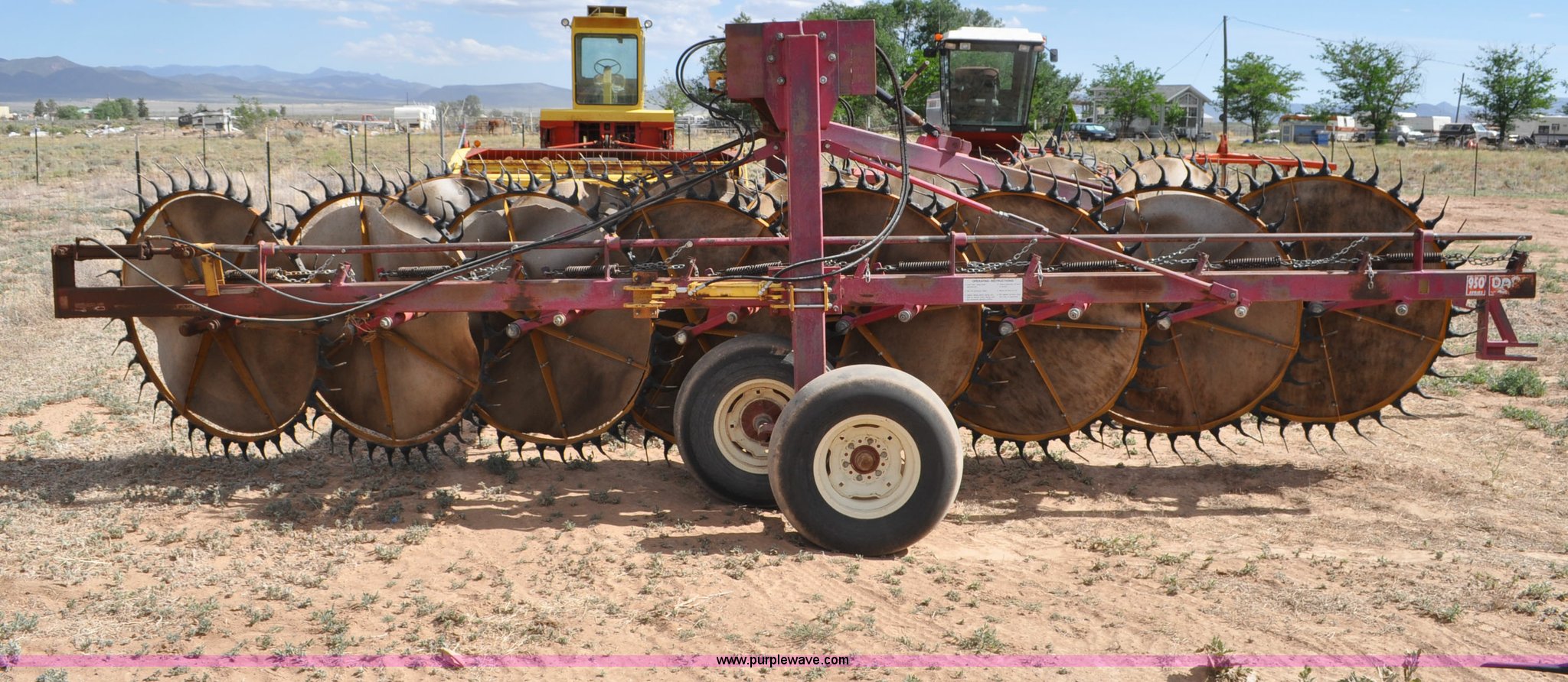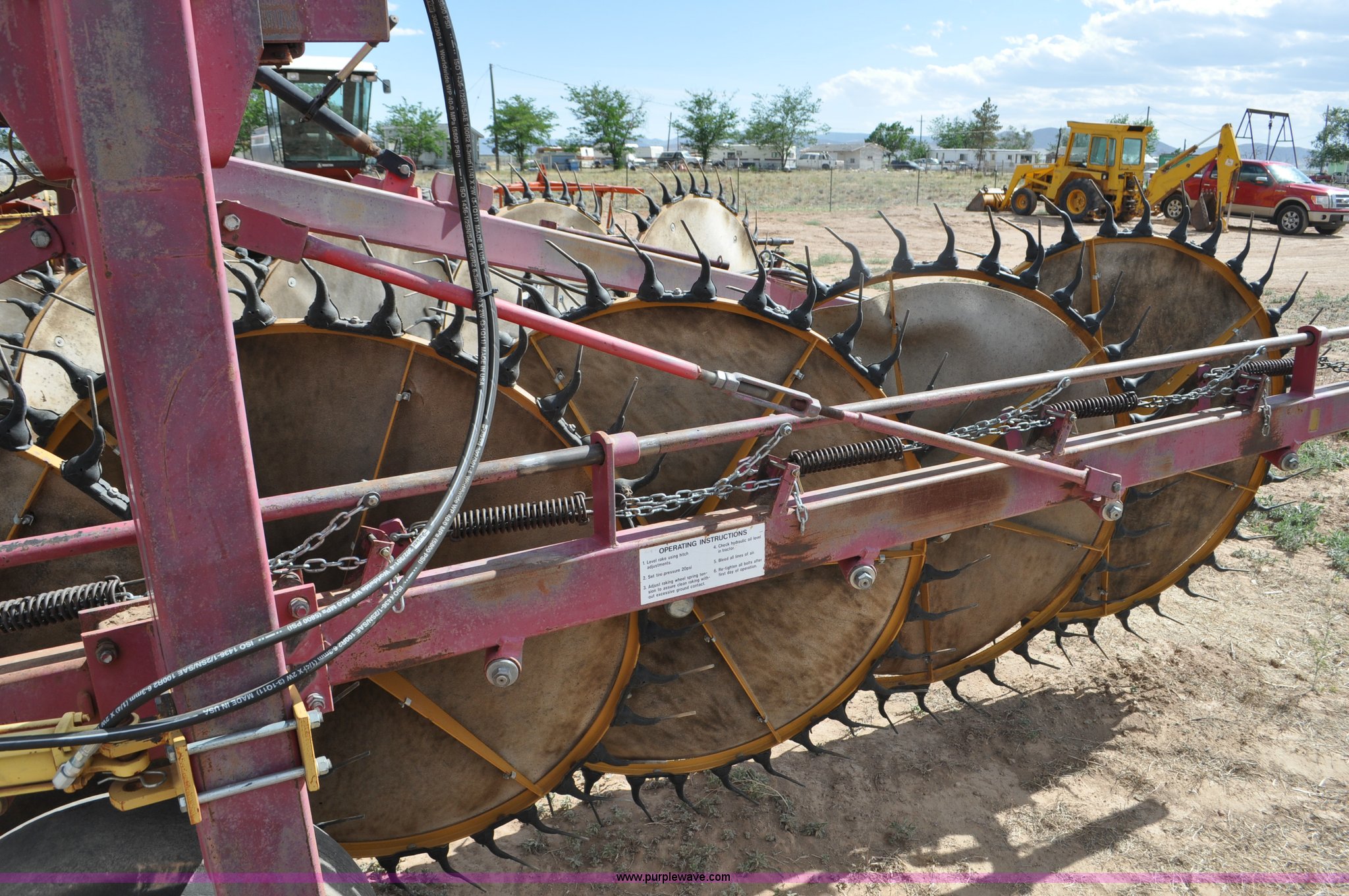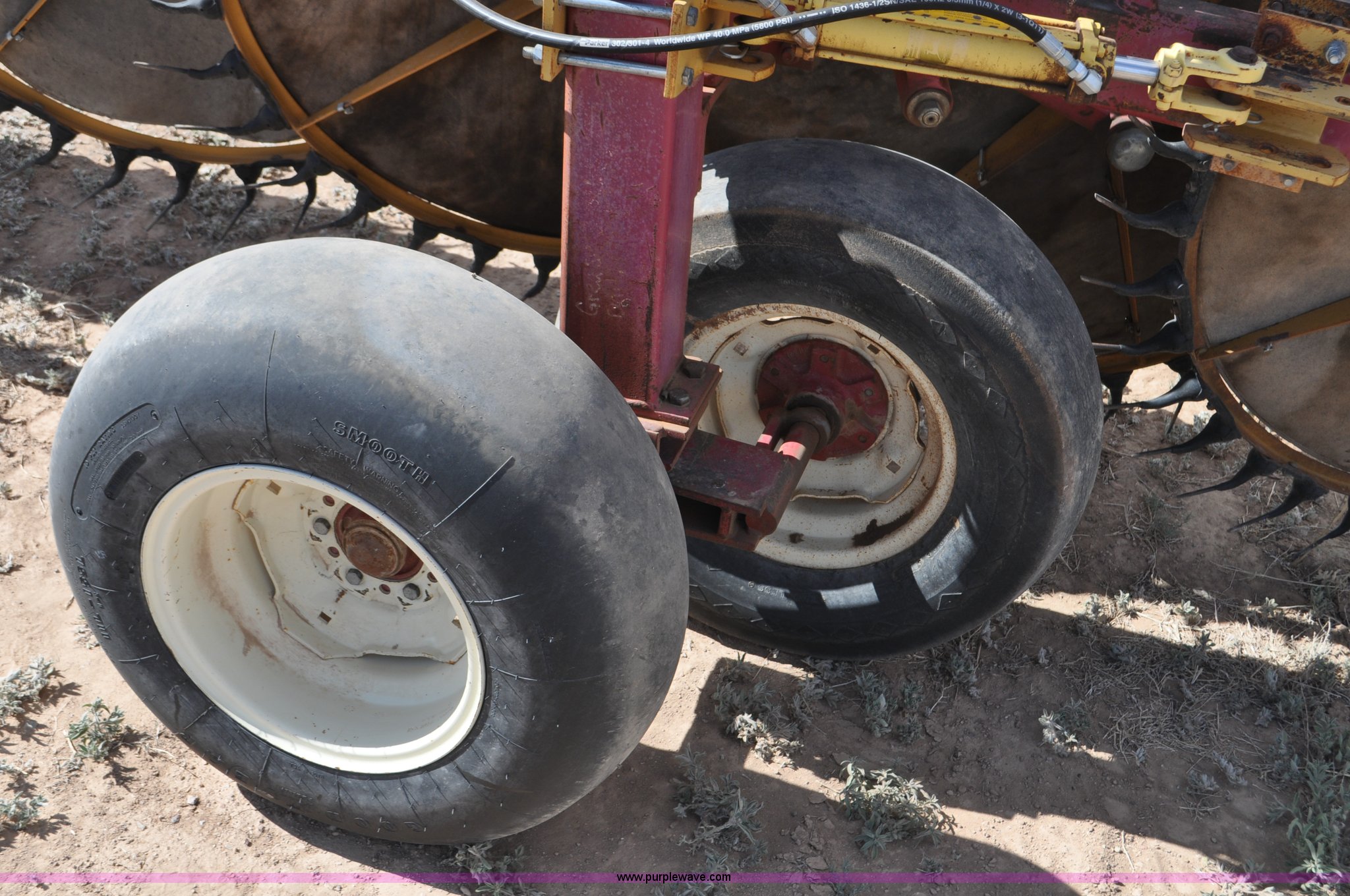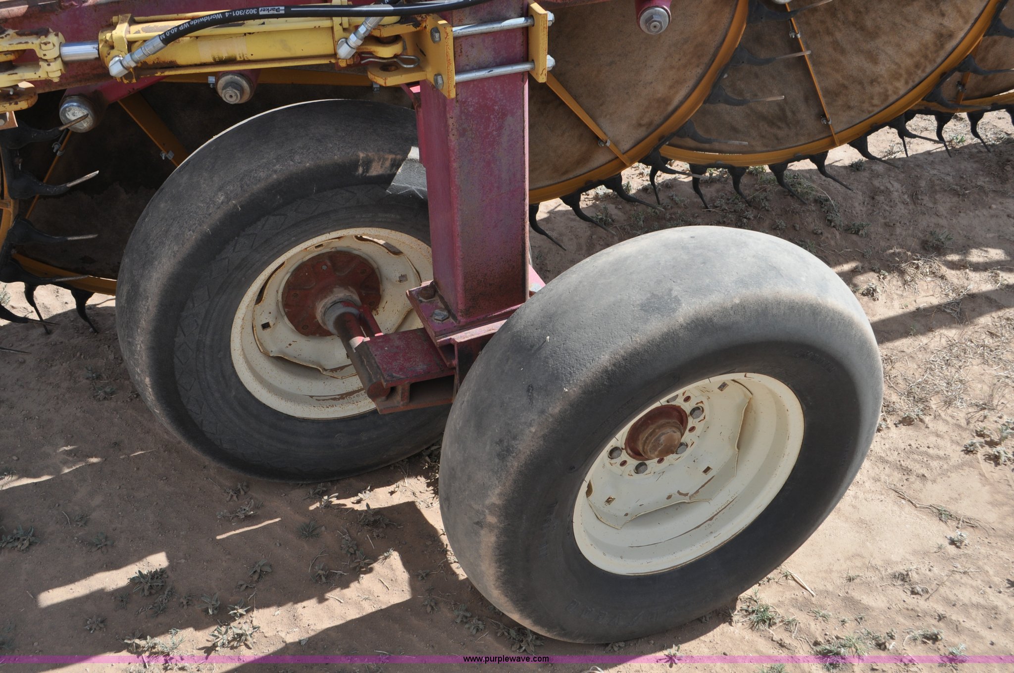 Purple Wave is selling a used Hay Rake in Utah. This item is a Darf 950 hay rake with the following: 15 wheels, 5' diameter wheels, Hydraulic fold and raise, Pin hitch, Tandem rocker axles, 11L-15 tires, Serial 55428, Unit# U13G1896