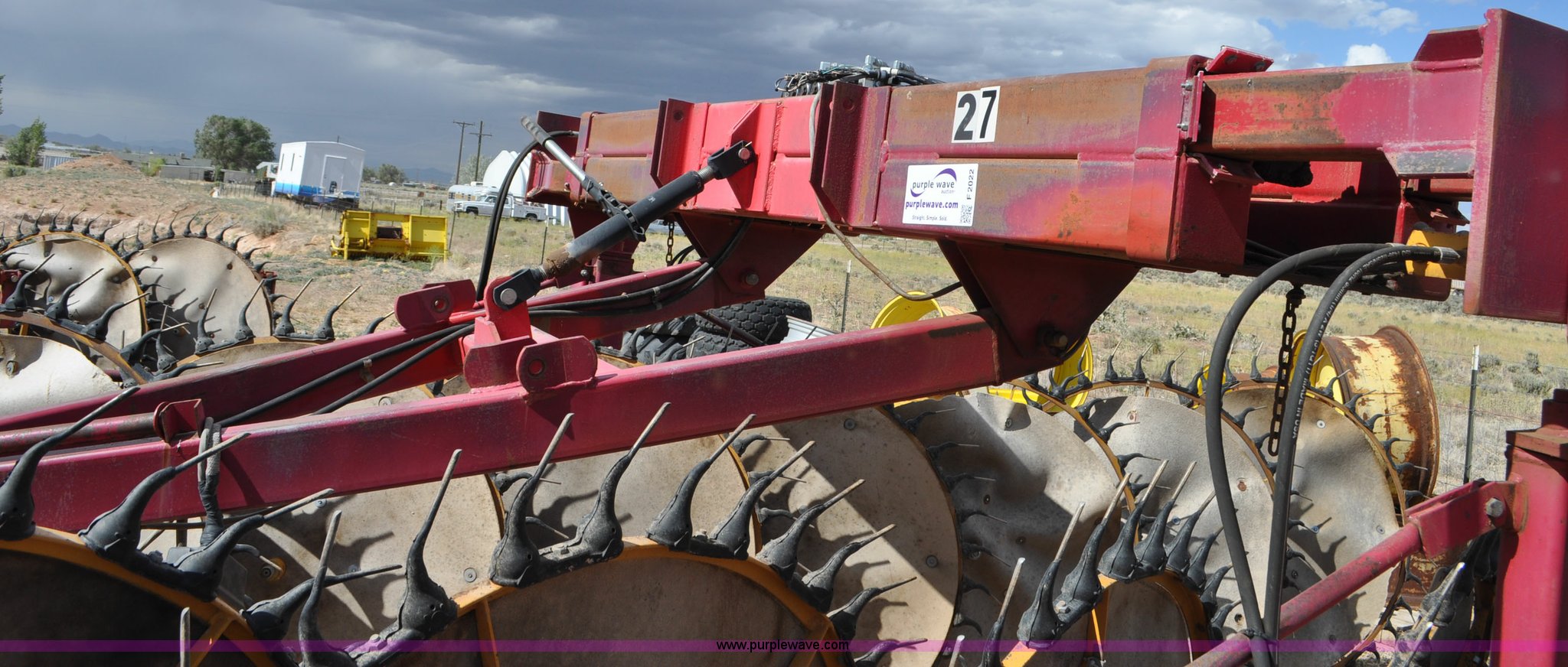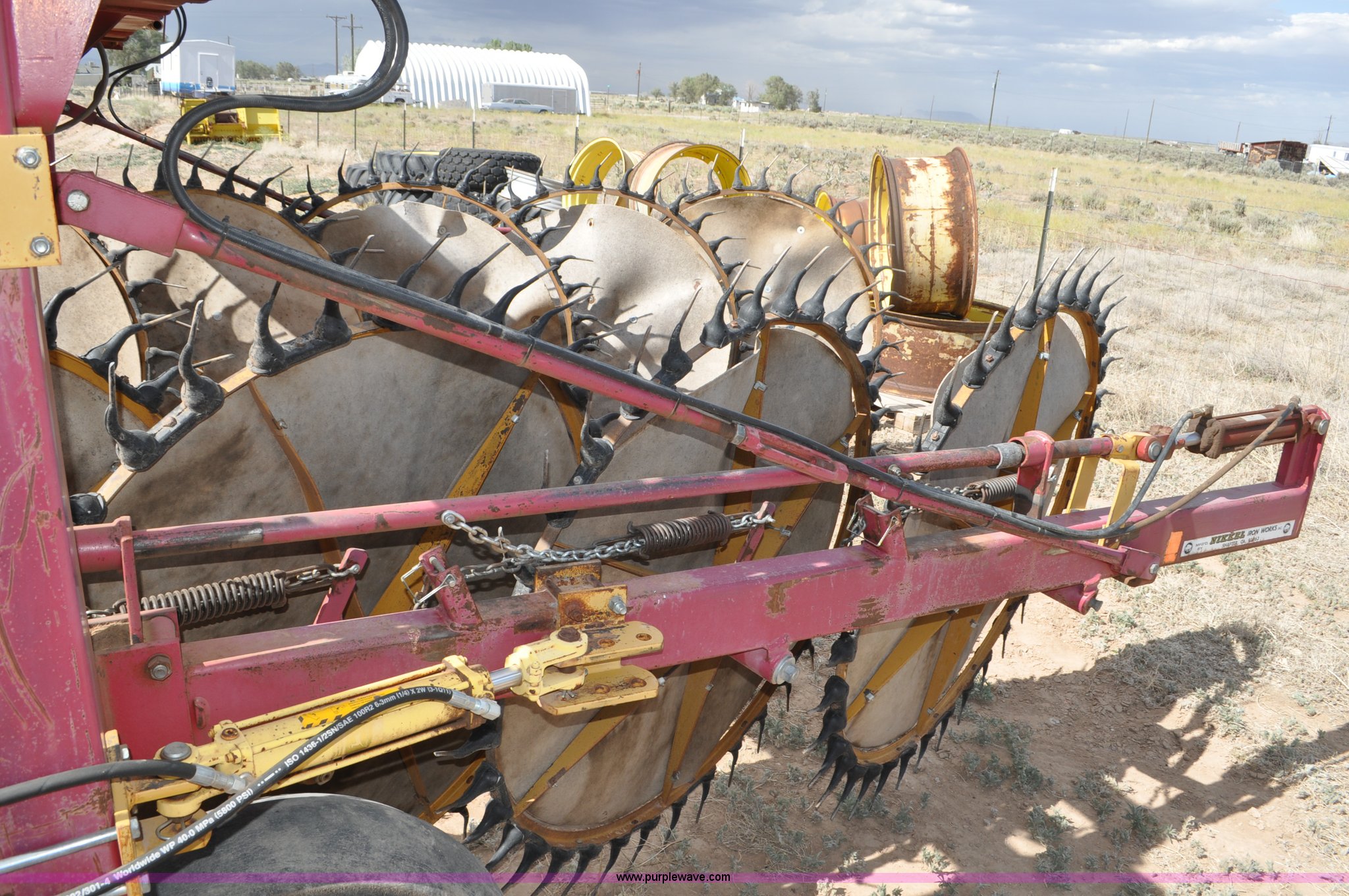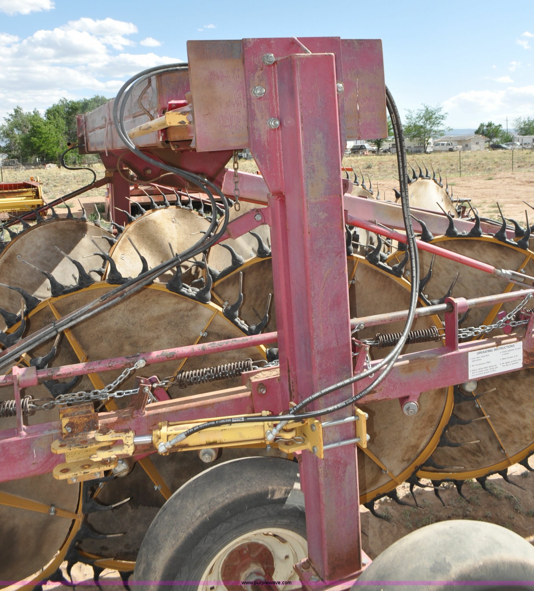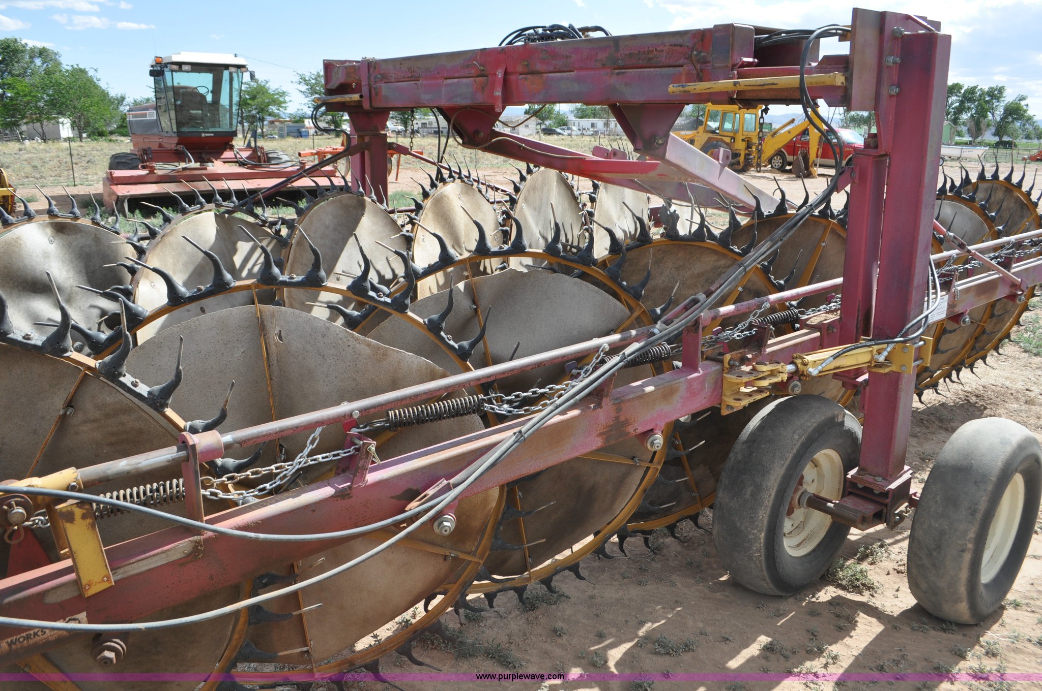 Purple Wave is selling a used Hay Rake in Utah. This item is a Darf 950 hay rake with the following: 15 wheels, 5' diameter wheels, Hydraulic fold and raise, Pin hitch, Tandem rocker axles, 11L-15 tires, Serial 55428, Unit# U13G1896