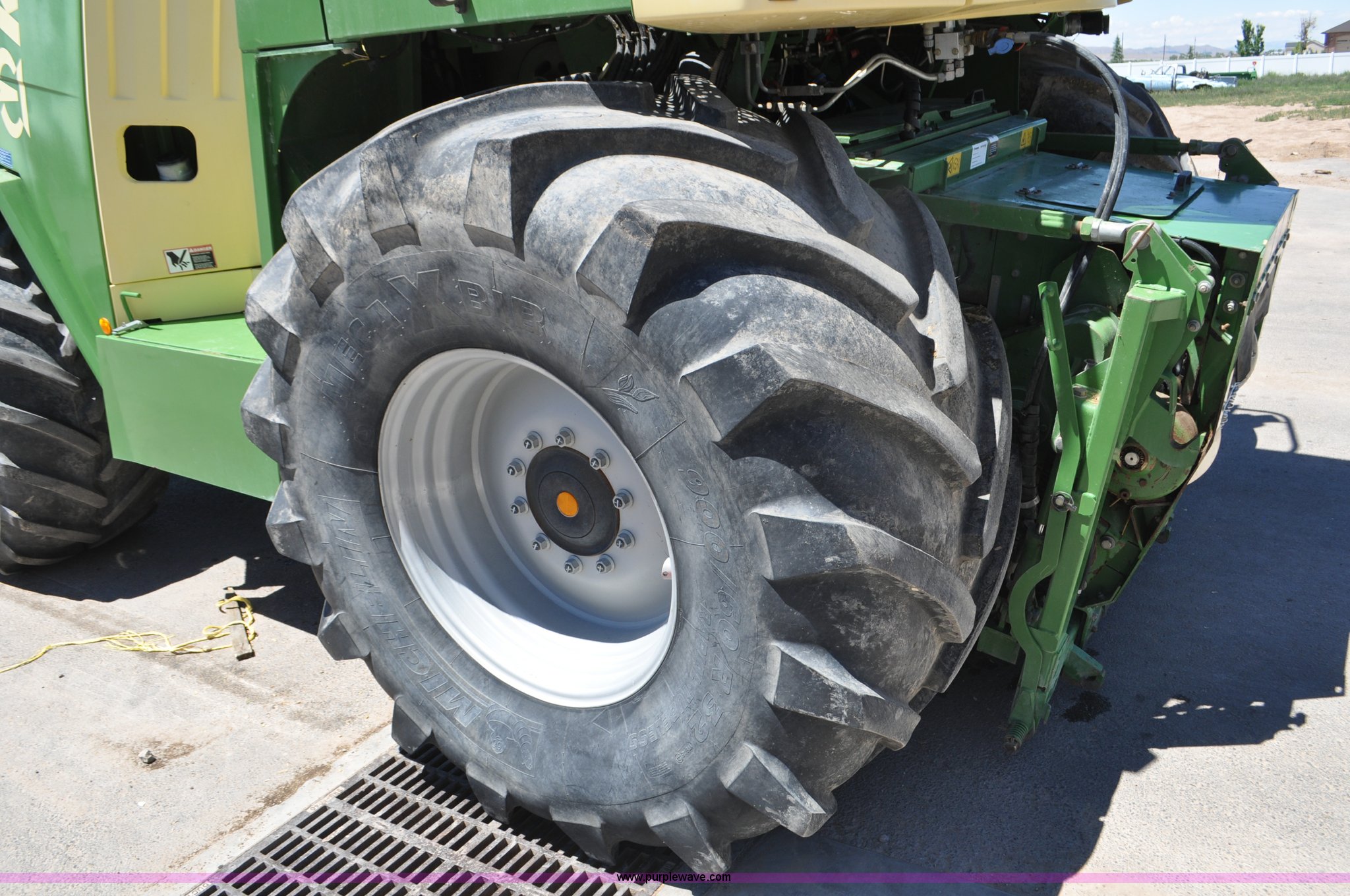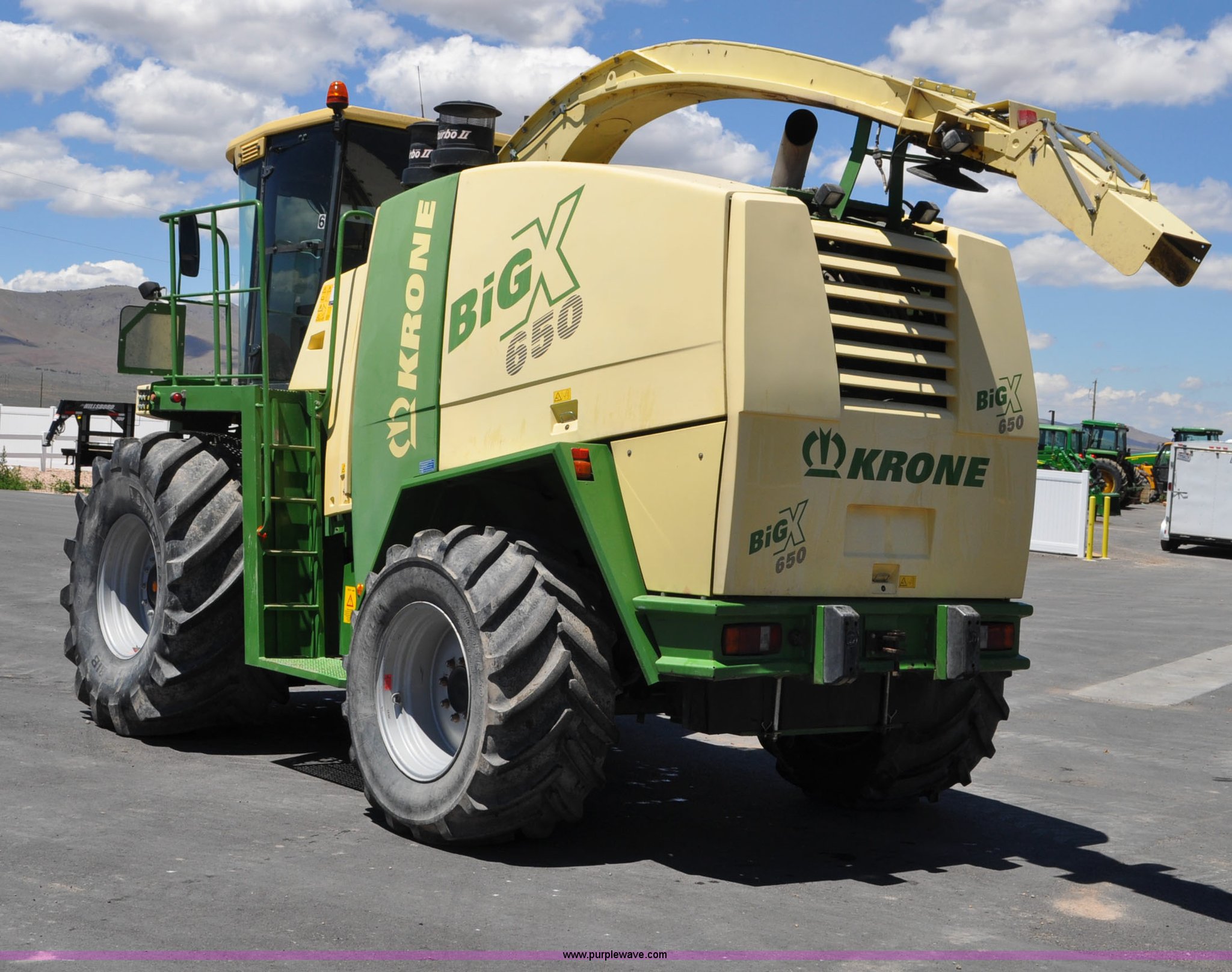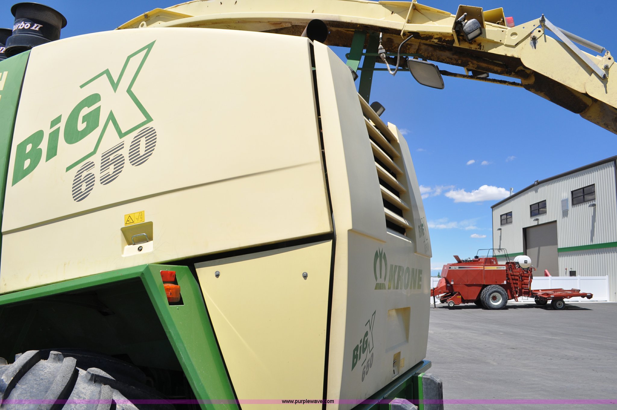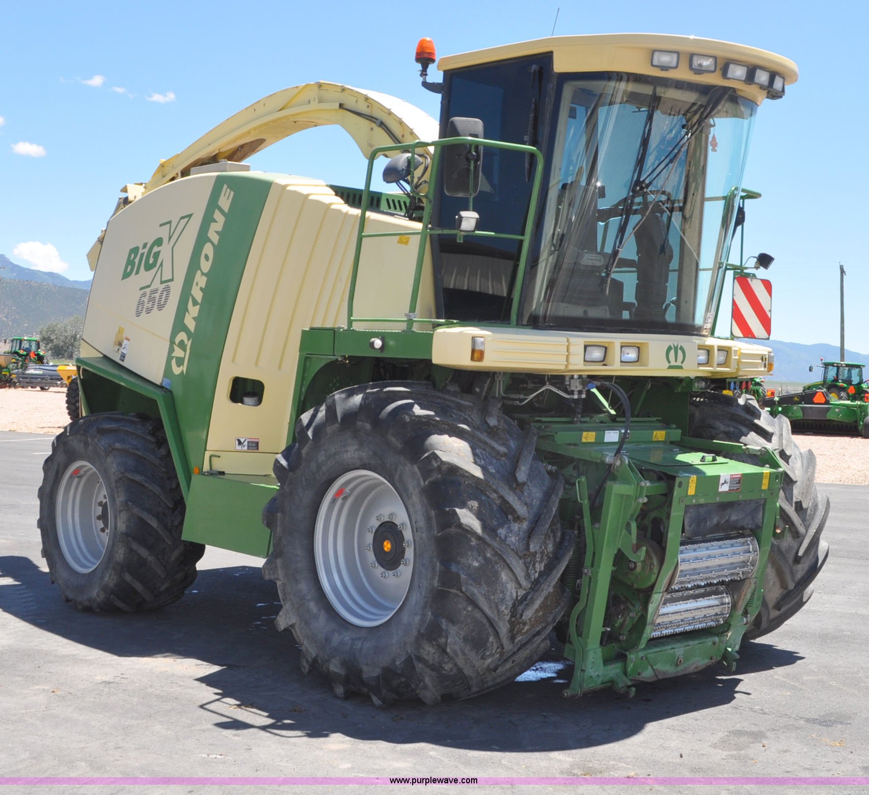 Purple Wave is selling a used Forage Harvester in Utah. This item is a 2008 Krone Big X 650 forage harvester with the following: 2,117 engine hours on meter, 1,579 separator hours on meter, Daimler Chrylser OM502LA 15.9L eight cylinder Tier III diesel engine, 653 HP, Infinite variable transmission with wheel motors, Four wheel drive, Auto climate control, Air suspension seat, Windshield wiper, Side window wipers, Buddy seat, EasyTouch information center, Autopilot, Kernel processor, Feed roll V-sandwich/quick attach, VariStream crop flow system, Automatic auto lube system, 210 degree swivel range of unloading chute, 254 gallon fuel tank, 900/60R32 front tires, 710/55R30 rear tires, Serial BX746938, Unit# U14P0860