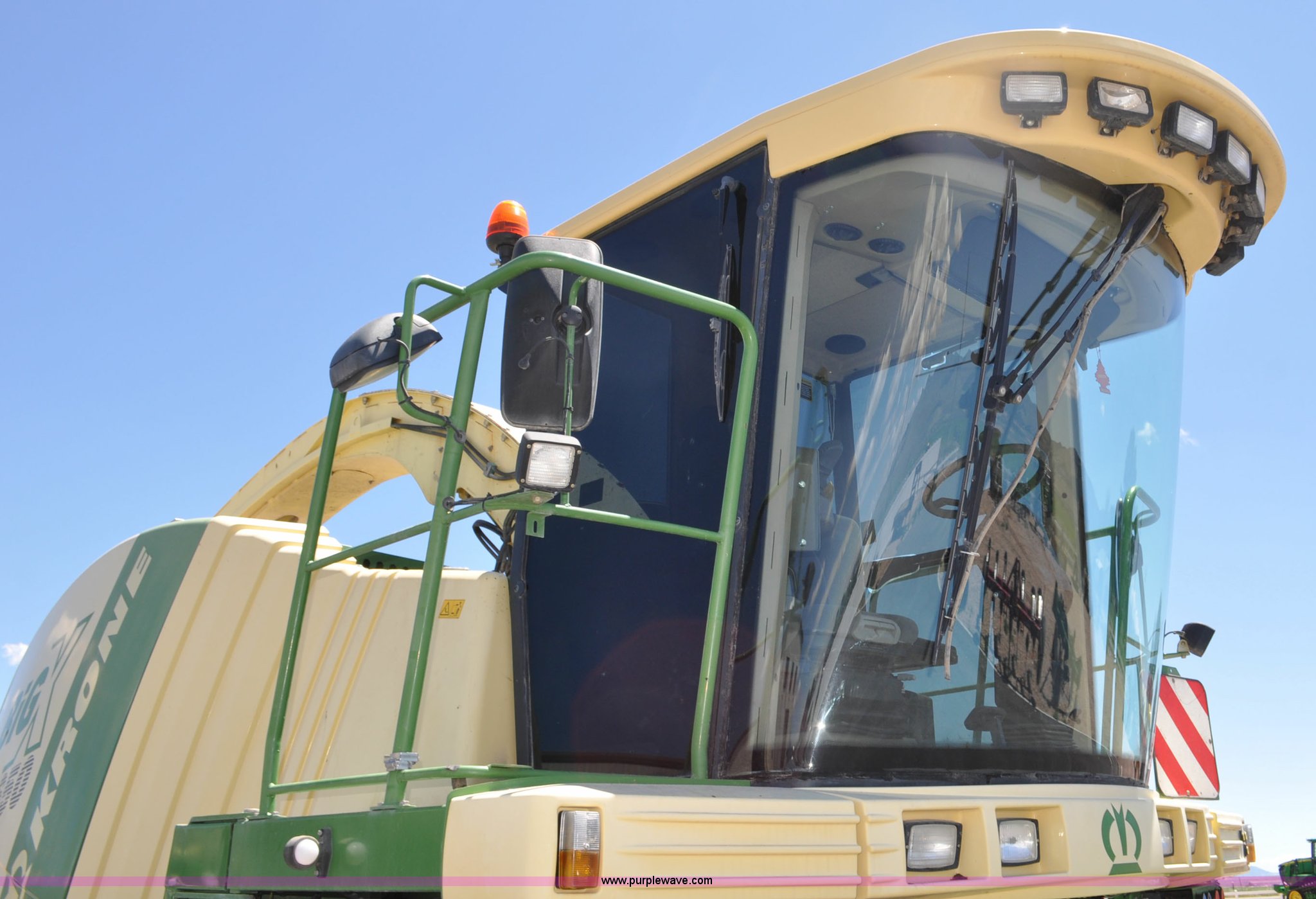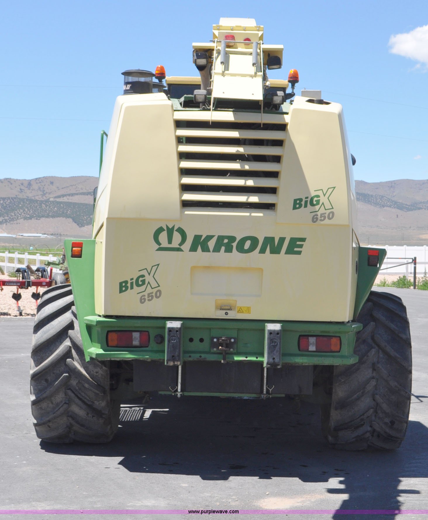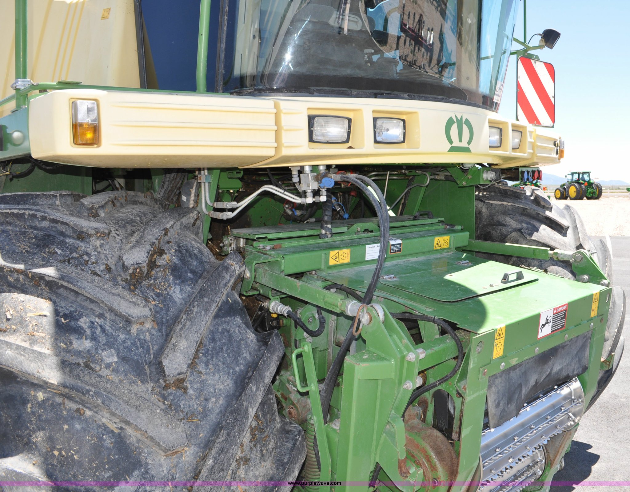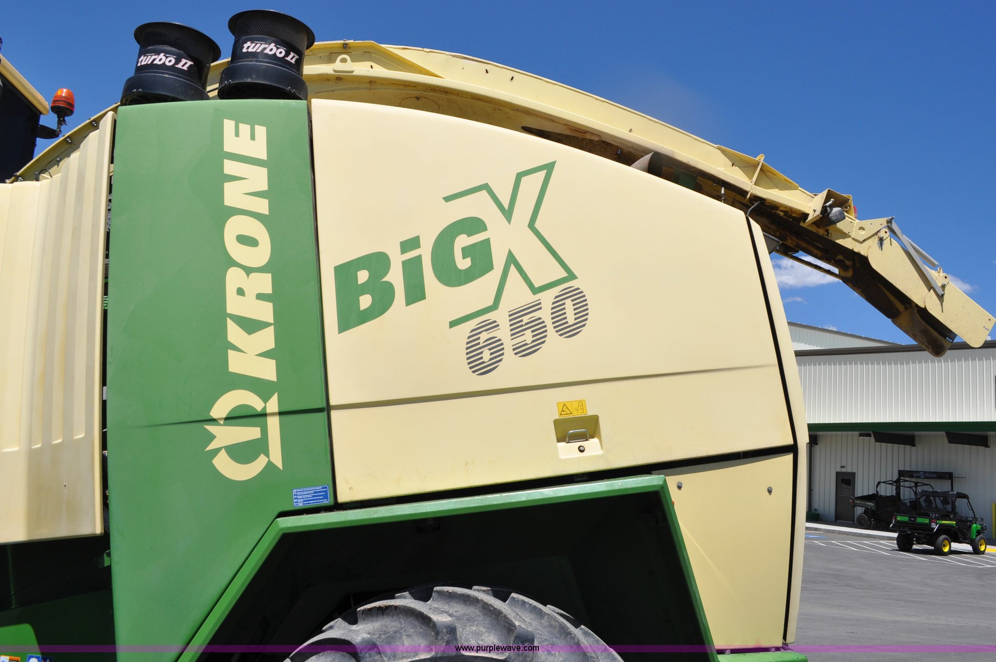 Purple Wave is selling a used Forage Harvester in Utah. This item is a 2008 Krone Big X 650 forage harvester with the following: 2,117 engine hours on meter, 1,579 separator hours on meter, Daimler Chrylser OM502LA 15.9L eight cylinder Tier III diesel engine, 653 HP, Infinite variable transmission with wheel motors, Four wheel drive, Auto climate control, Air suspension seat, Windshield wiper, Side window wipers, Buddy seat, EasyTouch information center, Autopilot, Kernel processor, Feed roll V-sandwich/quick attach, VariStream crop flow system, Automatic auto lube system, 210 degree swivel range of unloading chute, 254 gallon fuel tank, 900/60R32 front tires, 710/55R30 rear tires, Serial BX746938, Unit# U14P0860