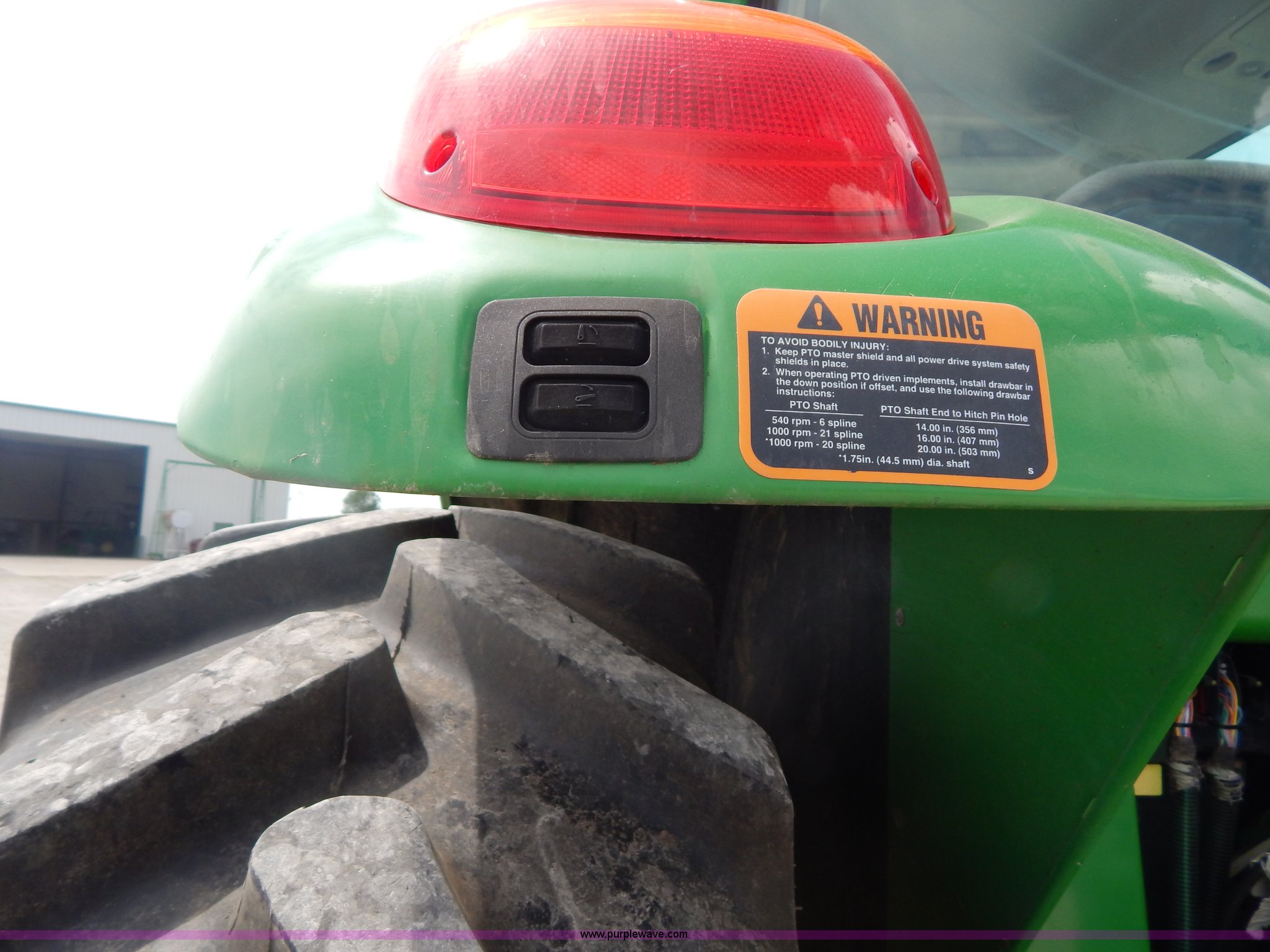 Purple Wave is selling a used Tractor in Missouri. This item is a 2005 John Deere 7520 tractor with the following: 9,101 hours on meter, John Deere 6068HRW62 six cylinder diesel engine, Serial PE6068H470596, IVT transmission, AC and heat, Tilt steering wheel, Three point, Draw bar, 540/1000 PTO, (4) rear hydraulic remotes, Front wheel assist, Front and rear work lights, Rear three point remote, 380/85R30 front tires, 430/80R42 rear tires, Suitcase weights will be removed prior to auction, Serial RW7520D036740