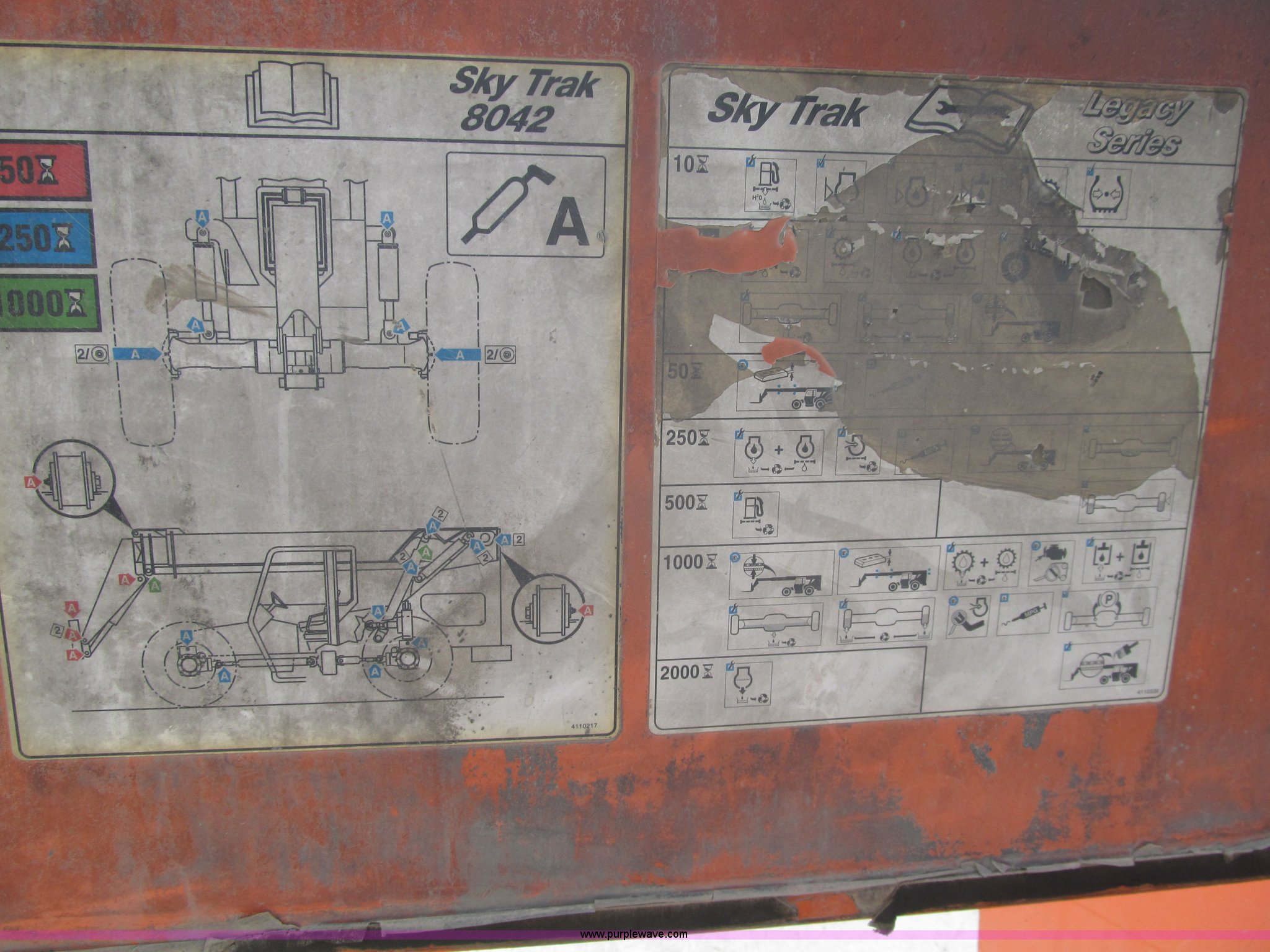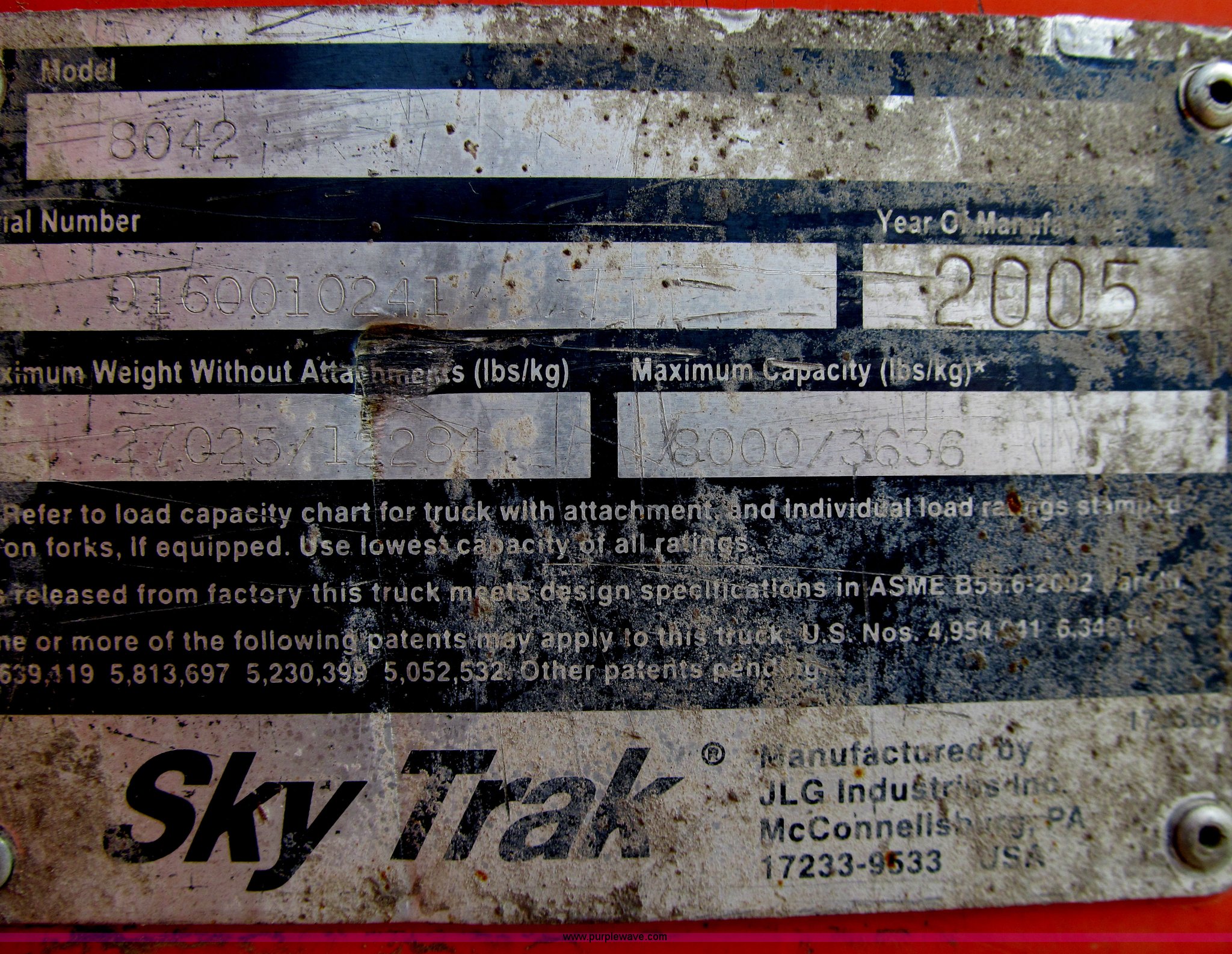 Purple Wave is selling a used Telehandler in Texas. This item is a 2005 SkyTrak 8042 telehandler with the following: 5,383 hours on meter, Cummins ZSB4.5T four cylinder diesel engine, 110 HP, Serial 30687679, Powershift transmission, 3F-3R gears, Four wheel drive, Crab steer, Circle steer, ROPS, 8,000 lbs lift capacity, 42' reach length, (2) boom sections, 48" fork length, Tilt carriage, Hydraulic leveling, 13-24 foam-filled tires, 27,025 lbs. base operating weight, Top end engine rebuild records available, Service records available, Electronic owner's, parts, and service manuals, Serial 0160010241