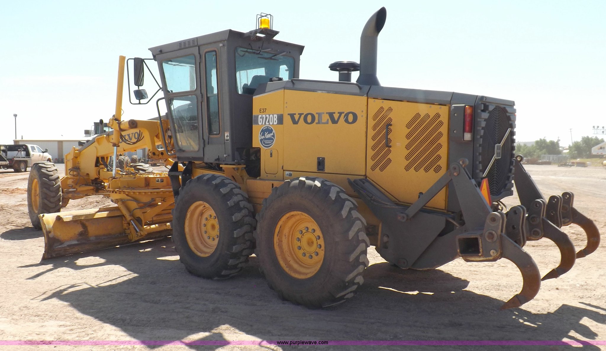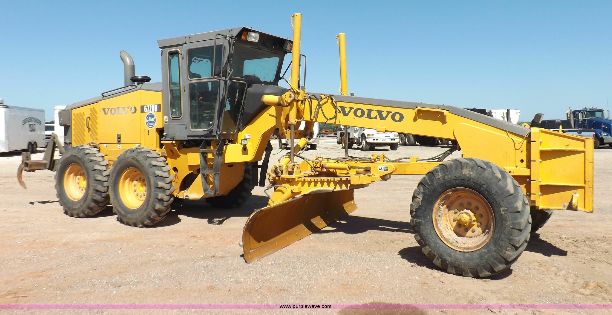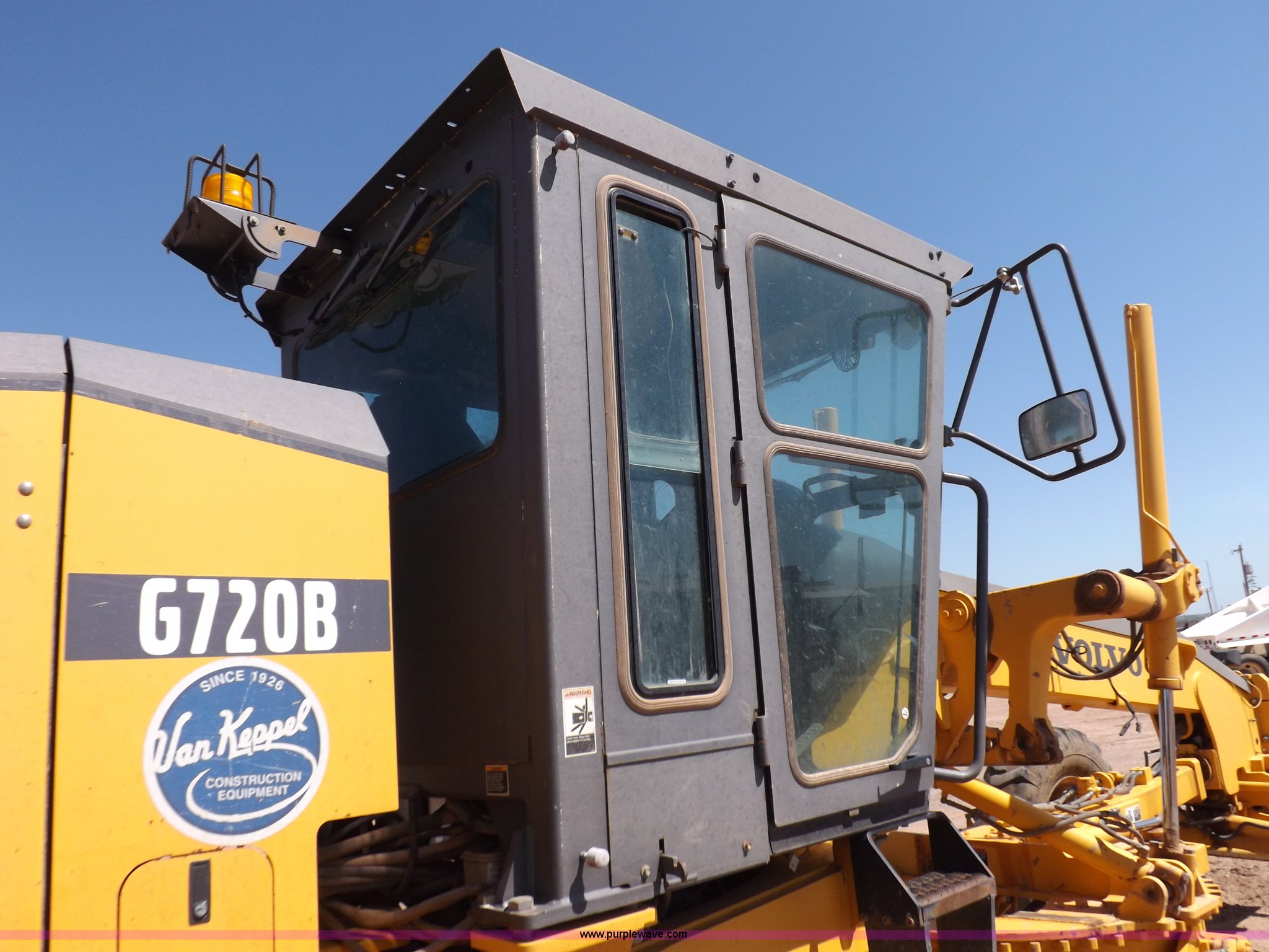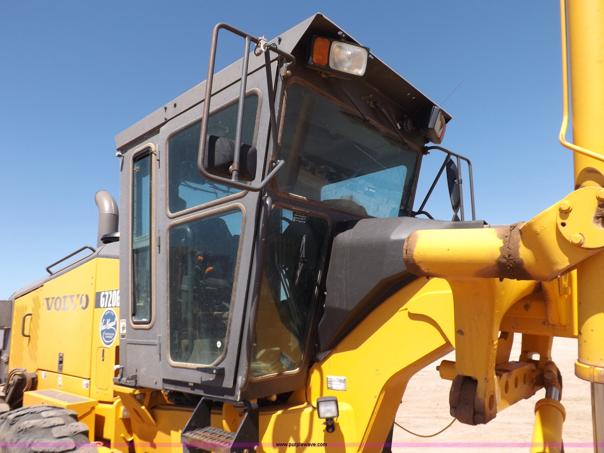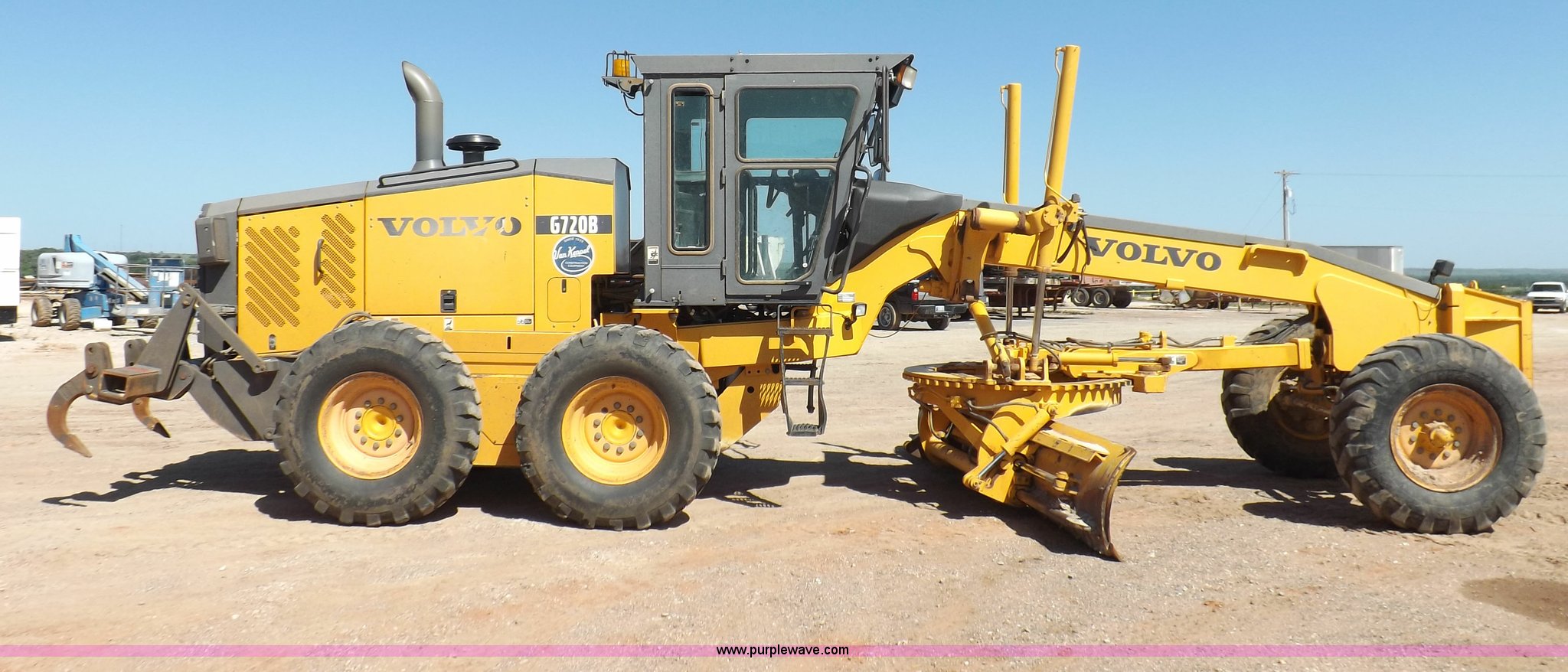 Purple Wave is selling a used Motor Grader in Oklahoma. This item is a 2003 Volvo G720B articulated motor grader with the following: 6,369 hours on meter, Unit in use, hours will vary, Volvo D7DGBE3 six cylinder diesel engine, Volvo 8400 powershift transmission, 8F-4R gears, Four wheel drive, Locking differential, Low cab profile, 62.5" interior height, EROPS, AC and heat, AM/FM/cassette, Suspension seat, Front work lights, 14' mold board, Tip control, Side shift, Front mounted push block, Volvo rear ripper, Three ripper shanks, Serial 4542-0683, 14.00-24 tires, 34,000 lbs. base operating weight, Work light damaged, Glass cracked, Passenger mirror missing, Driver's bottom step broken