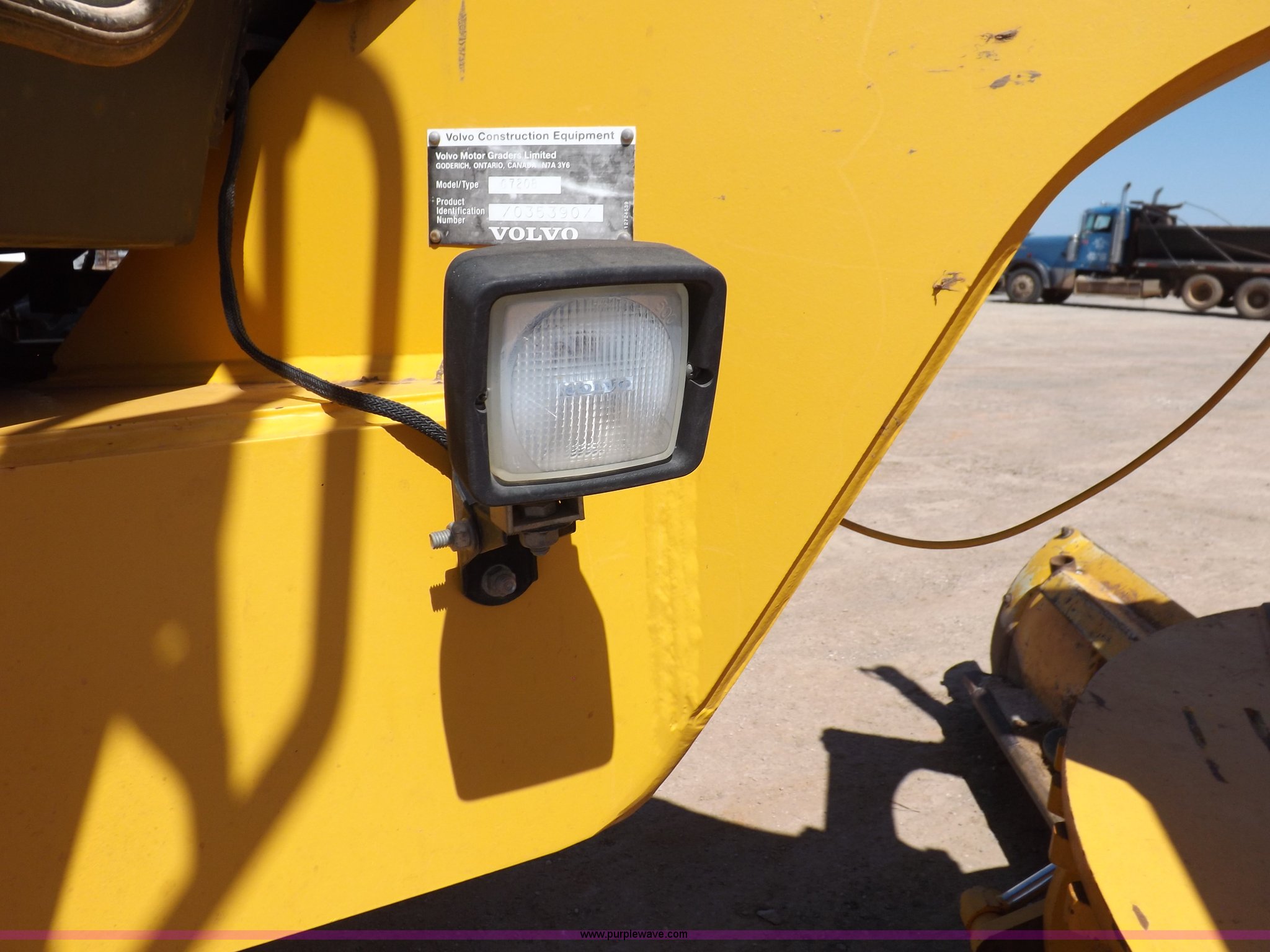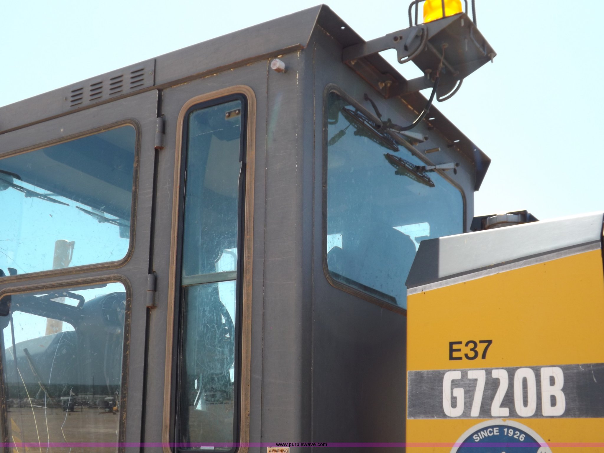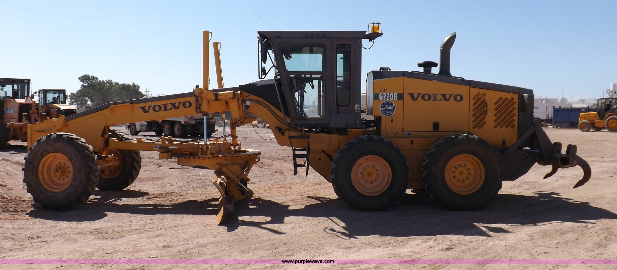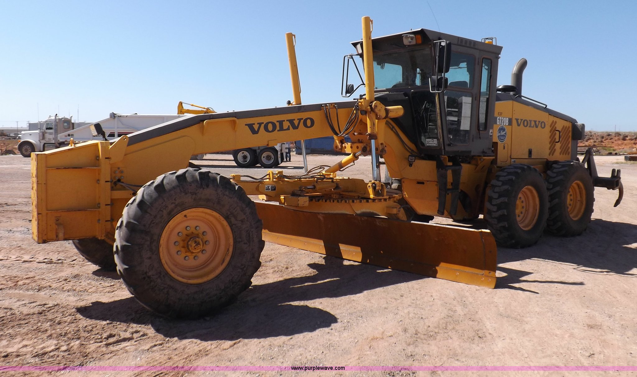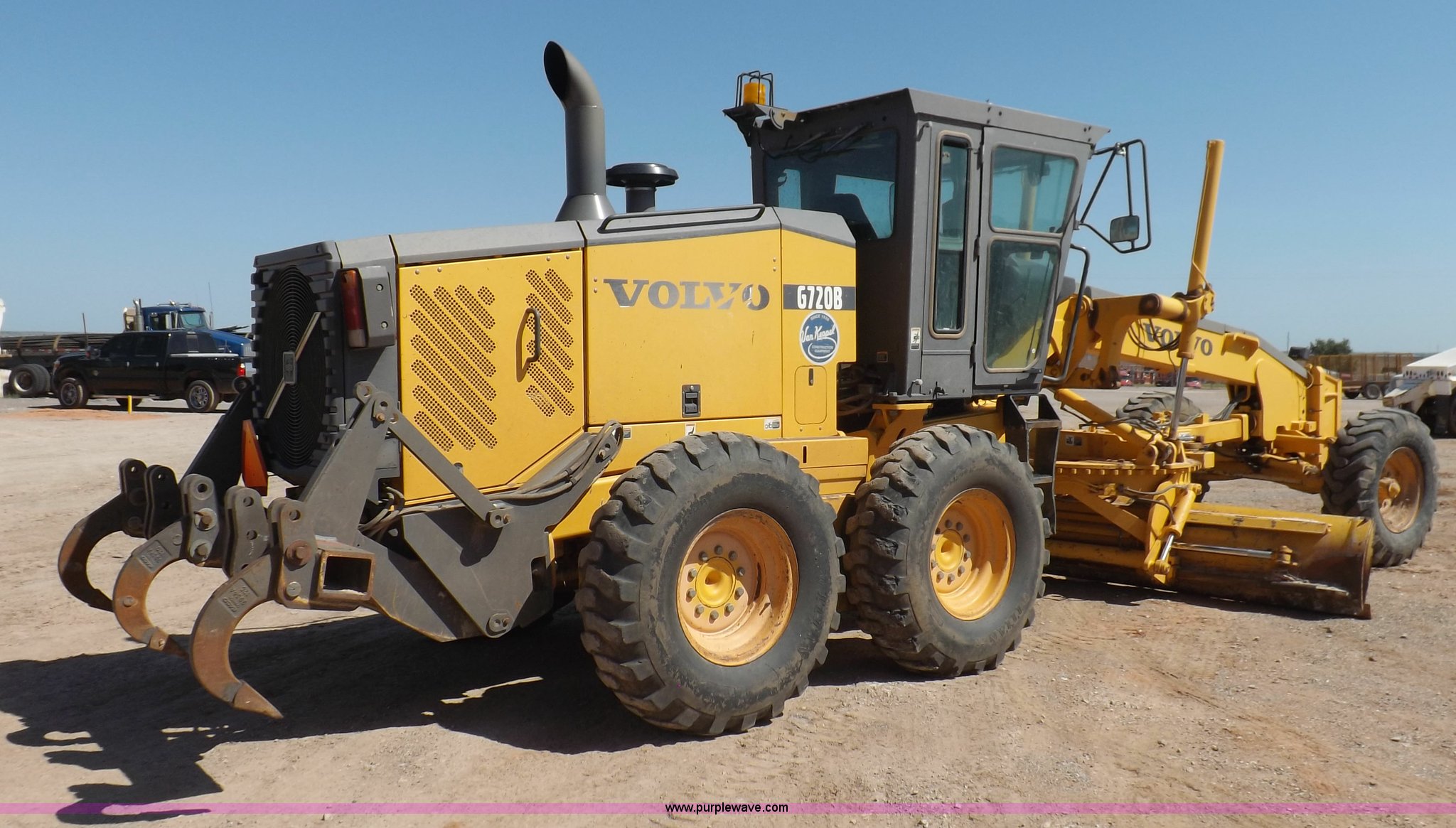Purple Wave is selling a used Motor Grader in Oklahoma. This item is a 2003 Volvo G720B articulated motor grader with the following: 6,369 hours on meter, Unit in use, hours will vary, Volvo D7DGBE3 six cylinder diesel engine, Volvo 8400 powershift transmission, 8F-4R gears, Four wheel drive, Locking differential, Low cab profile, 62.5" interior height, EROPS, AC and heat, AM/FM/cassette, Suspension seat, Front work lights, 14' mold board, Tip control, Side shift, Front mounted push block, Volvo rear ripper, Three ripper shanks, Serial 4542-0683, 14.00-24 tires, 34,000 lbs. base operating weight, Work light damaged, Glass cracked, Passenger mirror missing, Driver's bottom step broken