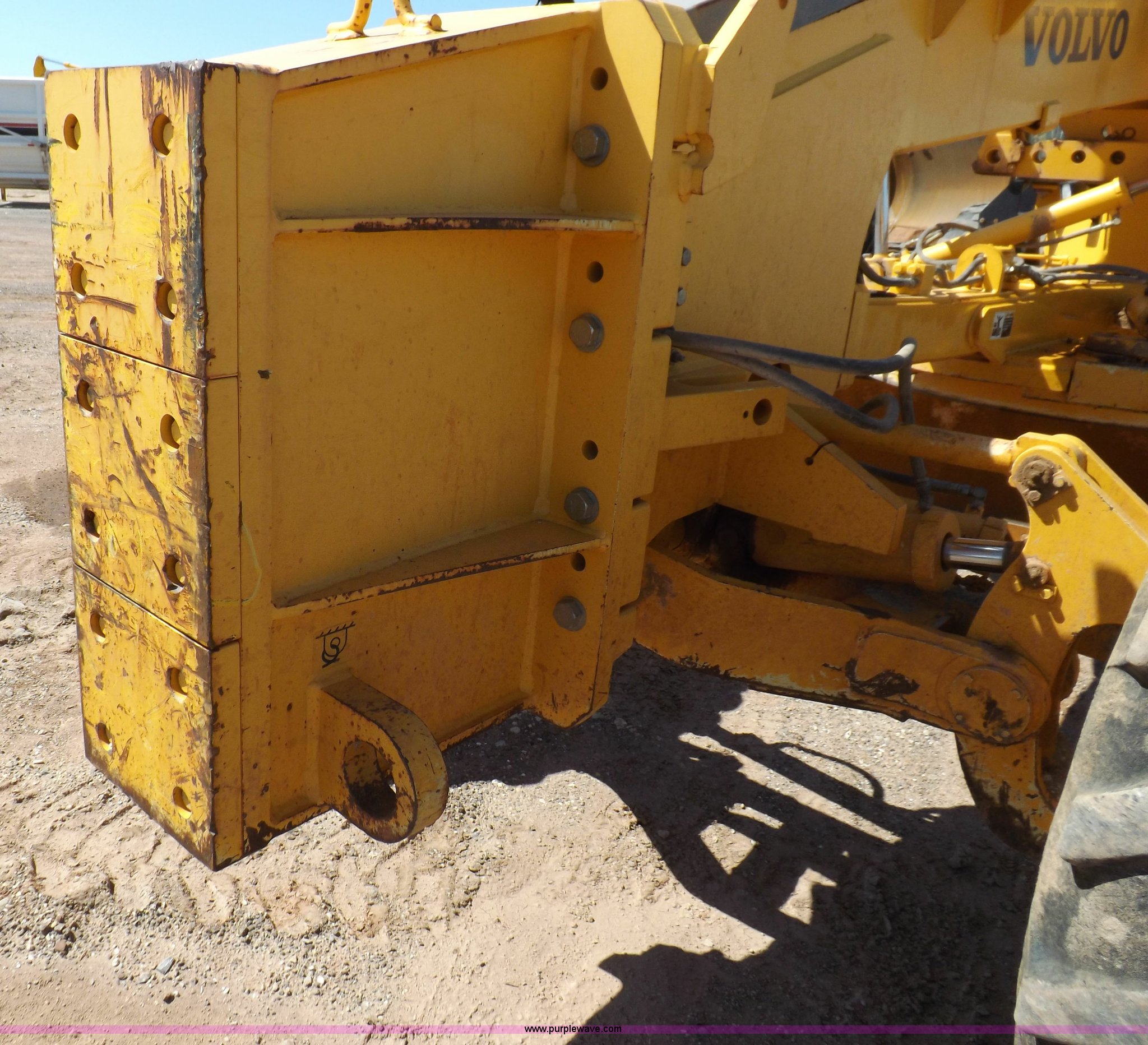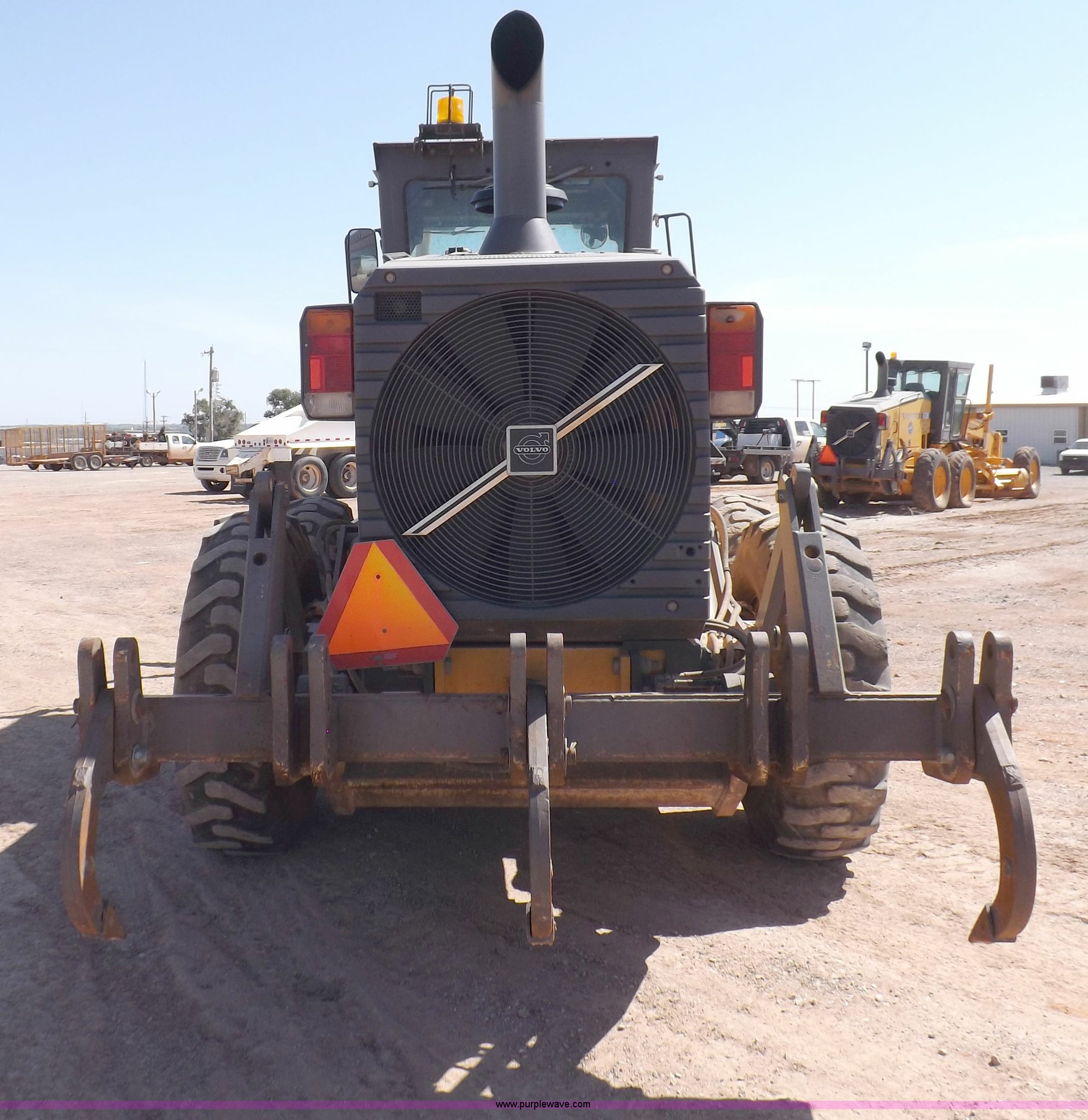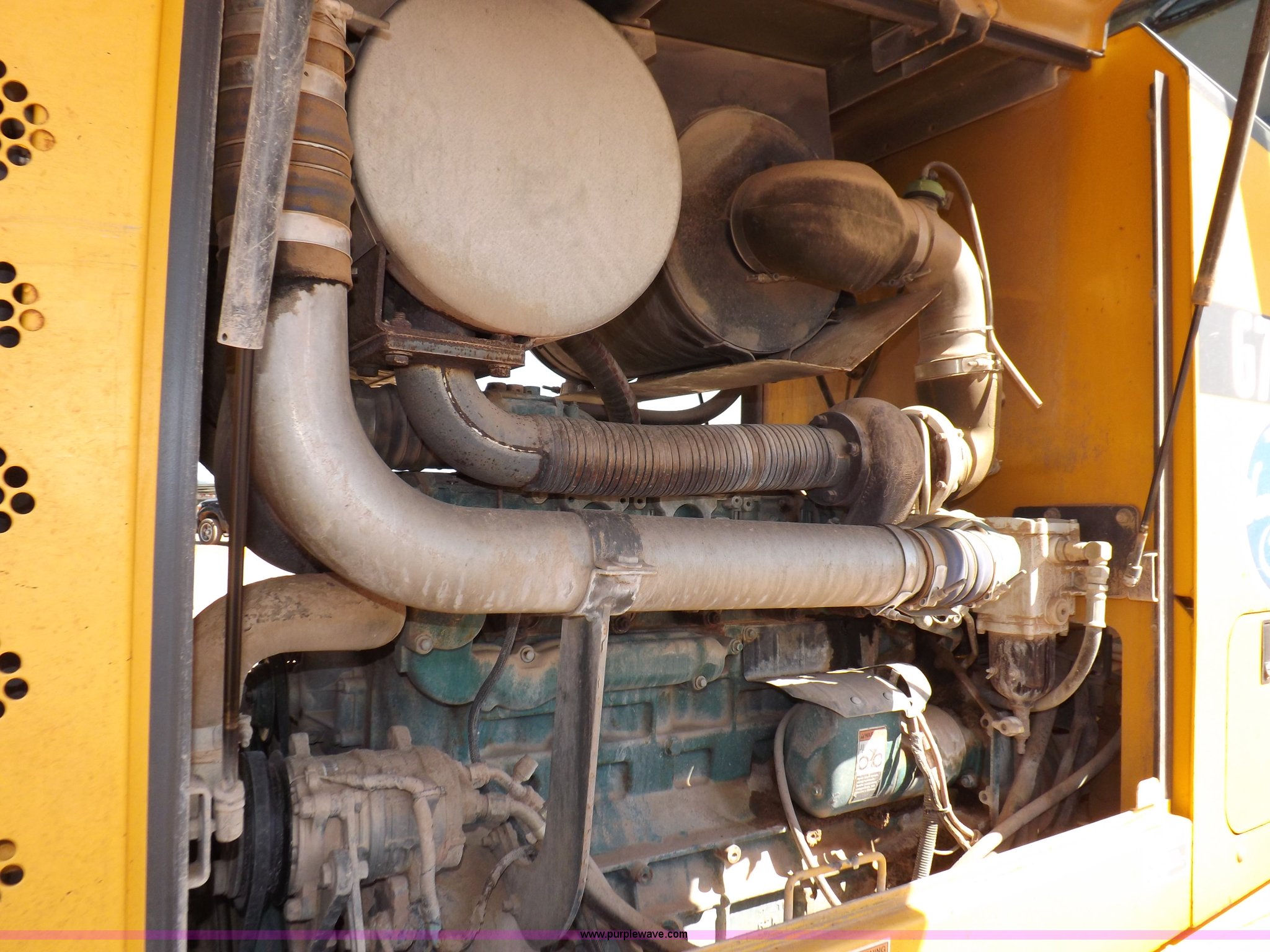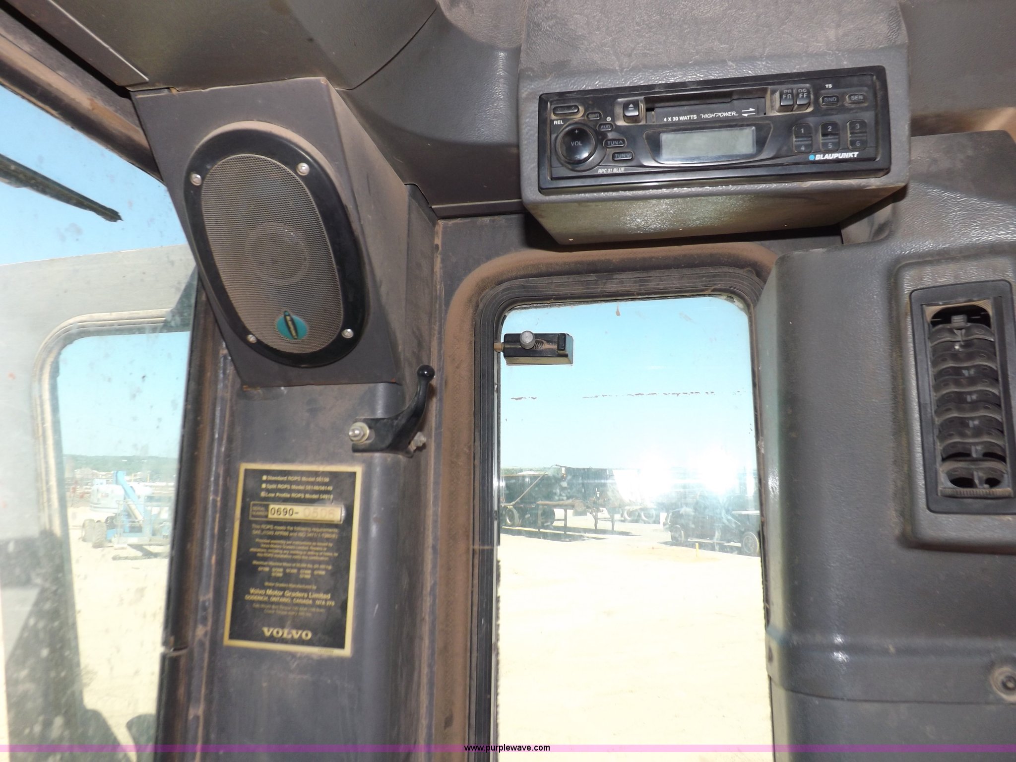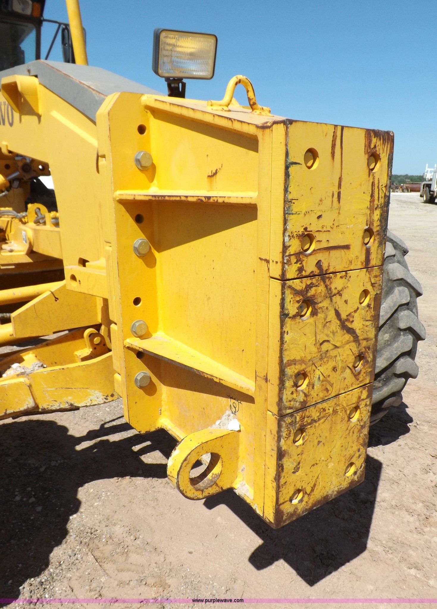 Purple Wave is selling a used Motor Grader in Oklahoma. This item is a 2003 Volvo G720B articulated motor grader with the following: 6,369 hours on meter, Unit in use, hours will vary, Volvo D7DGBE3 six cylinder diesel engine, Volvo 8400 powershift transmission, 8F-4R gears, Four wheel drive, Locking differential, Low cab profile, 62.5" interior height, EROPS, AC and heat, AM/FM/cassette, Suspension seat, Front work lights, 14' mold board, Tip control, Side shift, Front mounted push block, Volvo rear ripper, Three ripper shanks, Serial 4542-0683, 14.00-24 tires, 34,000 lbs. base operating weight, Work light damaged, Glass cracked, Passenger mirror missing, Driver's bottom step broken