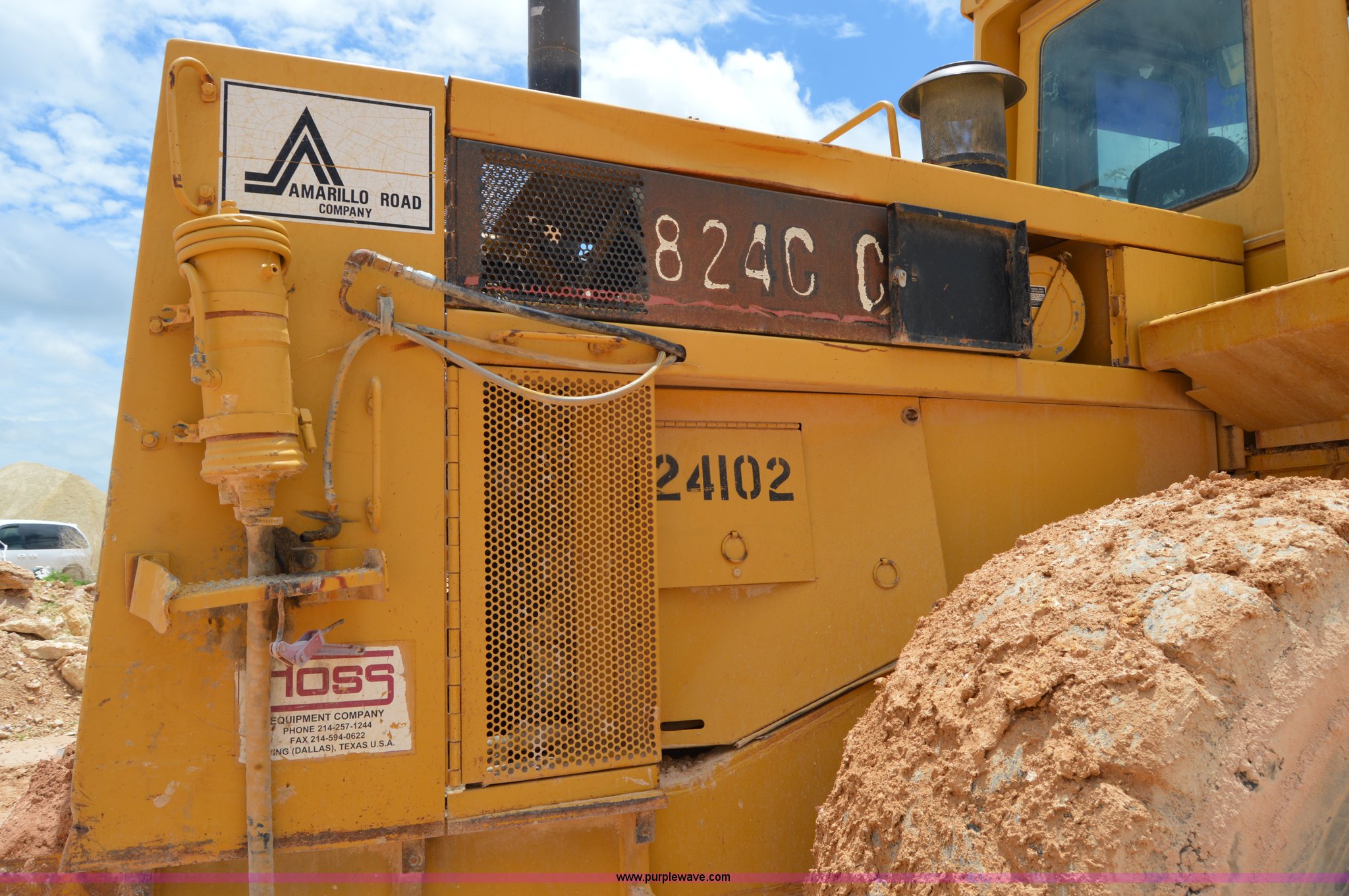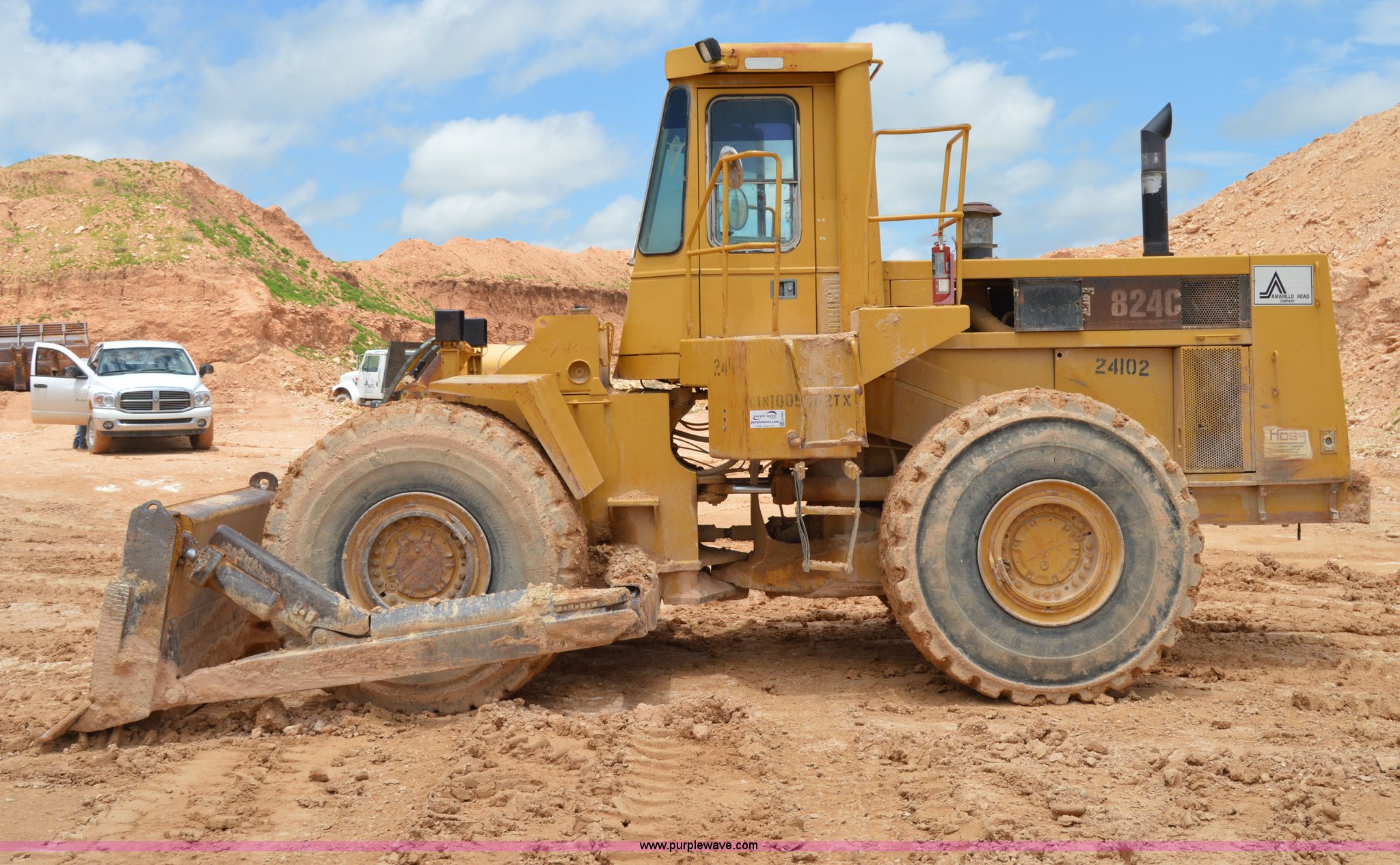 1979 Caterpillar 824C wheel dozer. Unknown hours on meter, Caterpillar six cylinder turbo diesel engine, Four speed shuttle shift transmission, Enclosed cab, Two stick blade control, Front and rear work lights, 13.5'W four way blade, 29.5R25 tires, 58,433 lbs. base operating weight, Serial 85X401, Unit# 24102. Amarillo Road Company. County Road 149. Lockney, TX 79241