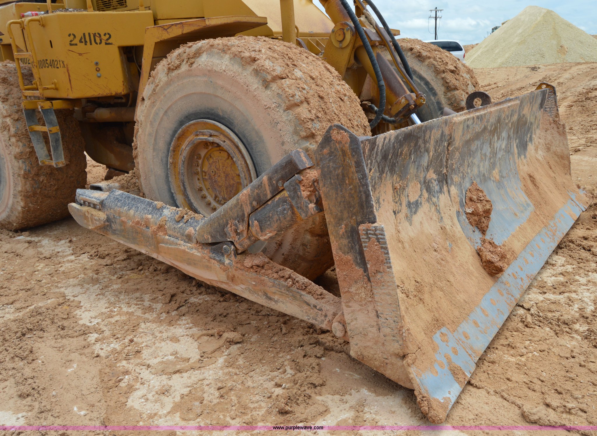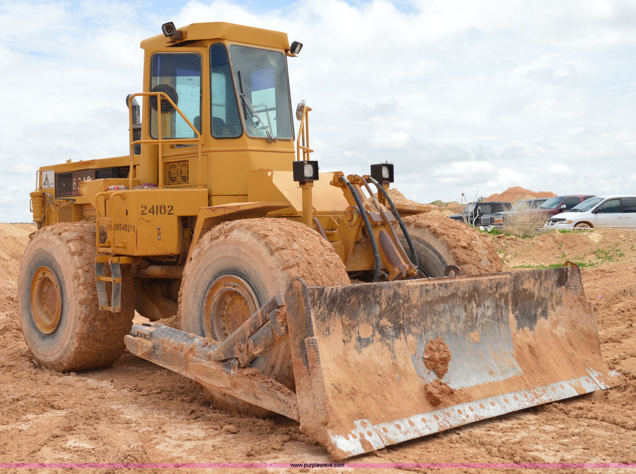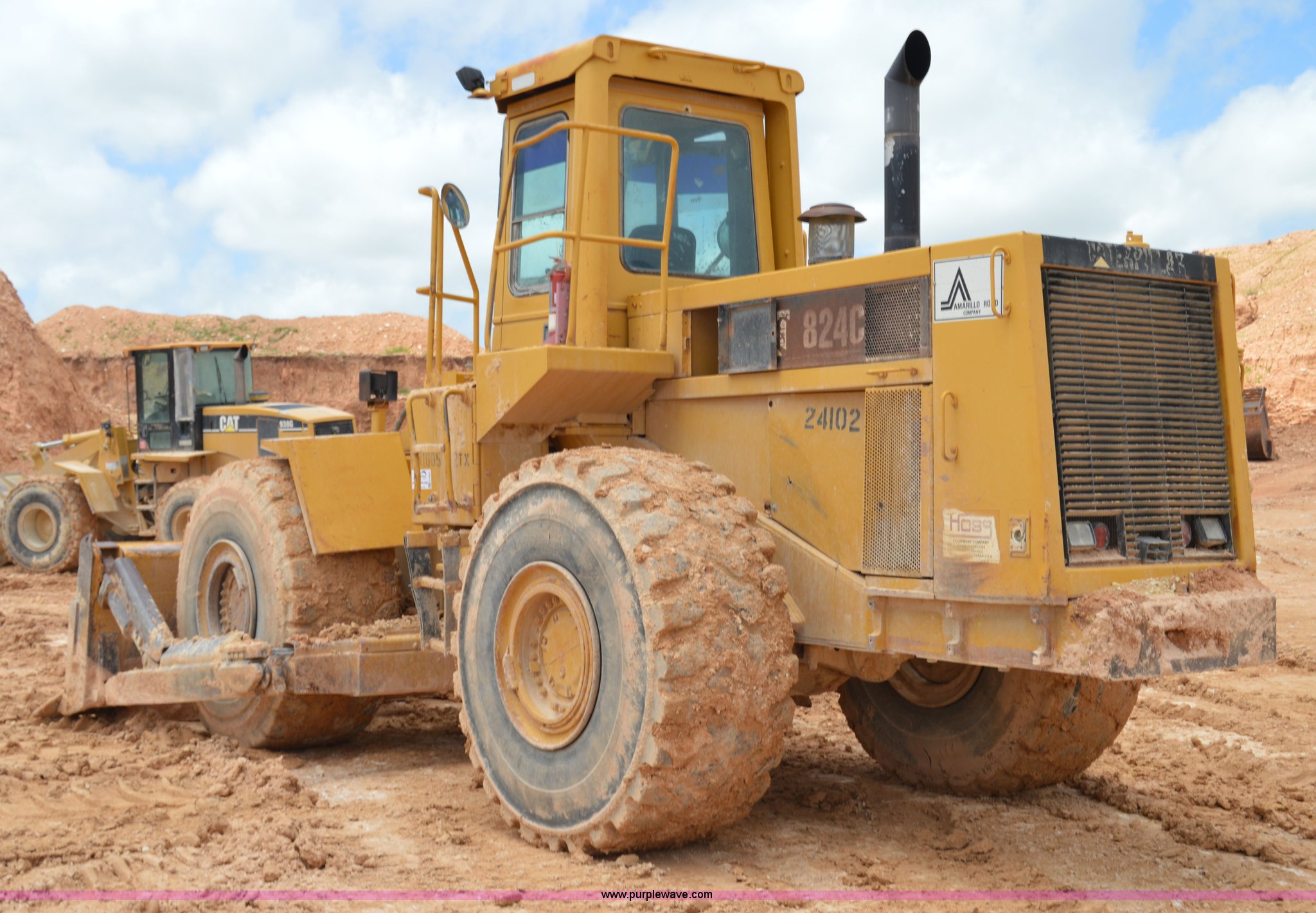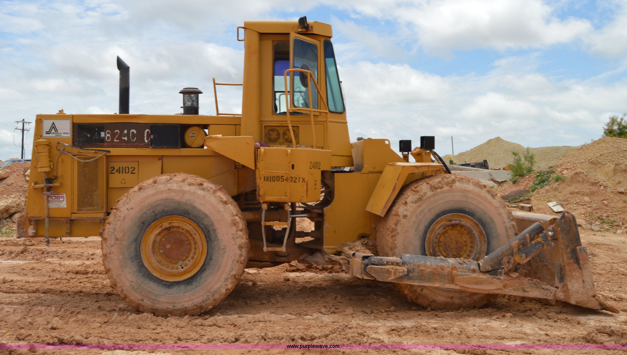 Purple Wave is selling a used Wheel Dozer in Texas. This item is a 1979 Caterpillar 824C wheel dozer with the following: Unknown hours on meter, Caterpillar six cylinder turbo diesel engine, Four speed shuttle shift transmission, Enclosed cab, Two stick blade control, Front and rear work lights, 13.5'W four way blade, 29.5R25 tires, 58,433 lbs. base operating weight, Serial 85X401, Unit# 24102