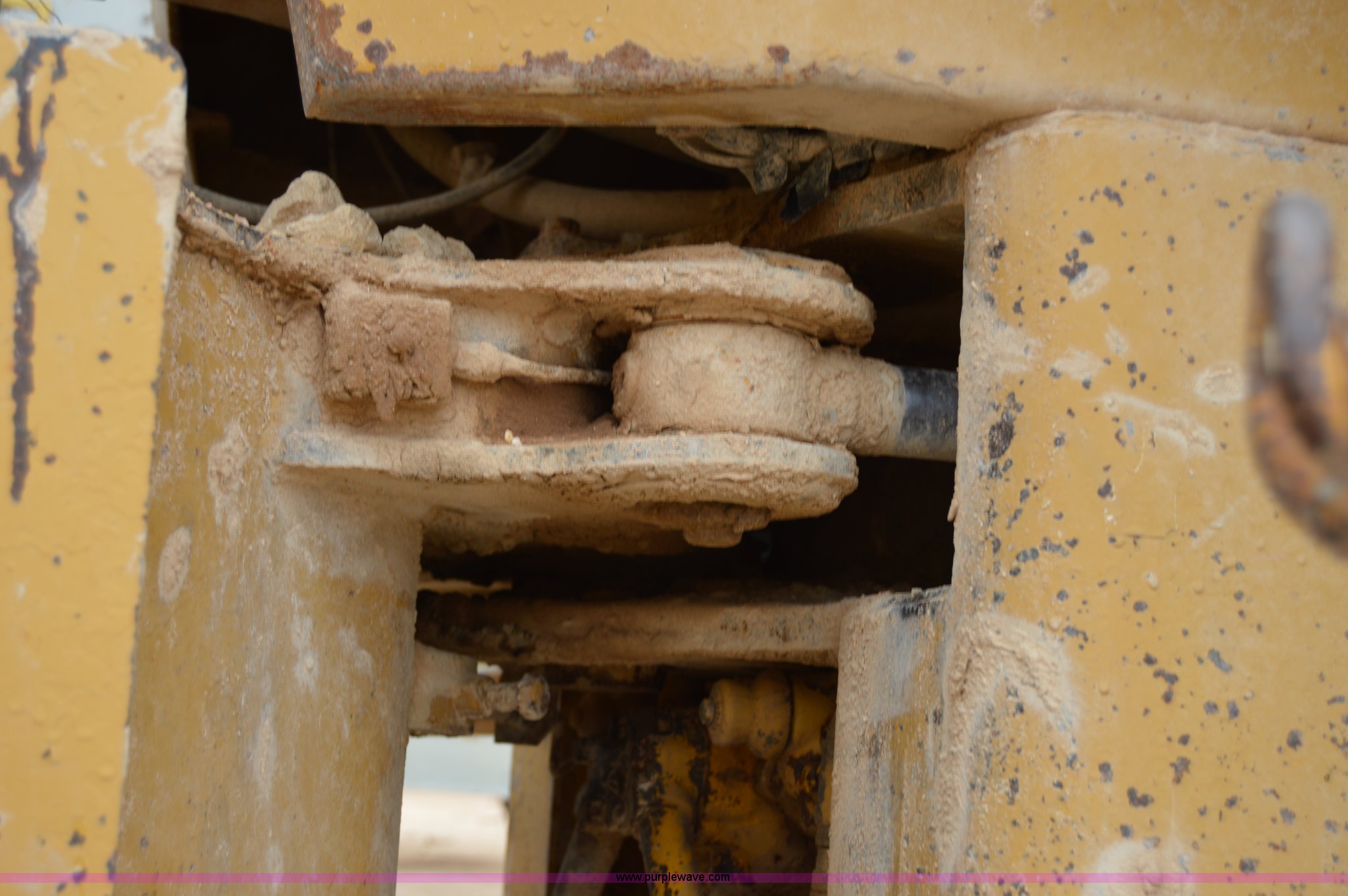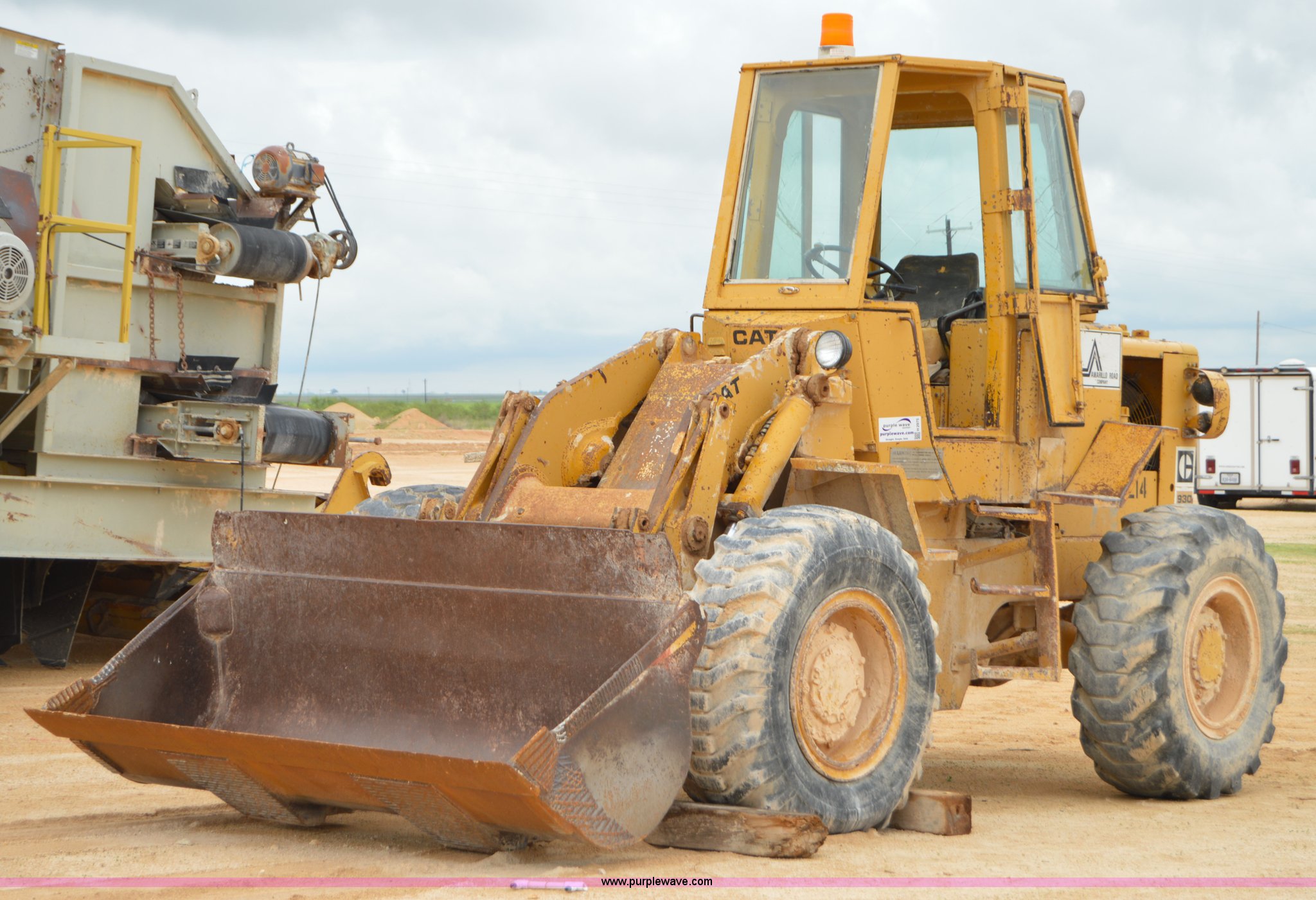 1970 Caterpillar 930 wheel loader. Caterpillar four cylinder diesel engine, Four speed shuttle shift transmission, Enclosed cab, Two stick loader control, 8'W bucket Smooth cutting edge, Pin hitch, 17.5-25 tires, 19,768 lbs. base operating weight, Cab glass broken, Battery dead, Serial 41K1002, Unit# 8214. Amarillo Road Company. County Road 149. Lockney, TX 79241
