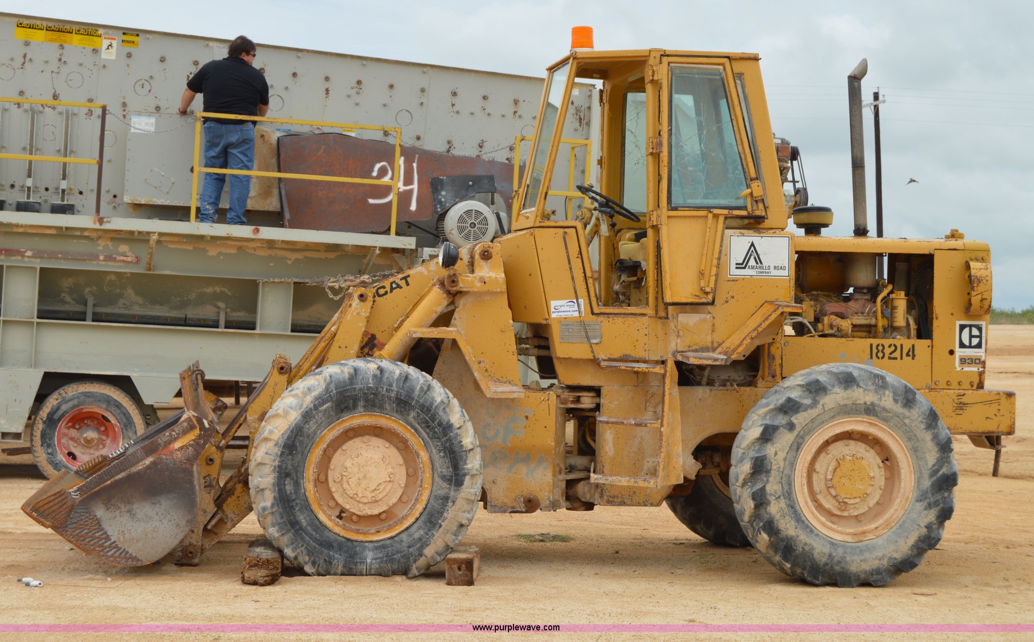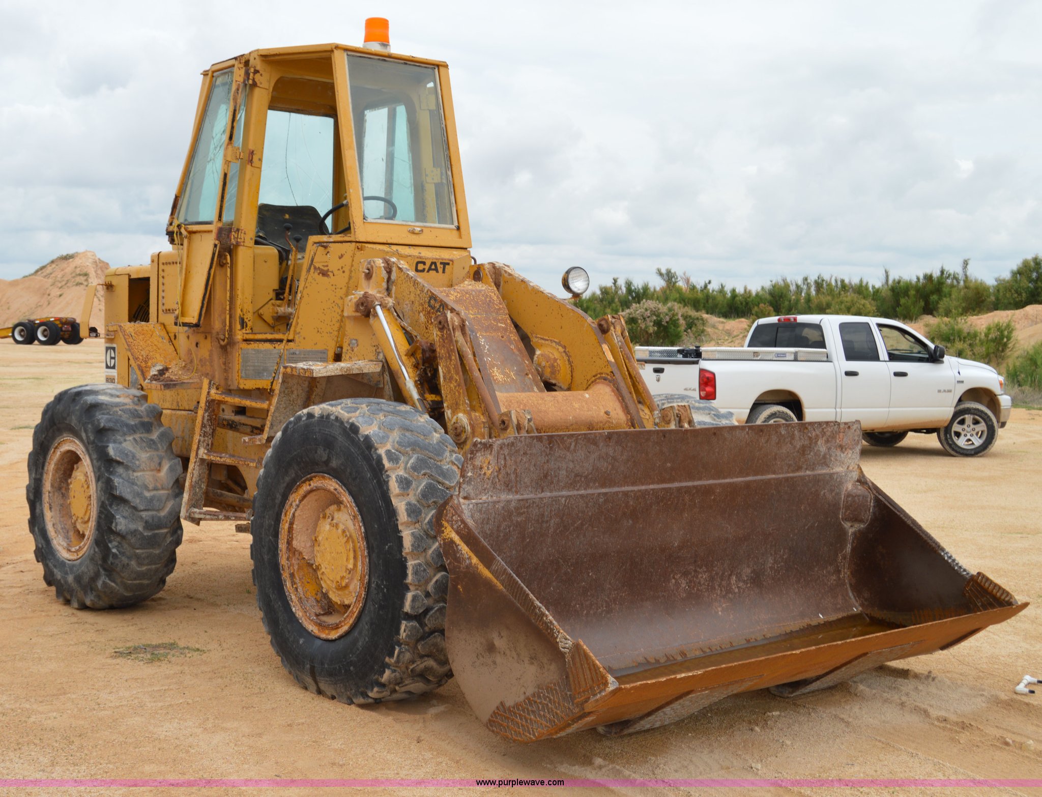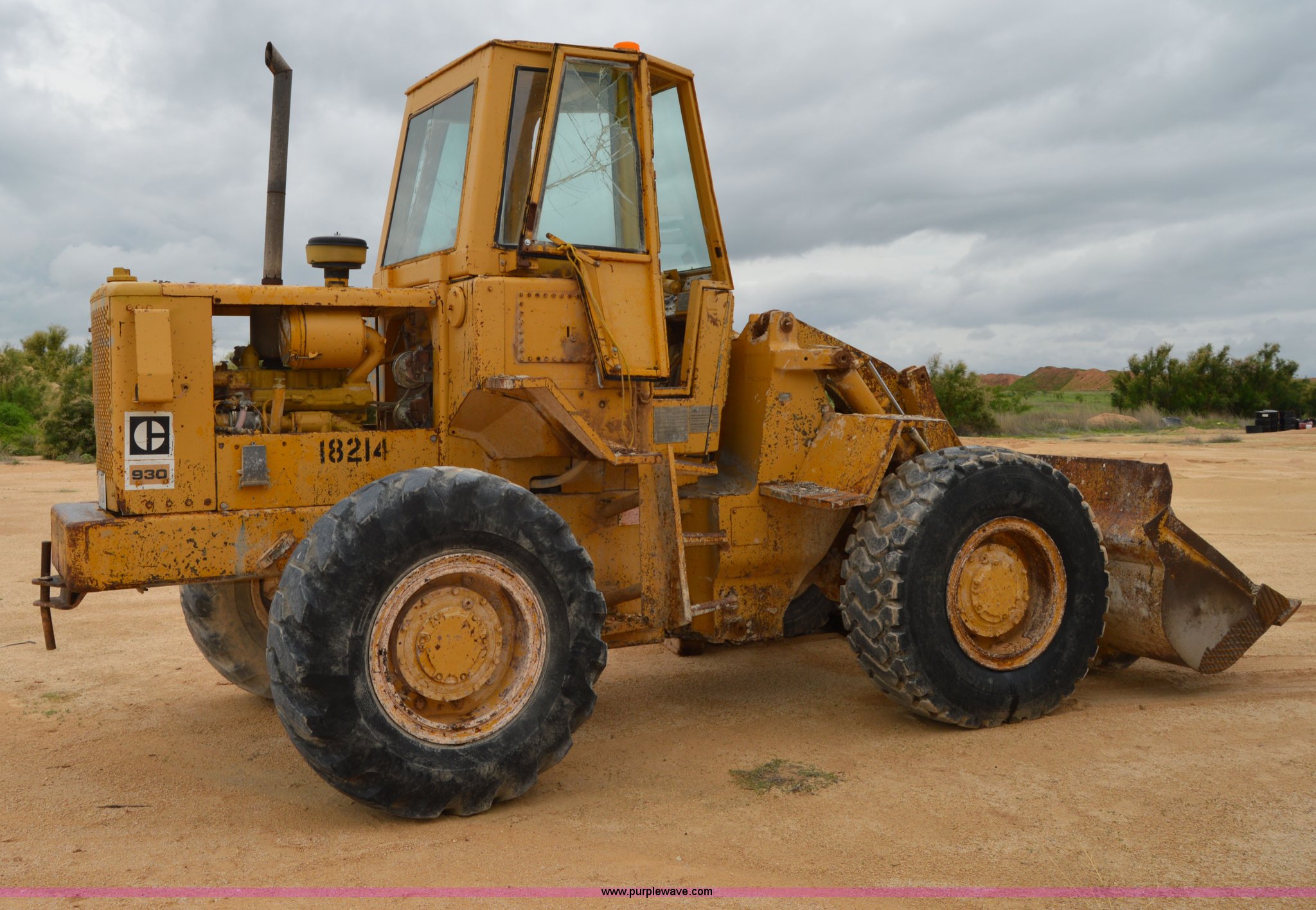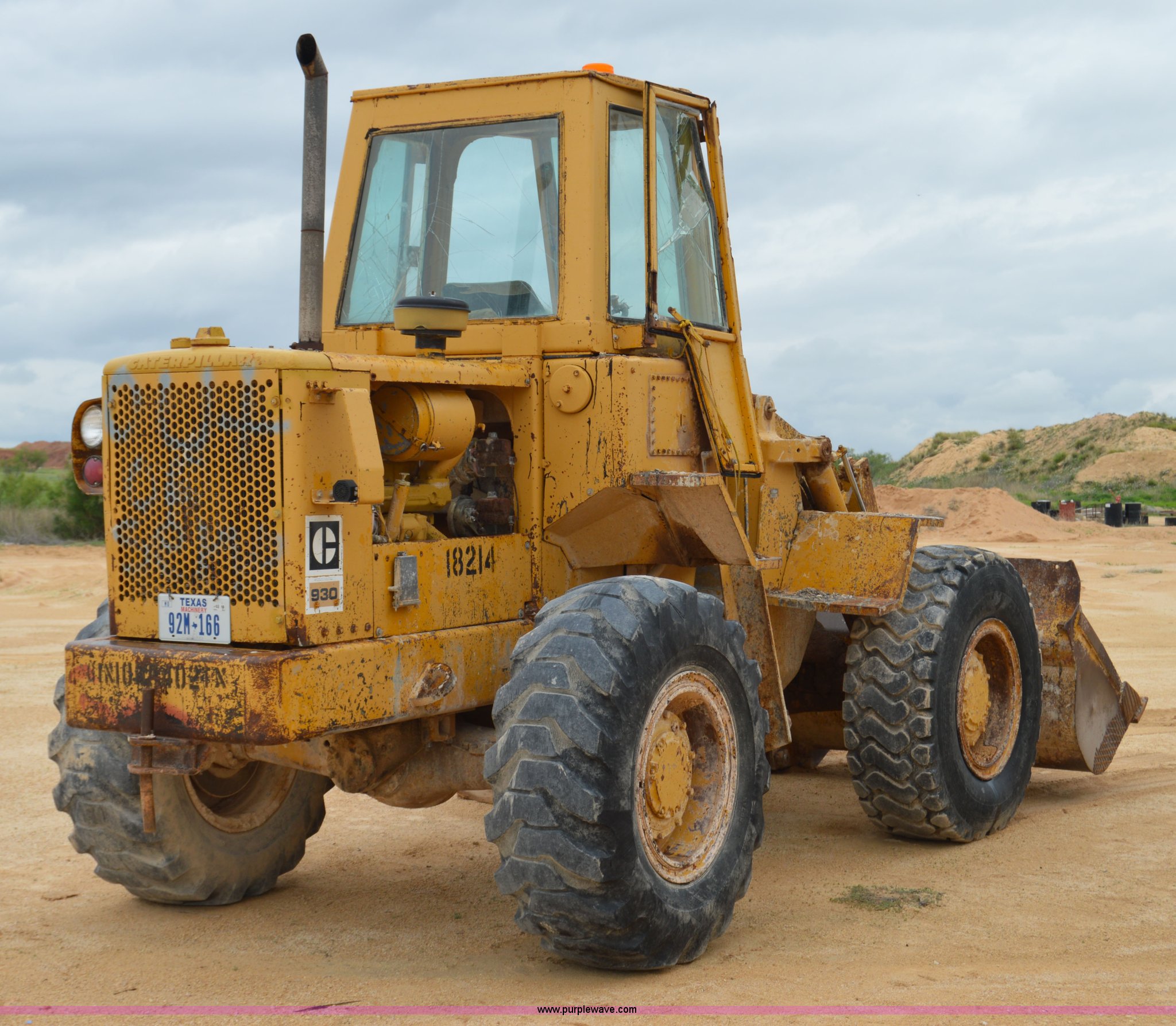 Purple Wave is selling a used Wheel Loader in Texas. This item is a 1970 Caterpillar 930 wheel loader with the following: Caterpillar four cylinder diesel engine, Four speed shuttle shift transmission, Enclosed cab, Two stick loader control, 8'W bucket, Smooth cutting edge, Pin hitch, 17.5-25 tires, 19,768 lbs. base operating weight, Cab glass broken, Battery dead, Serial 41K1002, Unit# 8214