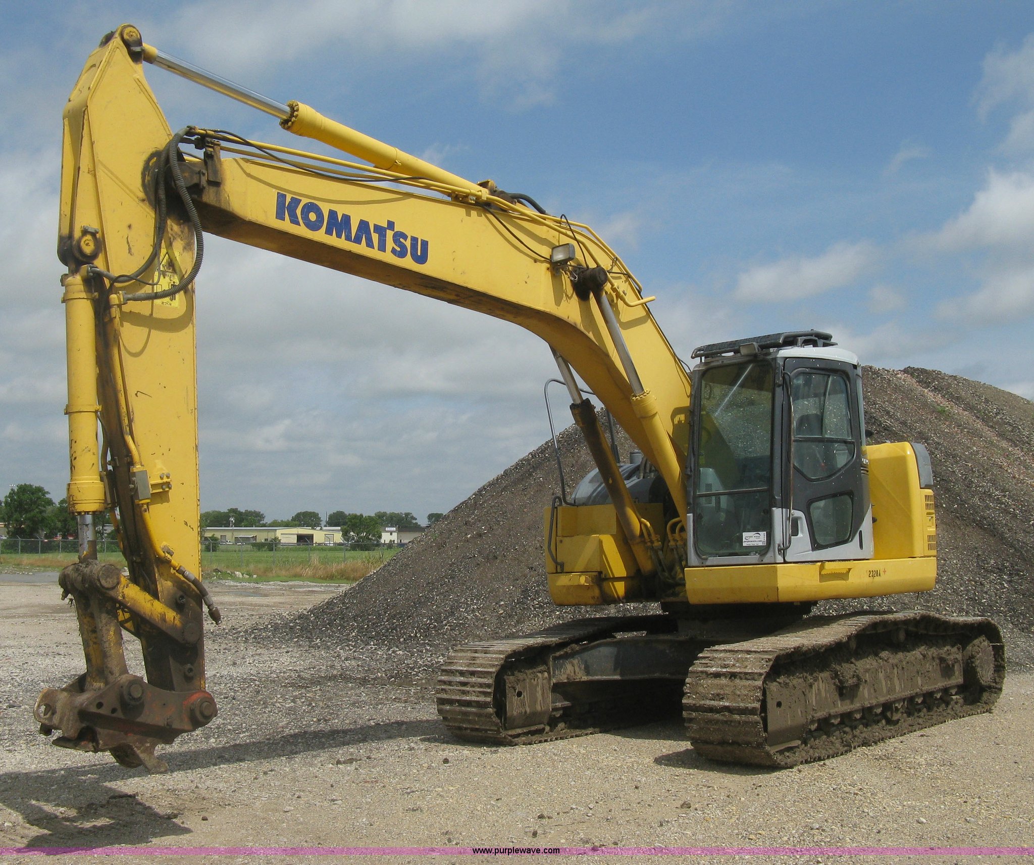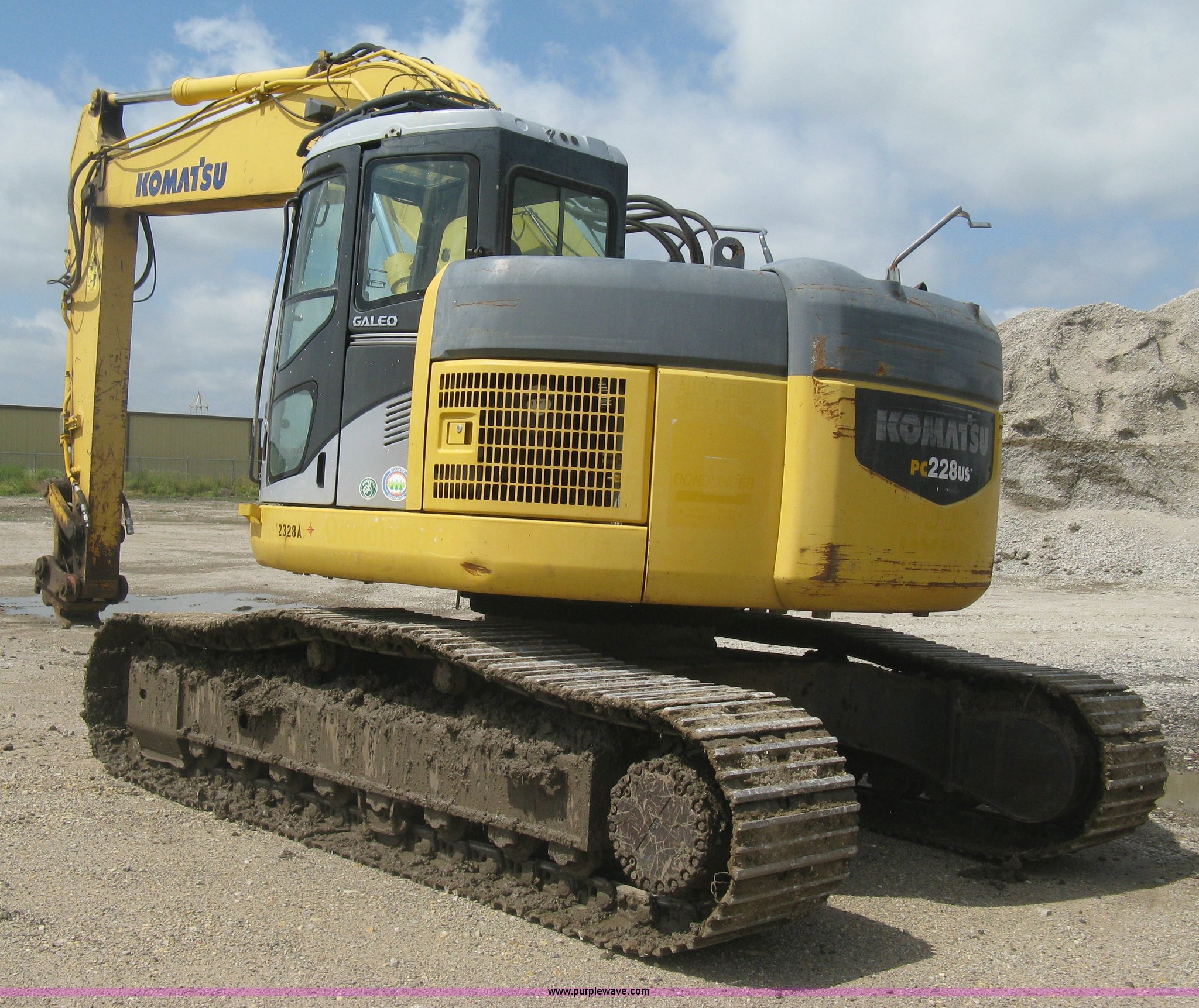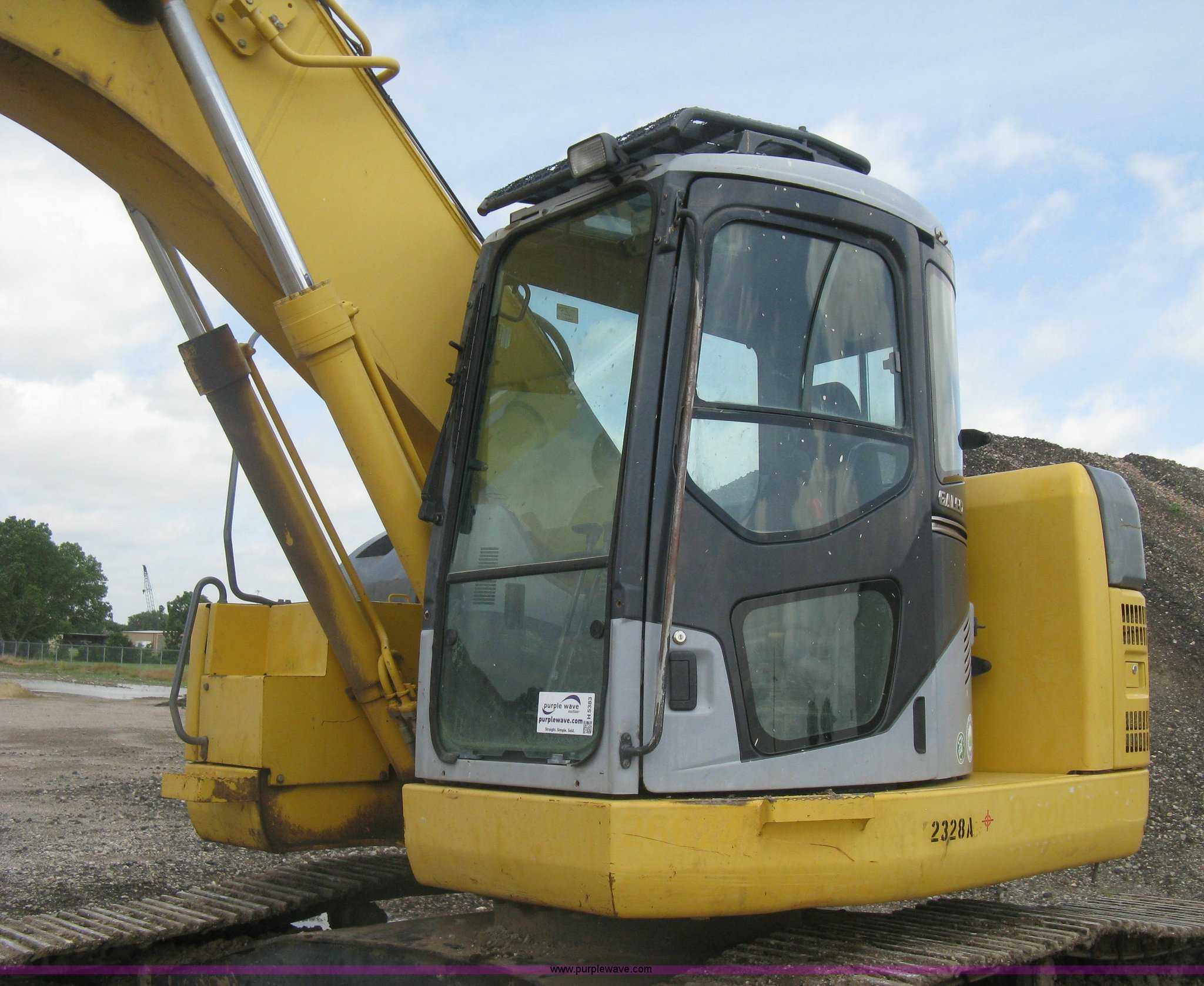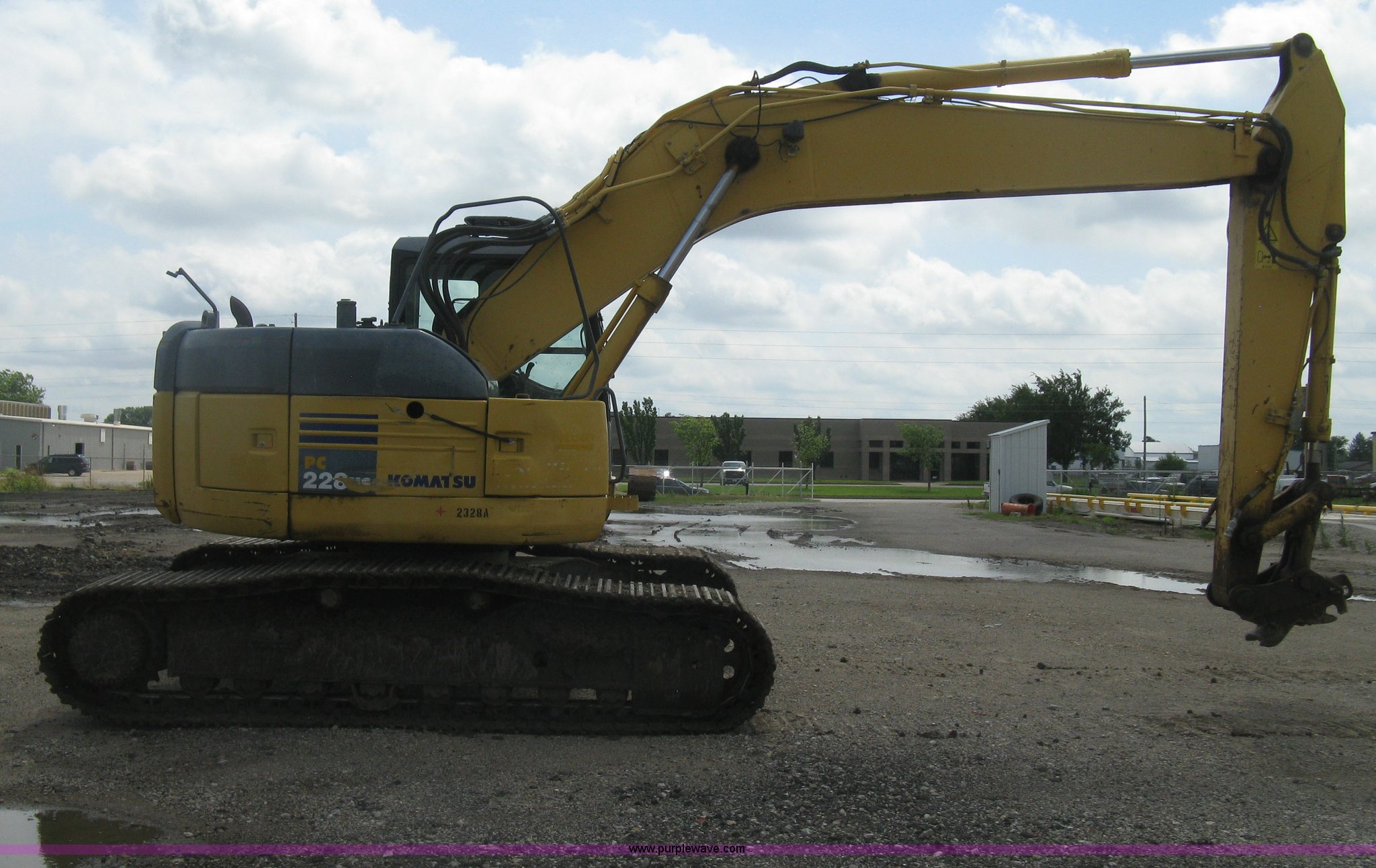 Purple Wave is selling a used Hydraulic Excavator in Kansas. This item is a 2003 Komatsu PC228US-3 excavator with the following: 10,262 hours on meter, Komatsu SAA6D102E-2-A 5.9L six cylinder diesel engine, 150 HP, Serial 26287631, Hydrostatic transmission, Two speed travel, ROPS, AC and heat, AM/FM, Air suspension seat, Windshield wipers, Joystick controls, Foot controls, Front work lights, Standard boom, 9.5' stick length, Hydraulic quick coupler, Auxiliary hydraulics, High flow, Rear counter weights, Eight bottom rollers, 24"W steel triple grouser track pads, Exterior cosmetic body damage, (3) broken bolts on right side under carriage idlers, One main boom cylinder seeping, Serial 20899, Unit# 2328A