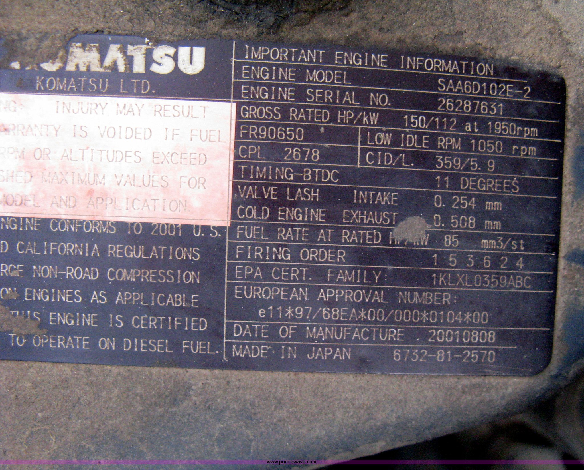 - Komatsu SAA6D102E-2-A 5.9L six cylinder diesel engine