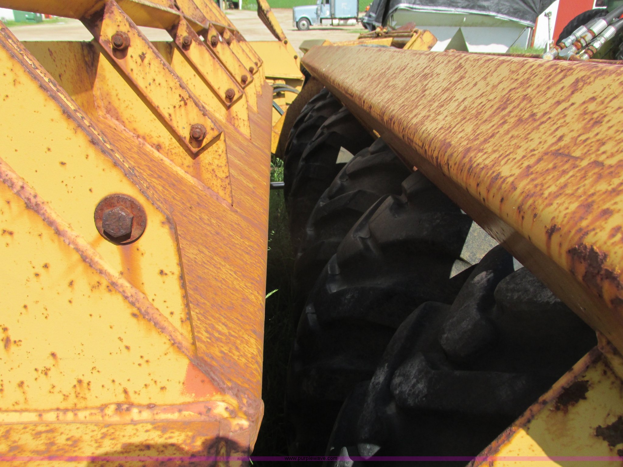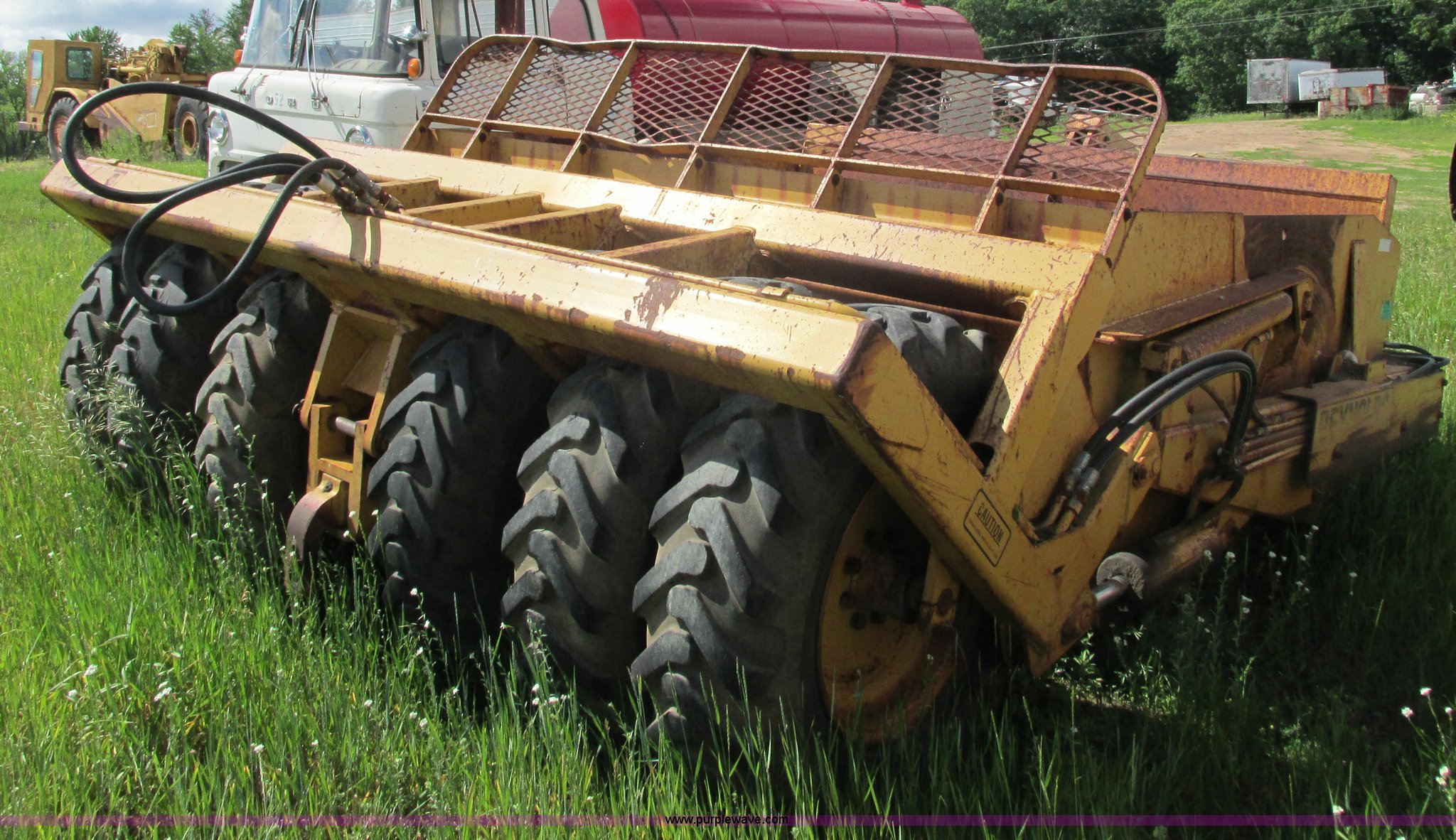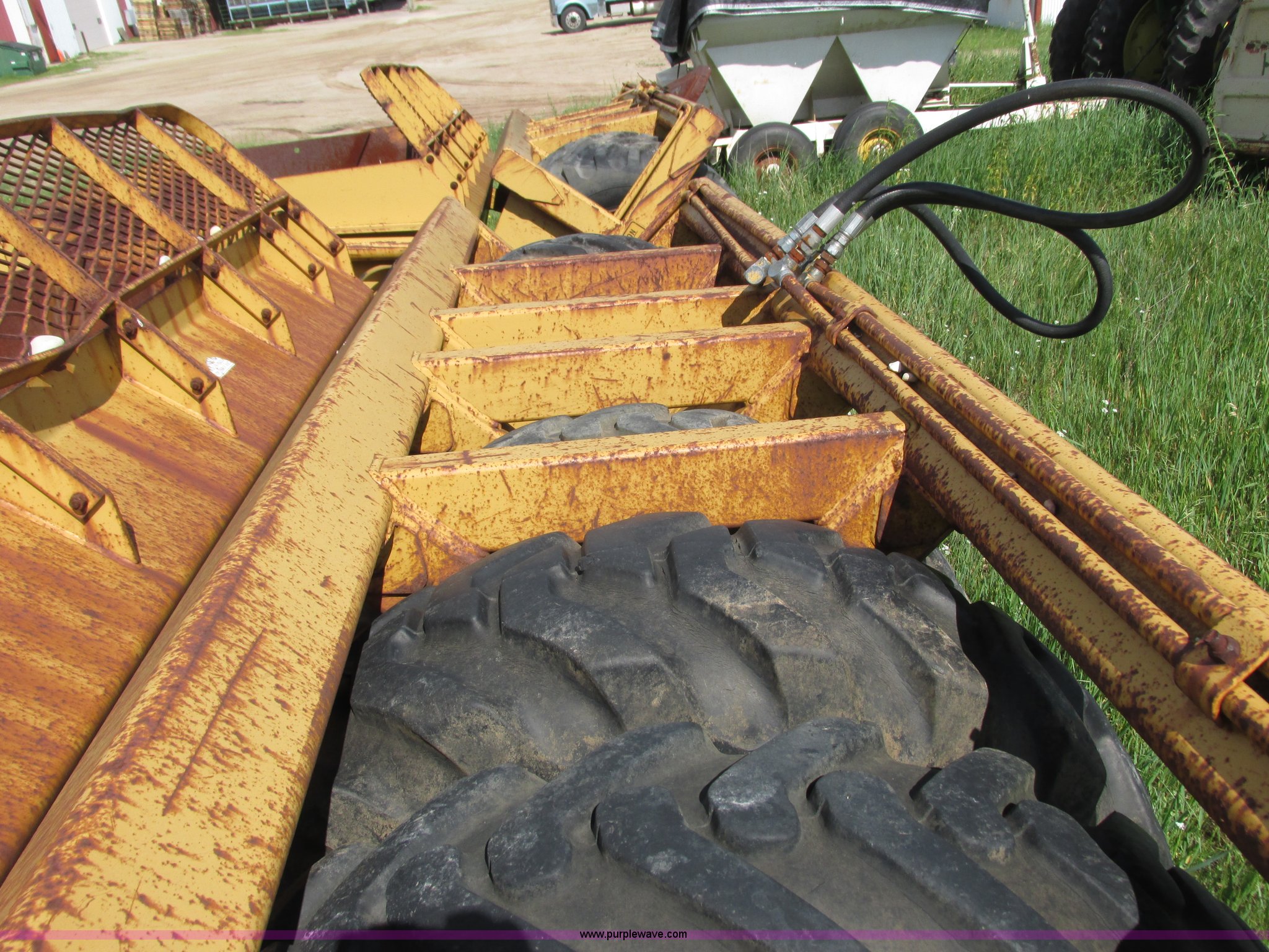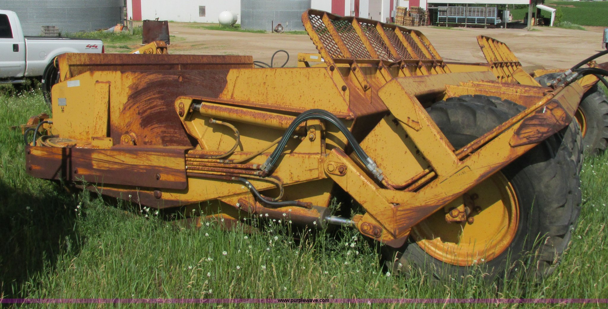 Purple Wave is selling a used Pull Type Scraper in Wisconsin. This item is a Reynolds 14C hydraulic pull scraper with the following: 14 cubic yard capacity, Bolt-on cutting edge, Plumbed to pull in tandem, Rear hitch, (6) 13.00-24TG tires, Serial 28203