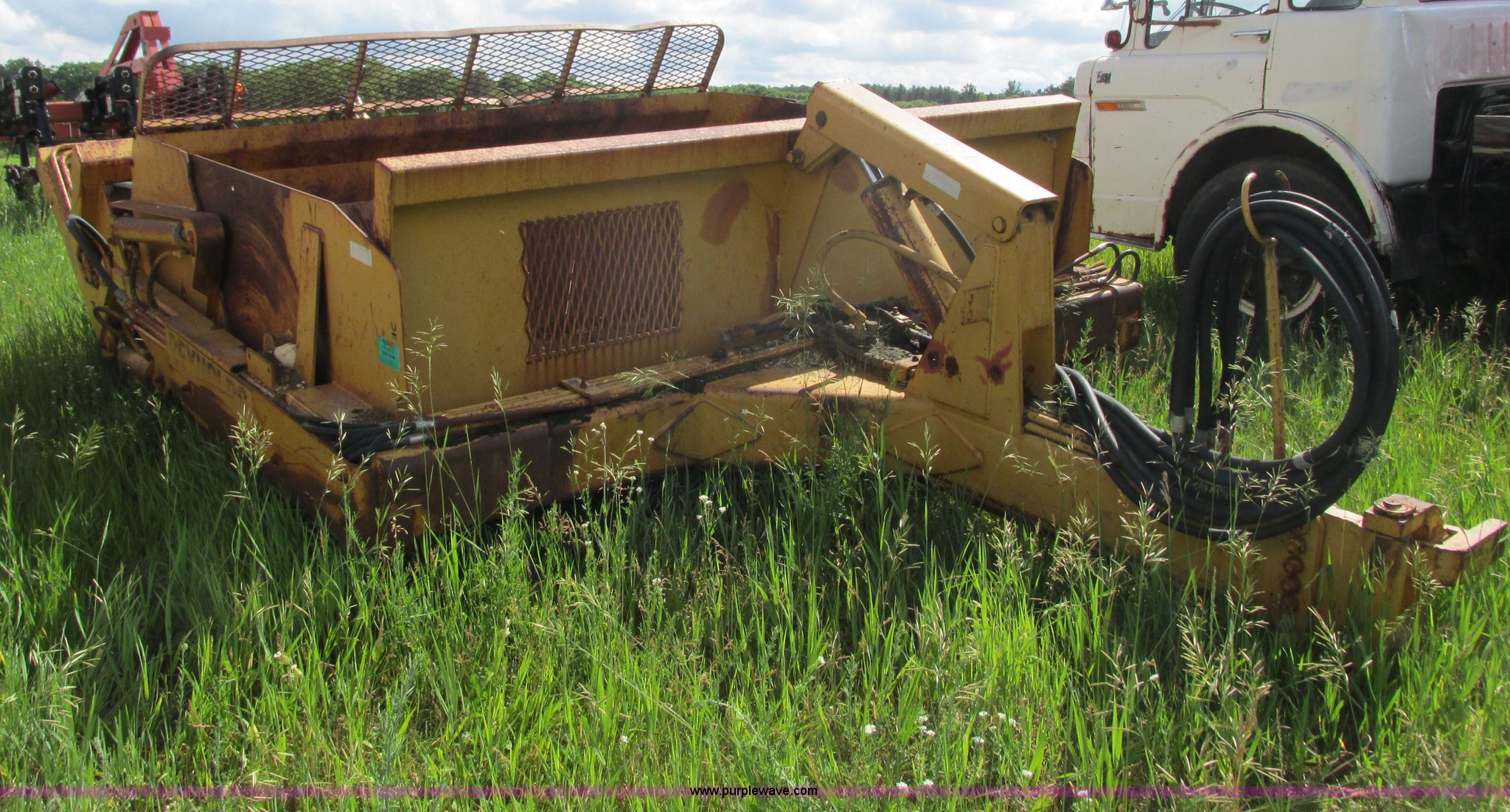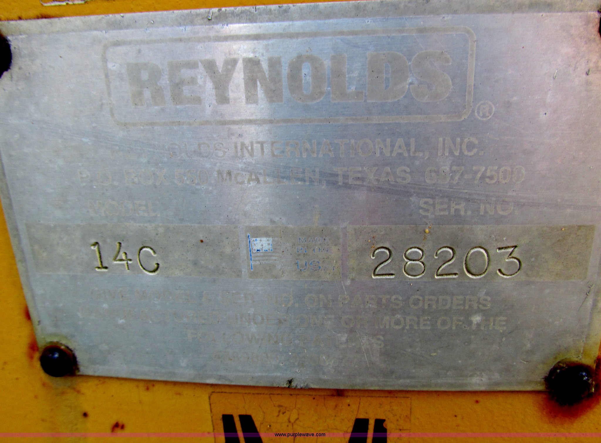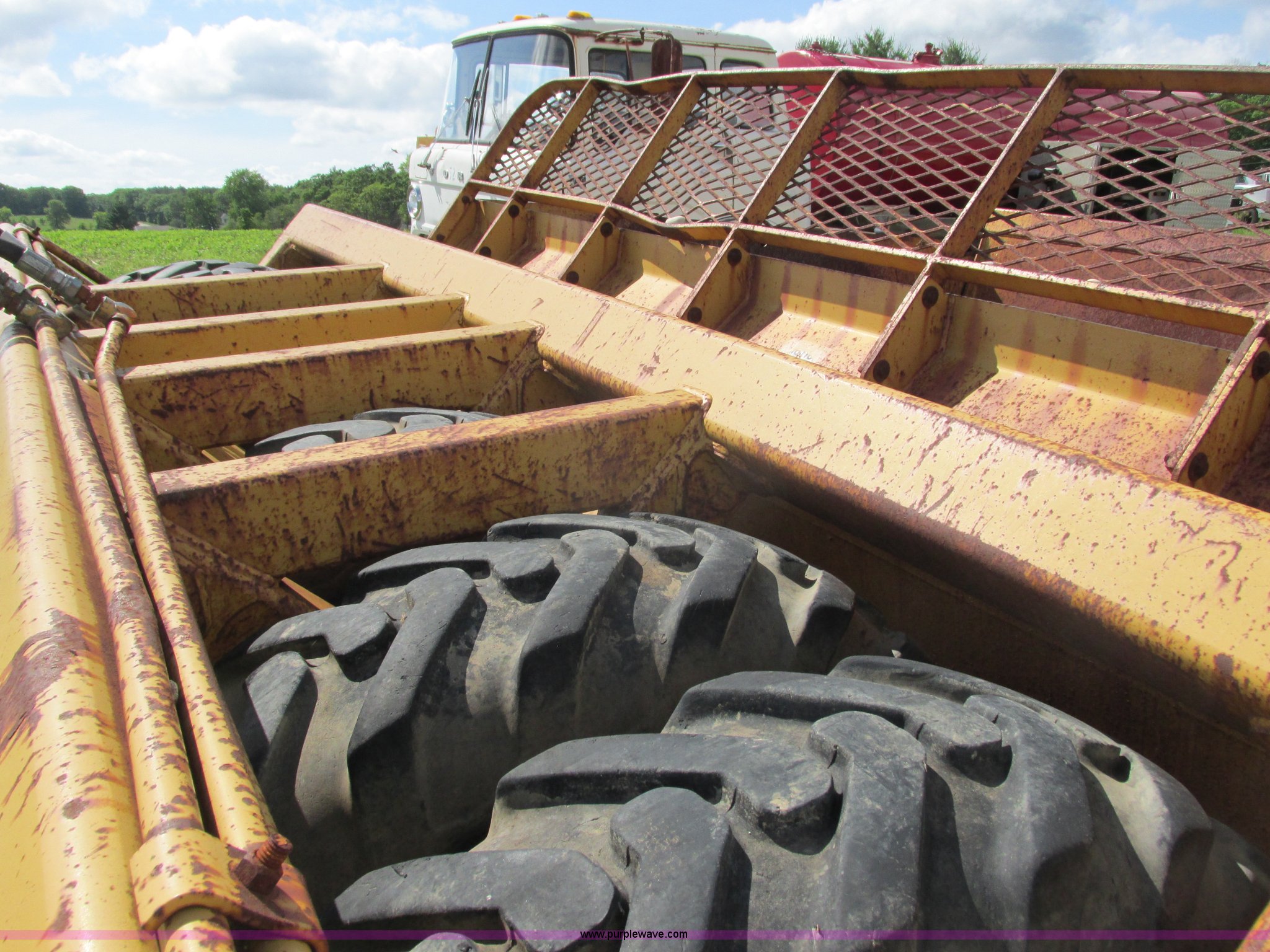Purple Wave is selling a used Pull Type Scraper in Wisconsin. This item is a Reynolds 14C hydraulic pull scraper with the following: 14 cubic yard capacity, Bolt-on cutting edge, Plumbed to pull in tandem, Rear hitch, (6) 13.00-24TG tires, Serial 28203