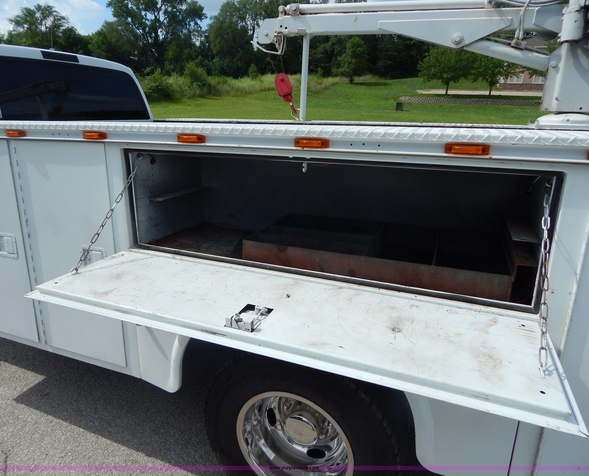 Purple Wave is selling a used Service Truck in Missouri. This item is a 2007 Ford F350 Super Duty XL utility truck with the following: 219,978 miles on odometer, 6.0L V8 OHV 32V turbo diesel engine, Automatic transmission, AC and heat, Tilt, Cruise, AM/FM, Power windows, locks, and mirrors, Cloth interior, Trailer brake controller, Auto Crane, Wired remote, Front tow hooks, Receiver hitch, Trailer wiring, 165" wheelbase, Chrome wheel covers, 235/80R17 tires