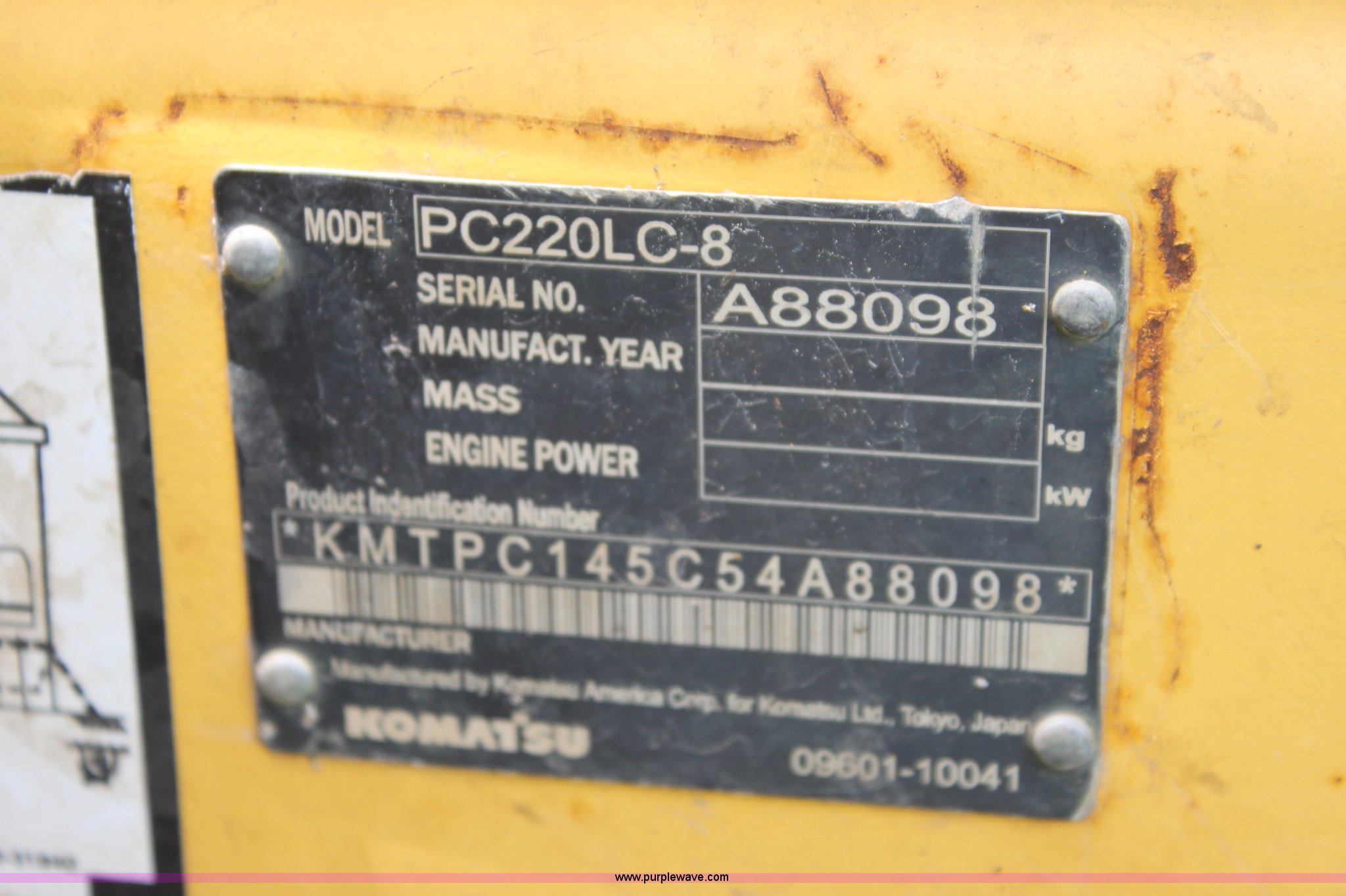 Purple Wave is selling a used Hydraulic Excavator in Kansas. This item is a 2006 Komatsu PC220LC-8 excavator with the following: 5,515 hours on meter, Komatsu six cylinder diesel engine, Hydrostatic transmission, Enclosed cab, AC, AM/FM, Windshield wiper, 7" LCD monitor, Two lever controls with pedals, 10.5'L stick, Esco 47" bucket, (5) teeth, 1.6 yard capacity, JRB quick tach coupler, 22'7" max dig depth, (10) bottom rollers, 32"W track pads, 54,926 lbs. base operating weight, Serial KMTPC145C54A88098, Stock# 84877