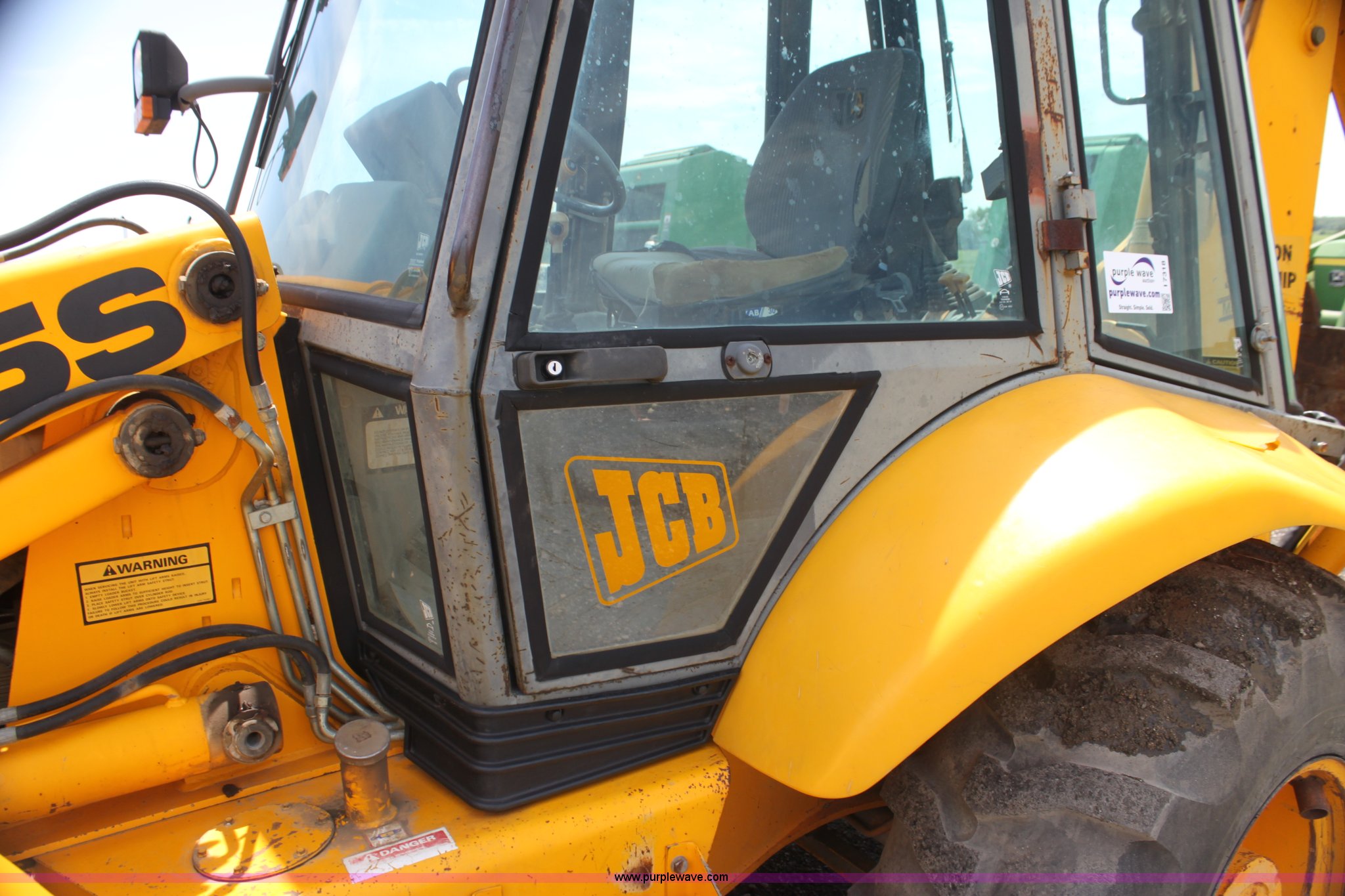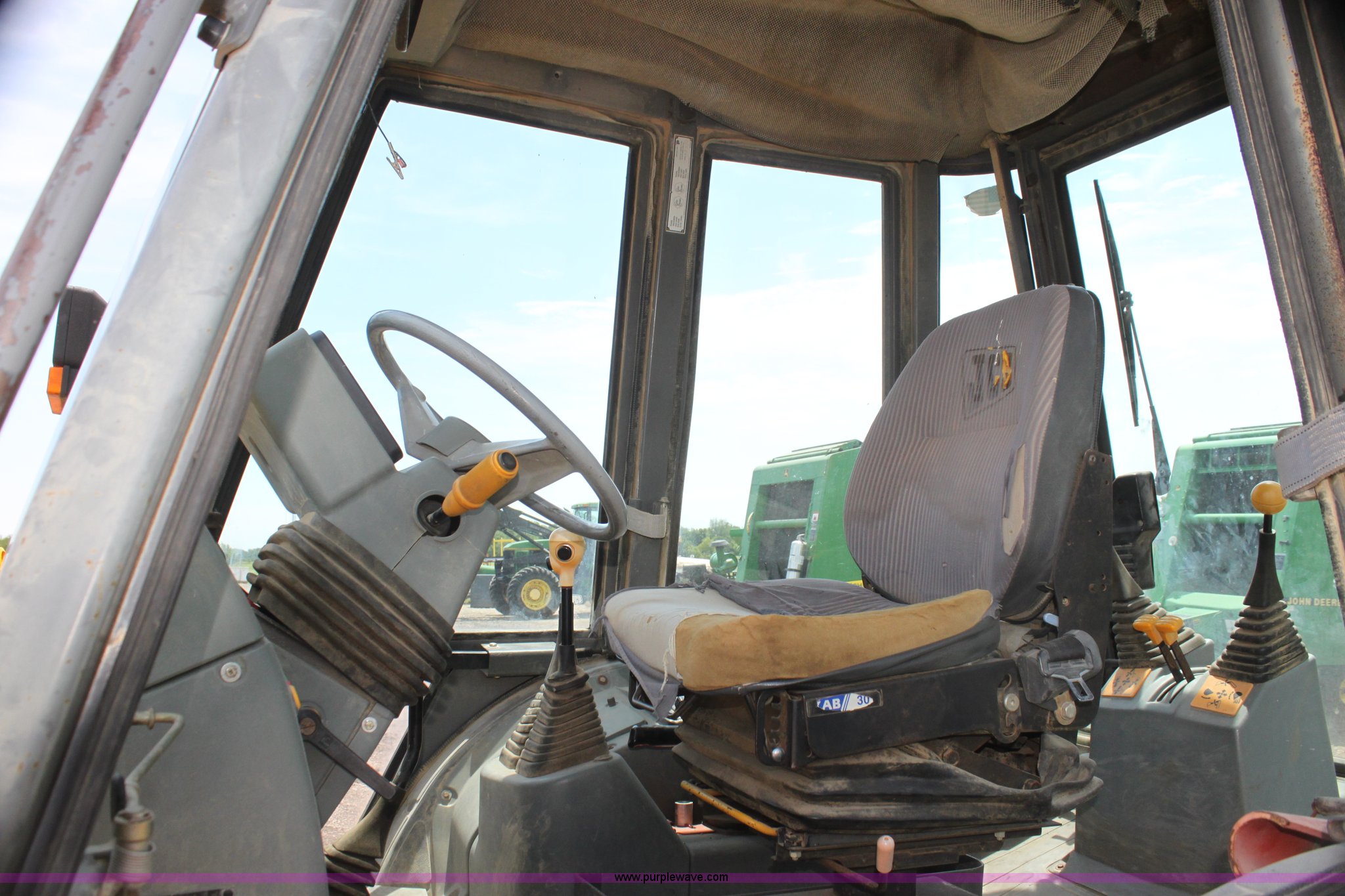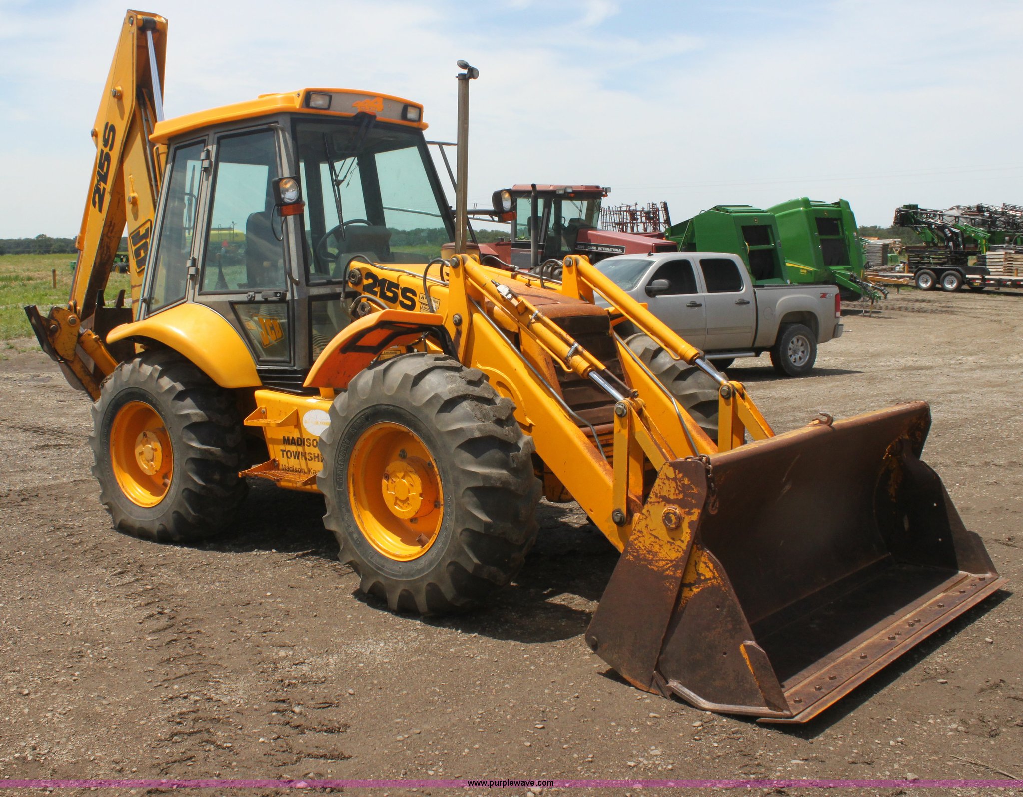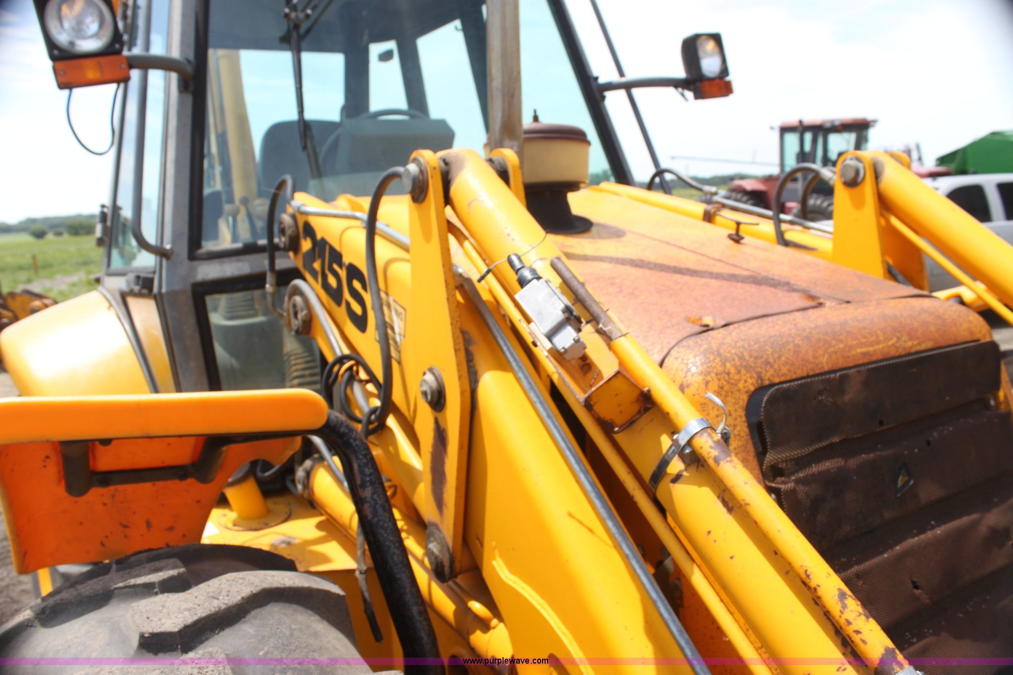 Purple Wave is selling a used Tractor Loader Backhoe in Kansas. This item is a 1992 JCB 215S backhoe with the following: 3,419 hours on meter, Four cylinder diesel engine, 100 HP, Serial AB589397, Four speed shuttle shift transmission, Four wheel drive, All wheel steer, Steering selector does not function properly, Unknown issue,, Enclosed cab, AC and heat, Unknown operating condition,, Joystick loader controls, Two stick backhoe controls, Work lights, Four-in-one loader bucket, 90"W, 24" four tooth backhoe bucket, 16'2" digging depth, Hydraulic outriggers, 16.9-24 tires, Serial 215S0CNE403780, Stock# 90602