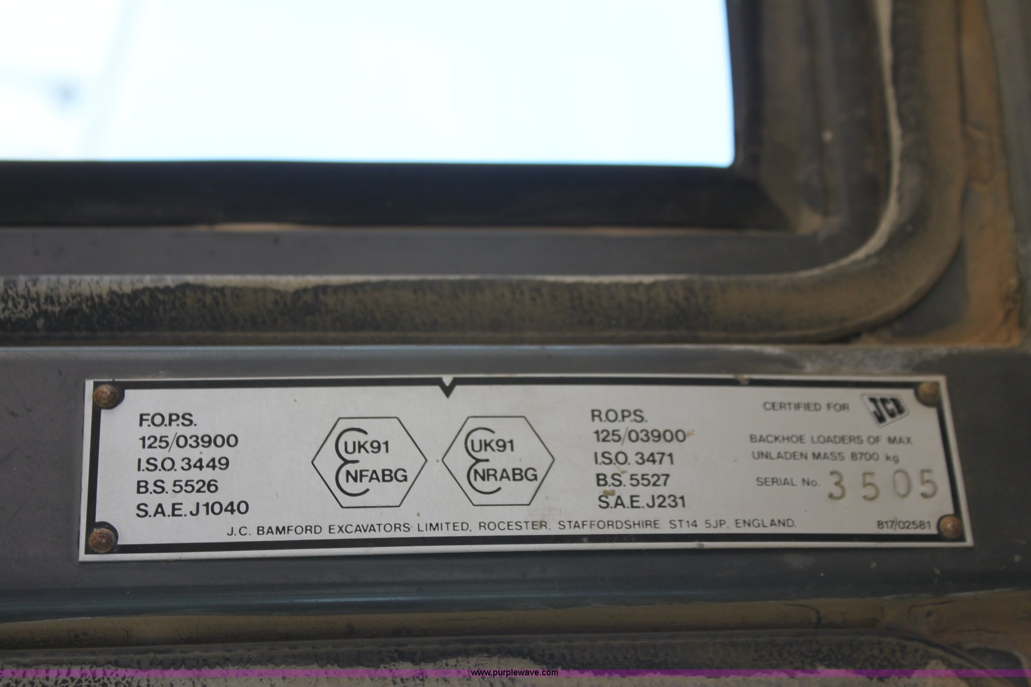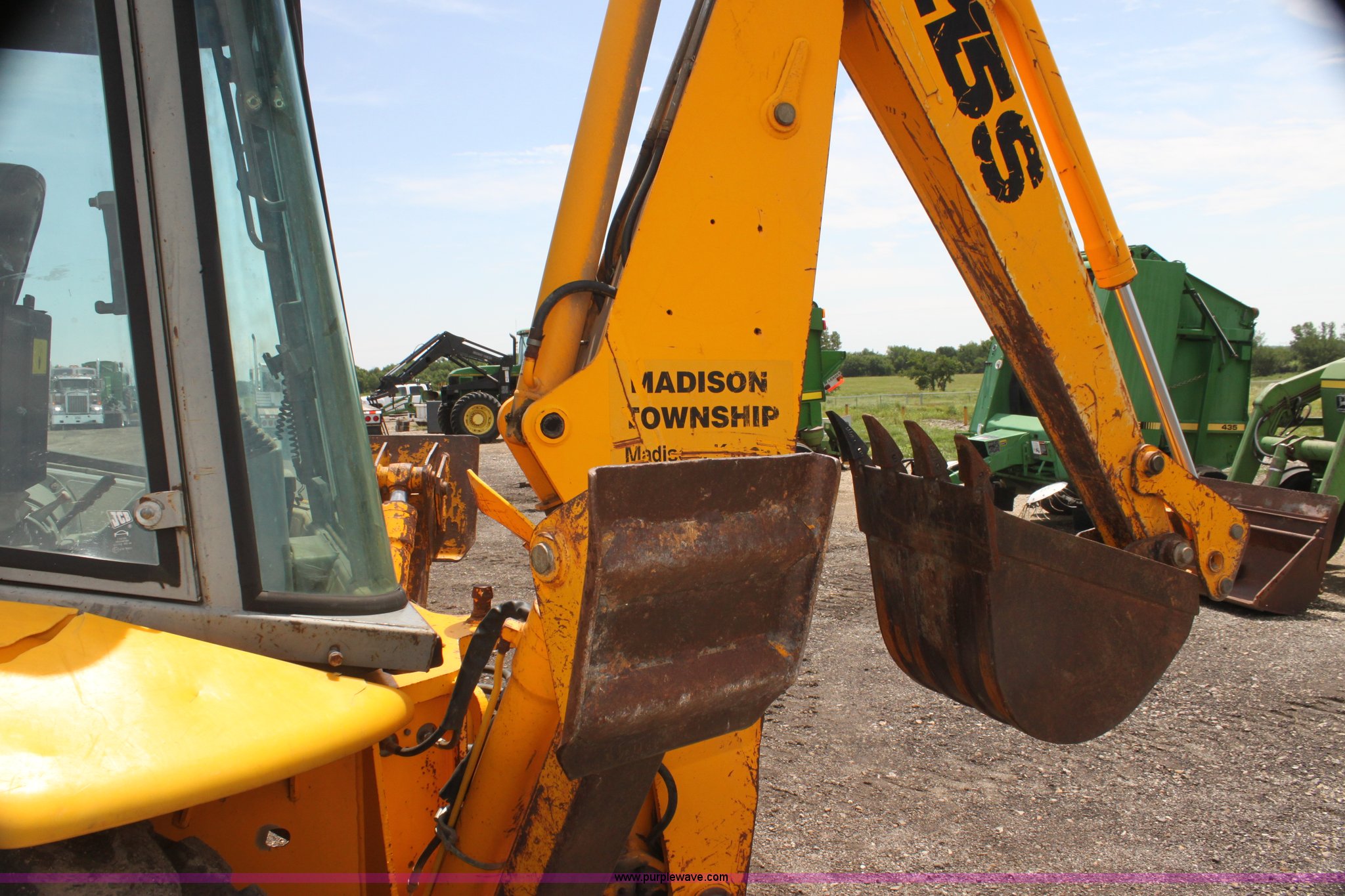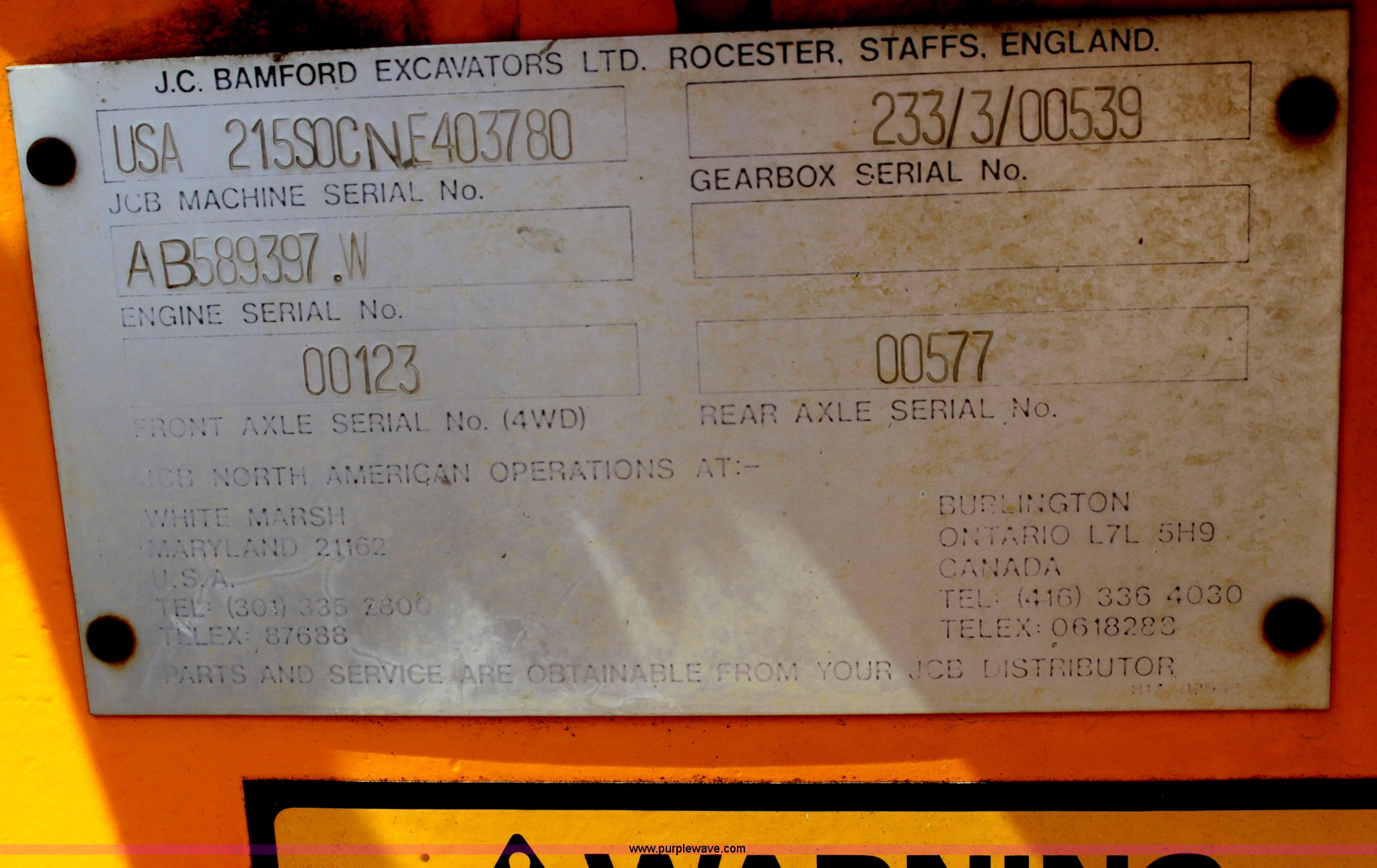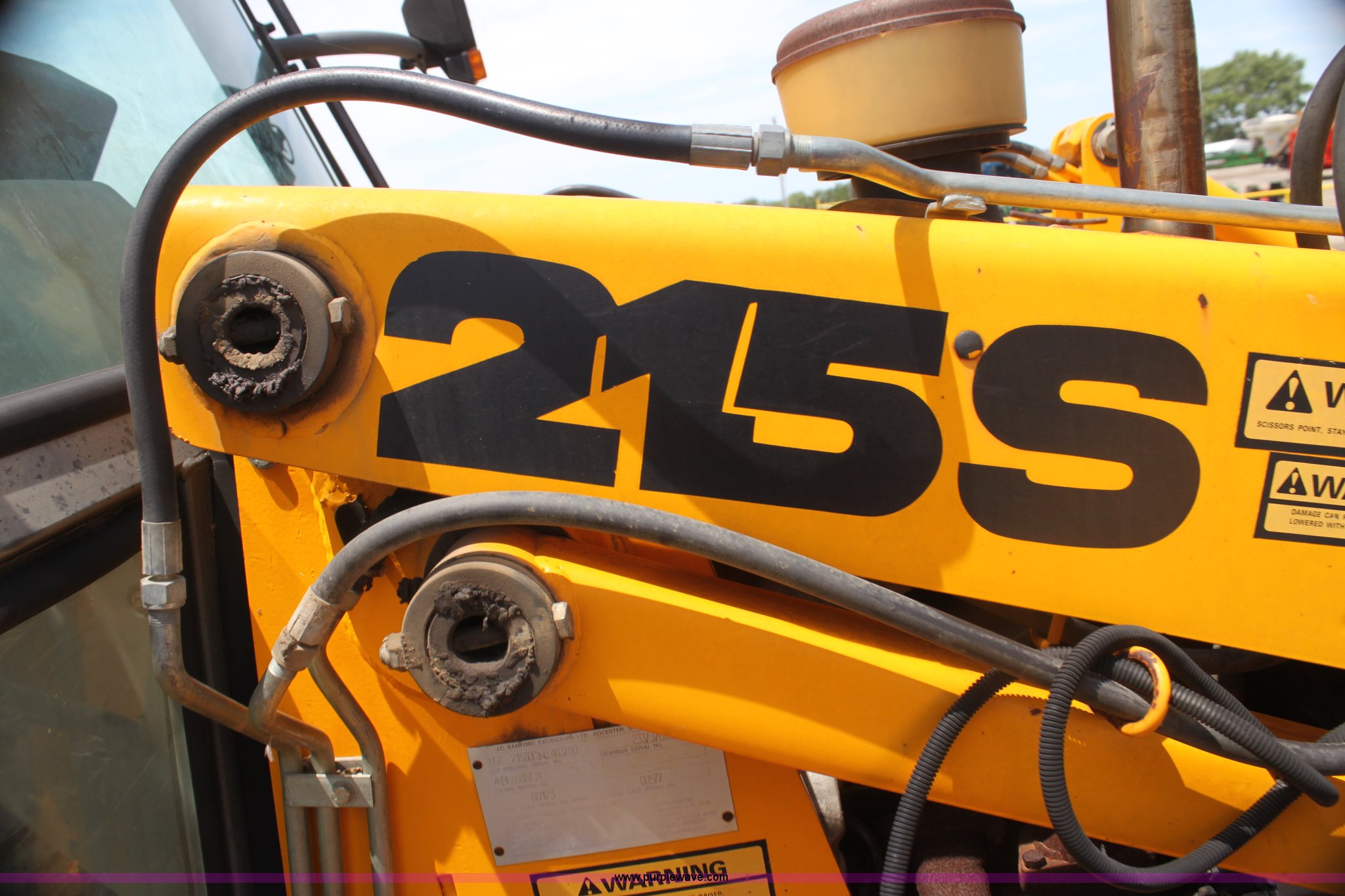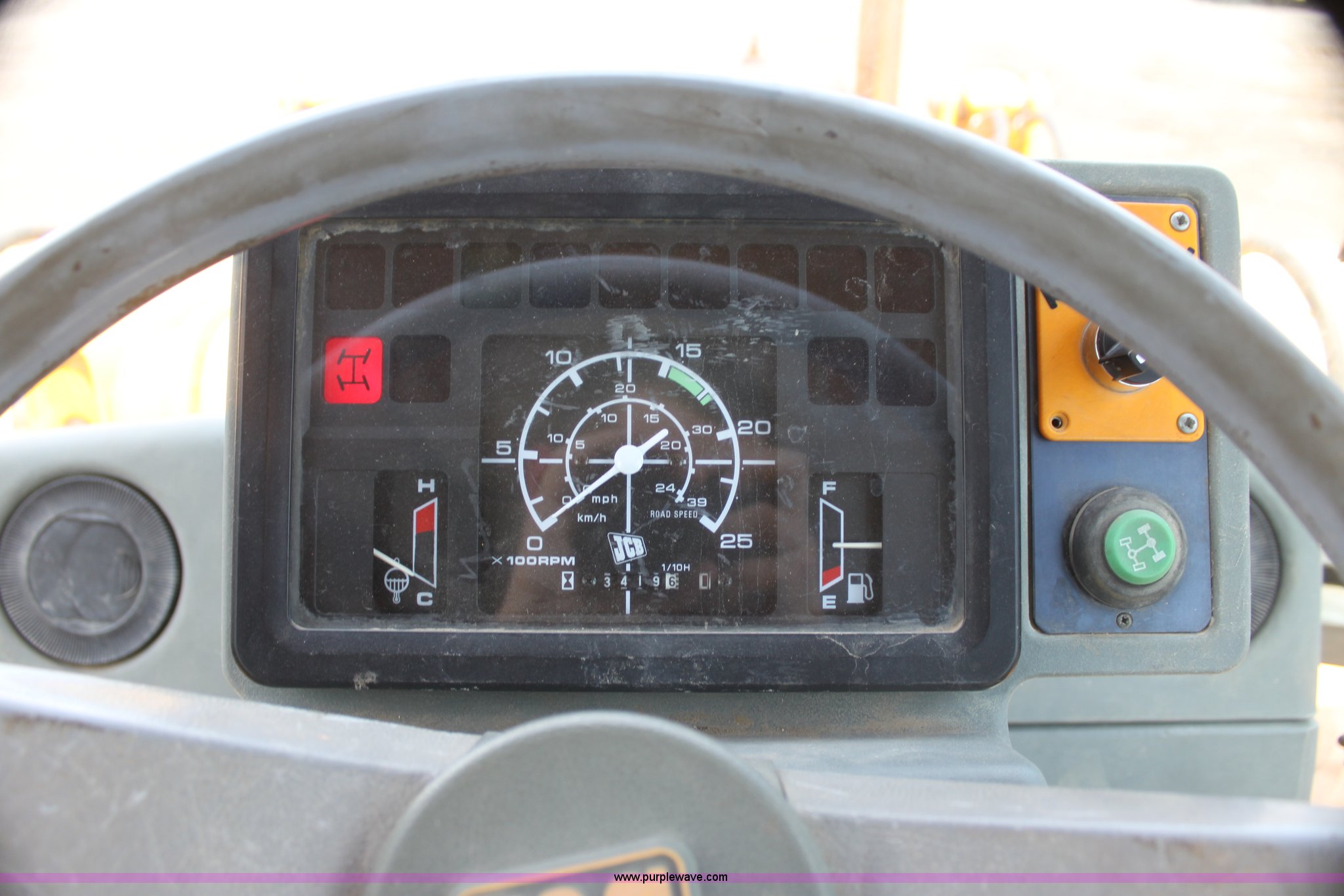 Purple Wave is selling a used Tractor Loader Backhoe in Kansas. This item is a 1992 JCB 215S backhoe with the following: 3,419 hours on meter, Four cylinder diesel engine, 100 HP, Serial AB589397, Four speed shuttle shift transmission, Four wheel drive, All wheel steer, Steering selector does not function properly, Unknown issue,, Enclosed cab, AC and heat, Unknown operating condition,, Joystick loader controls, Two stick backhoe controls, Work lights, Four-in-one loader bucket, 90"W, 24" four tooth backhoe bucket, 16'2" digging depth, Hydraulic outriggers, 16.9-24 tires, Serial 215S0CNE403780, Stock# 90602