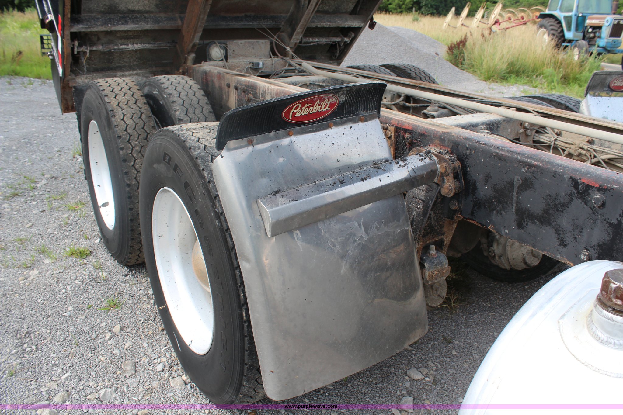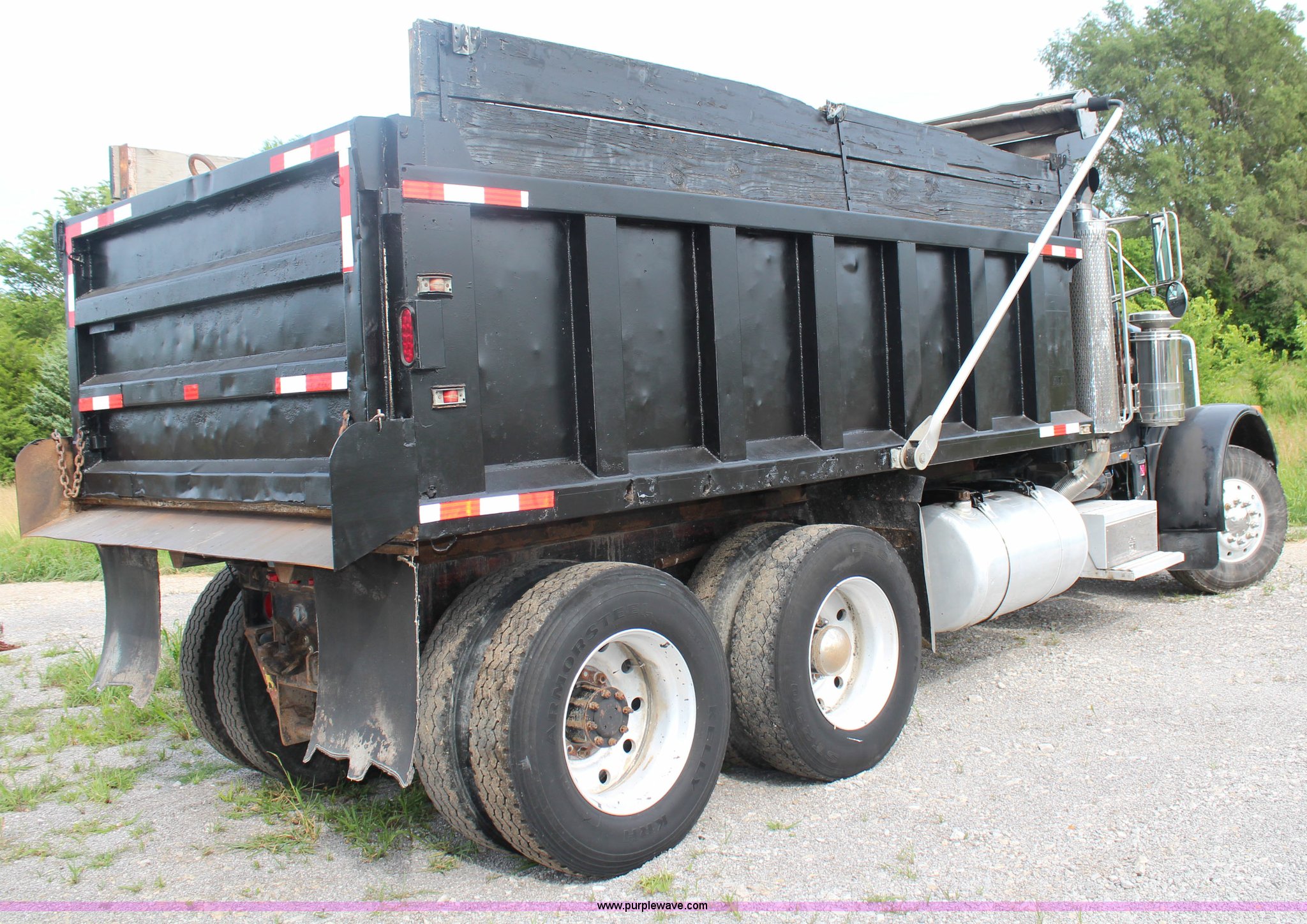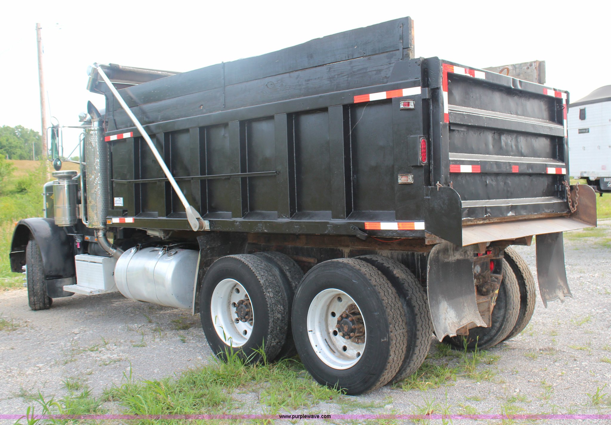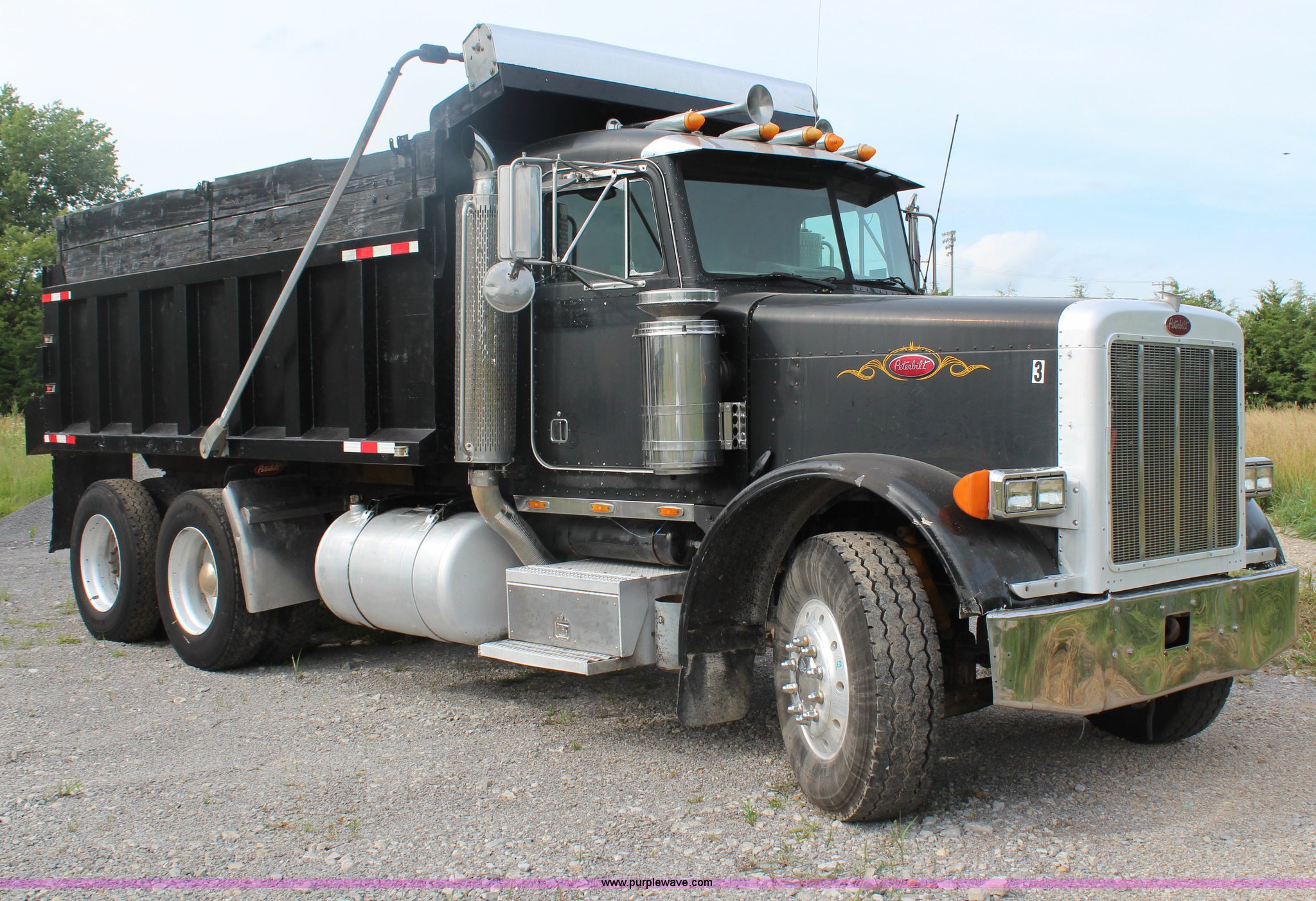 Purple Wave is selling a used Construction Dump Truck in Kansas. This item is a 1990 Peterbilt 379 dump truck with the following: 447,890 miles on odometer, Cummins Big Cam 400 14.0L L6 diesel engine, Eaton Fuller 10 speed manual transmission, Twin screw, AC and heat, Tilt, AM/FM/CD, Air suspension seat, PTO, 15'L dump bed, Air operated end gate, Single ram three stage hoist, Electric rollover tarp, Asphalt lip, Chip bar, 110 gallon fuel tank, Stainless steel fenders, Air suspension, Air brakes, Jake brake, Aluminum wheels, 315/80R22.5 front tires, 11R24.5 rear tires, GVWR 50,000 lbs, FAWR 12,000 lbs, IAWR 19,000 lbs, RAWR 19,000 lbs