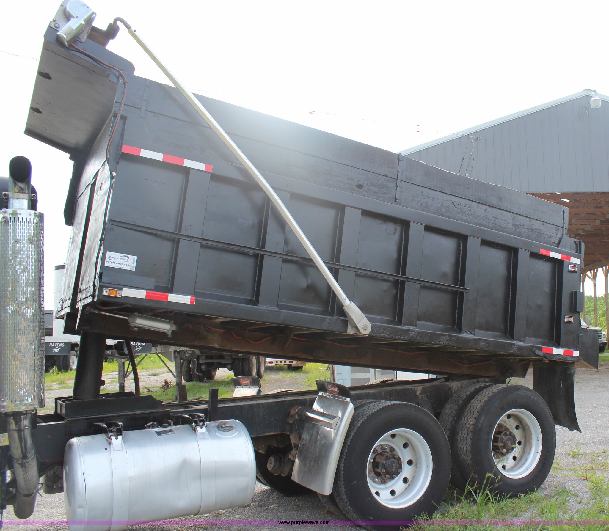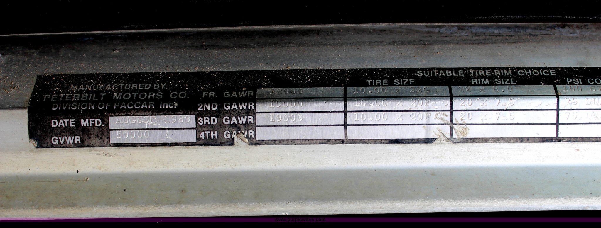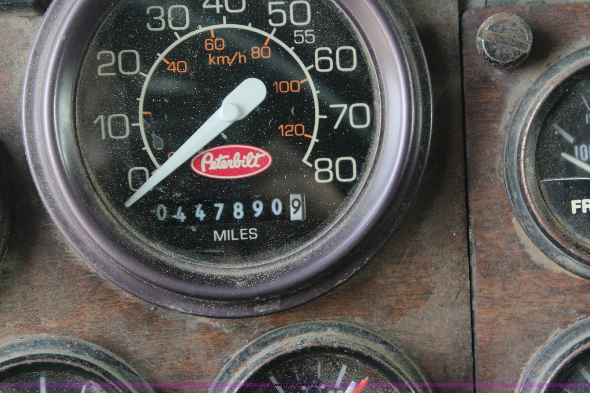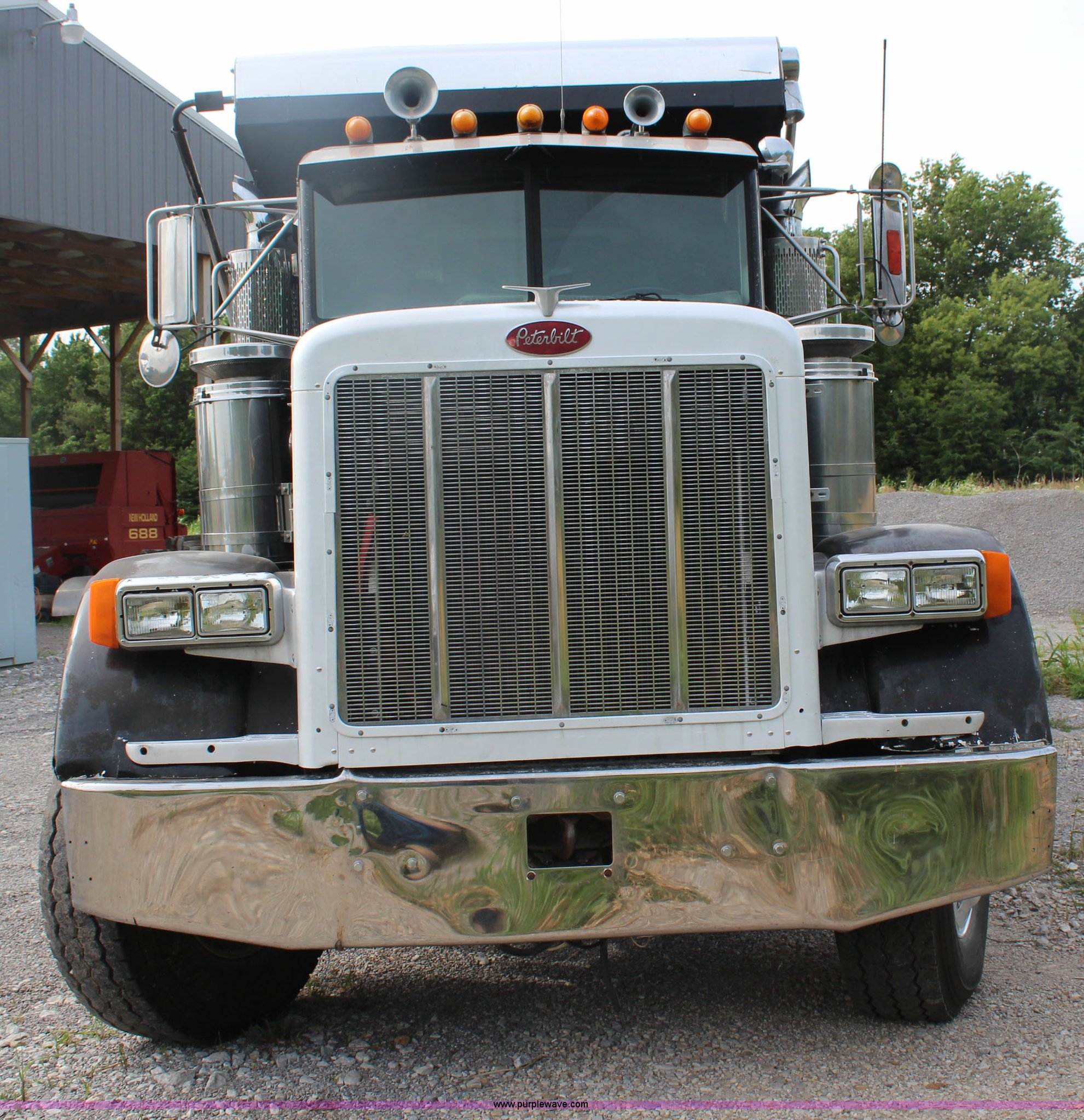 Purple Wave is selling a used Construction Dump Truck in Kansas. This item is a 1990 Peterbilt 379 dump truck with the following: 447,890 miles on odometer, Cummins Big Cam 400 14.0L L6 diesel engine, Eaton Fuller 10 speed manual transmission, Twin screw, AC and heat, Tilt, AM/FM/CD, Air suspension seat, PTO, 15'L dump bed, Air operated end gate, Single ram three stage hoist, Electric rollover tarp, Asphalt lip, Chip bar, 110 gallon fuel tank, Stainless steel fenders, Air suspension, Air brakes, Jake brake, Aluminum wheels, 315/80R22.5 front tires, 11R24.5 rear tires, GVWR 50,000 lbs, FAWR 12,000 lbs, IAWR 19,000 lbs, RAWR 19,000 lbs
