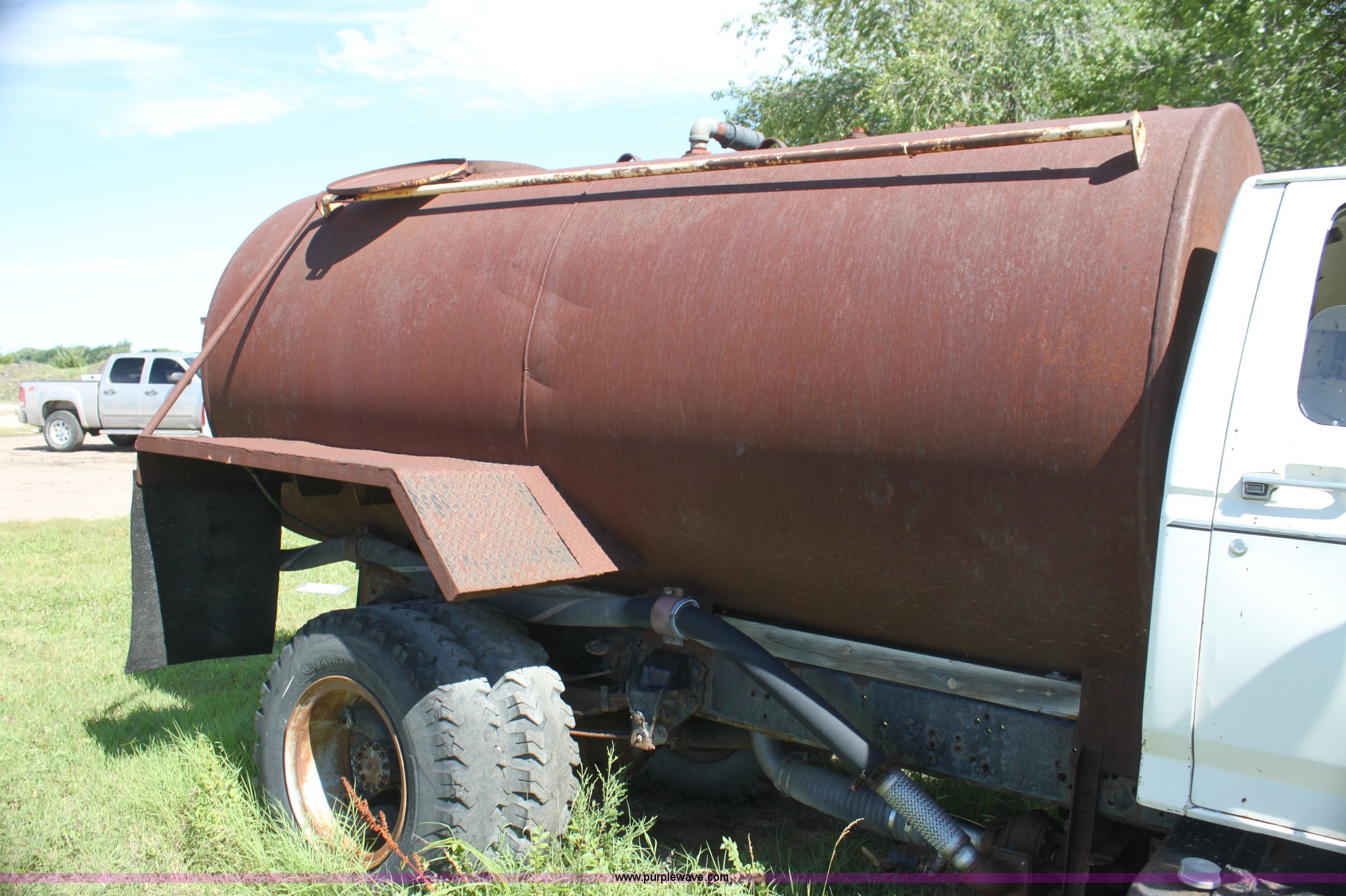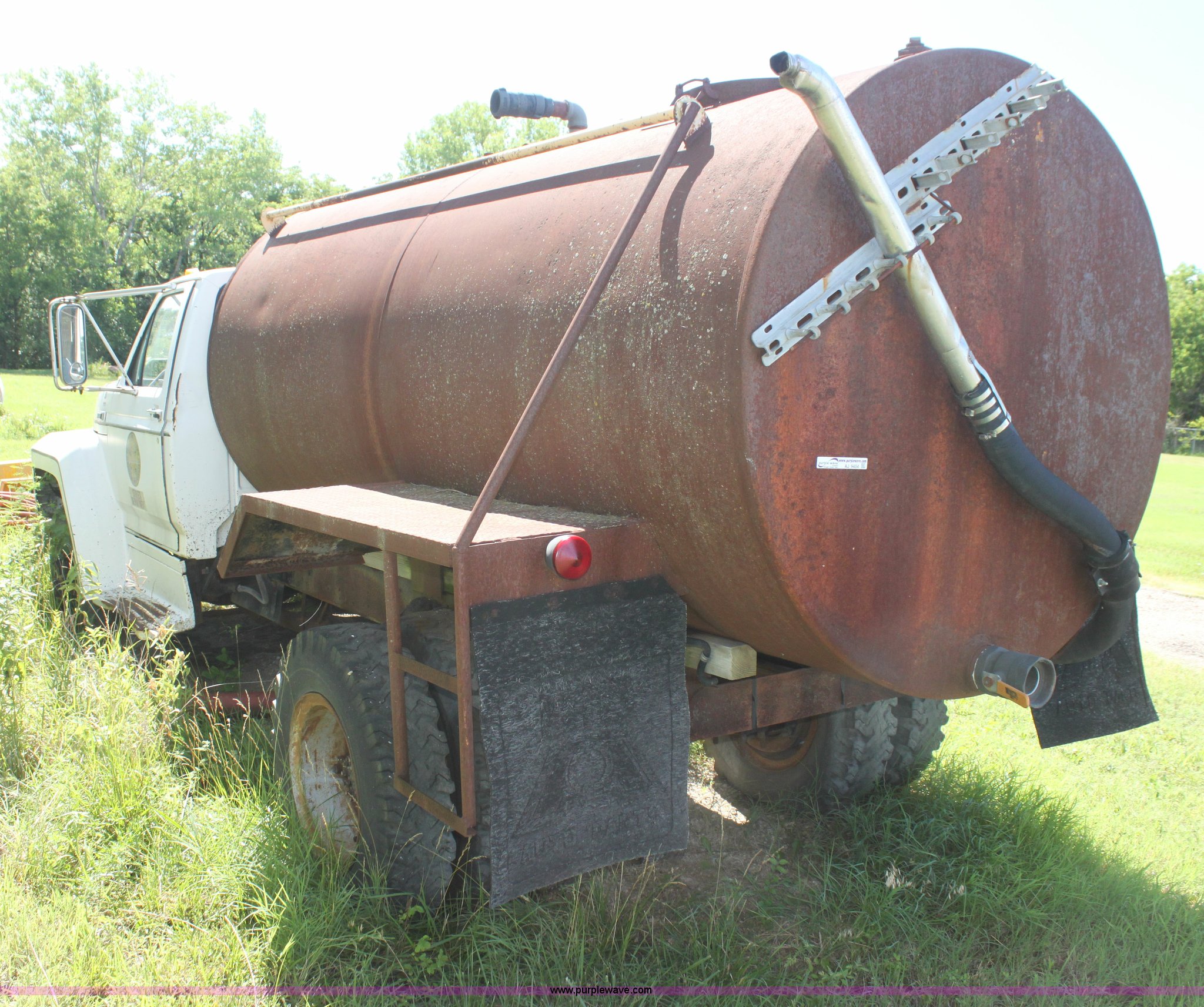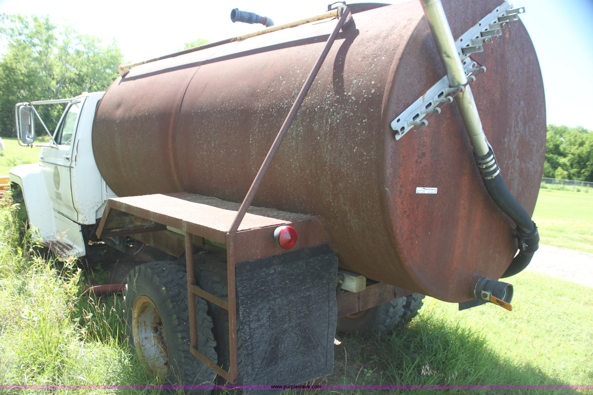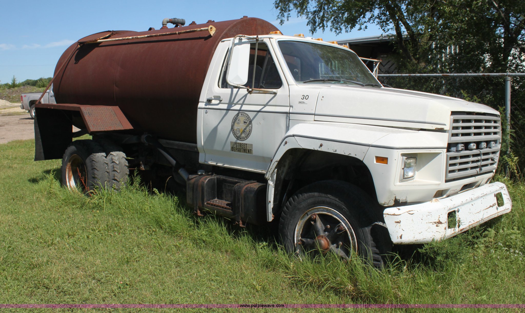 Purple Wave is selling a used Applicator Truck in Kansas. This item is a 1982 Ford F700 Honey Wagon tanker truck with the following: 34,890 miles on odometer, Gas engine, Five speed manual transmission, Two speed rear axle, 12'L x 64" diameter steel tank, Approx. 2,500 gallon capacity, 9.00-20 tires, Interior/exterior cosmetic damage, Non-operational unit, Has sat for 10 years