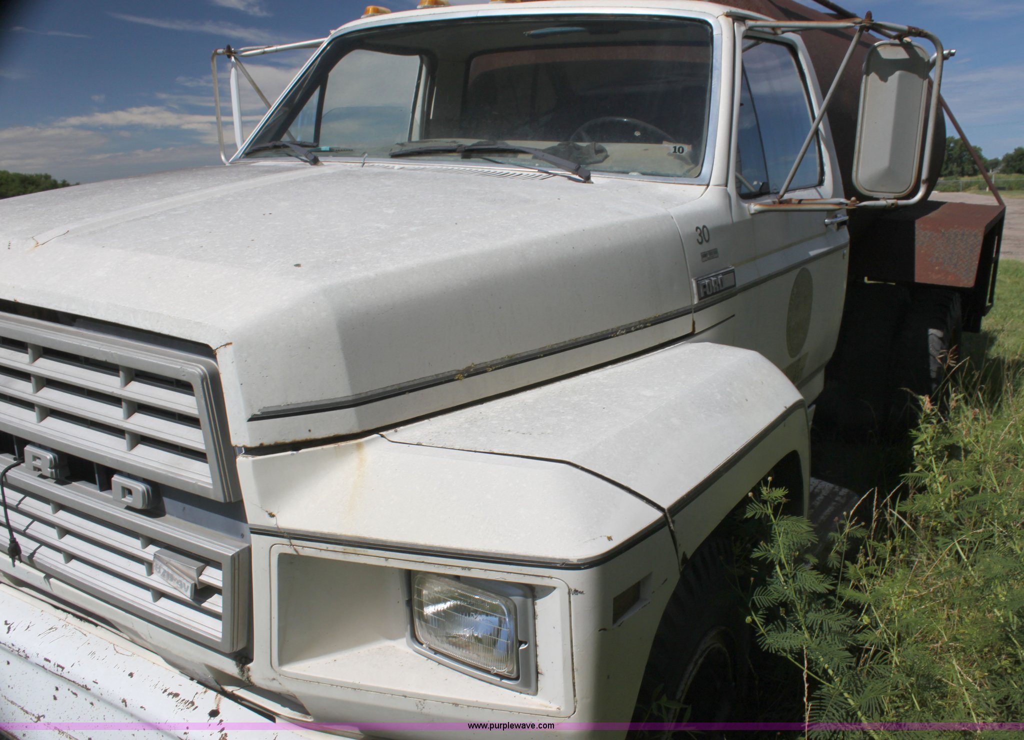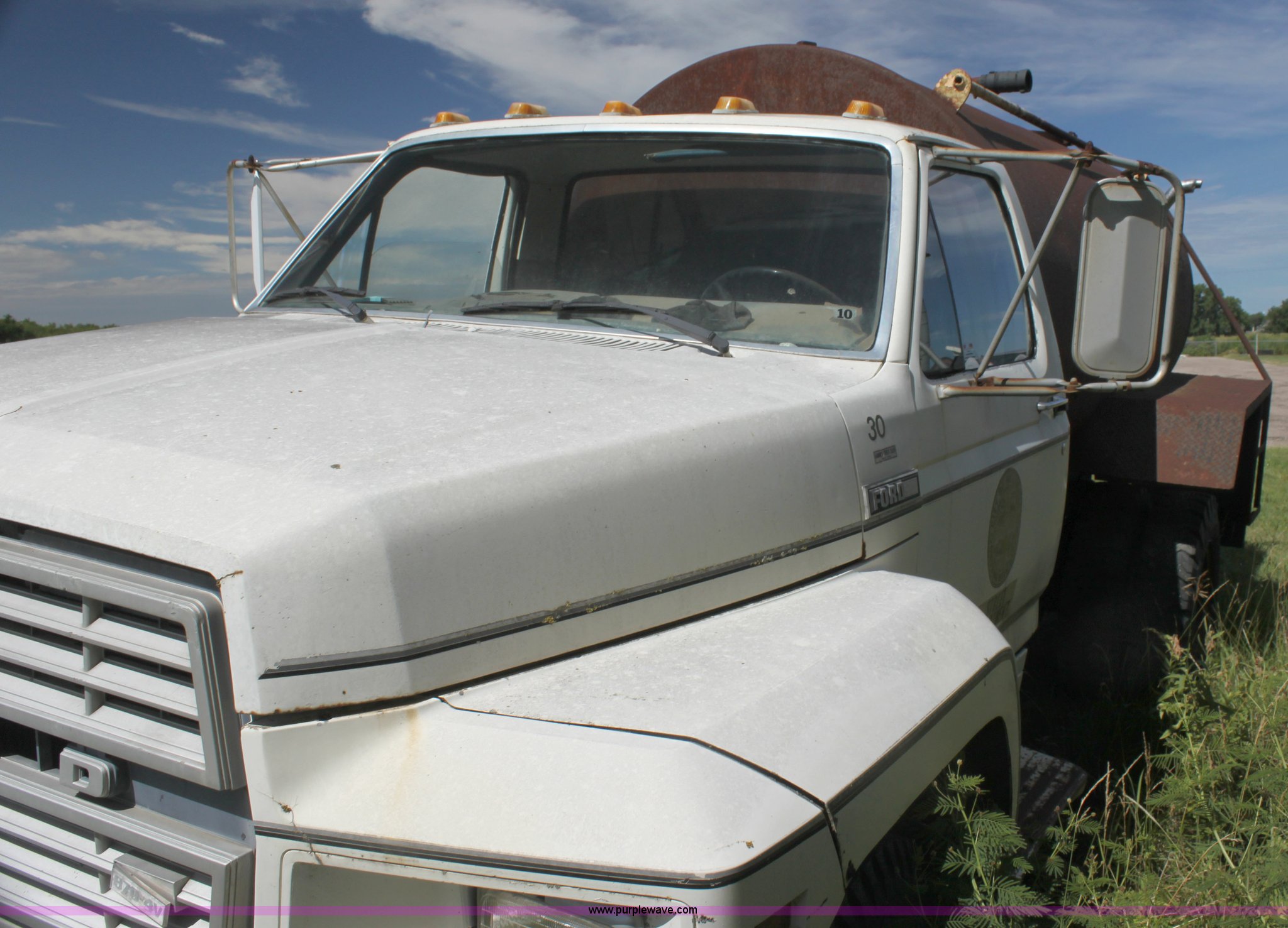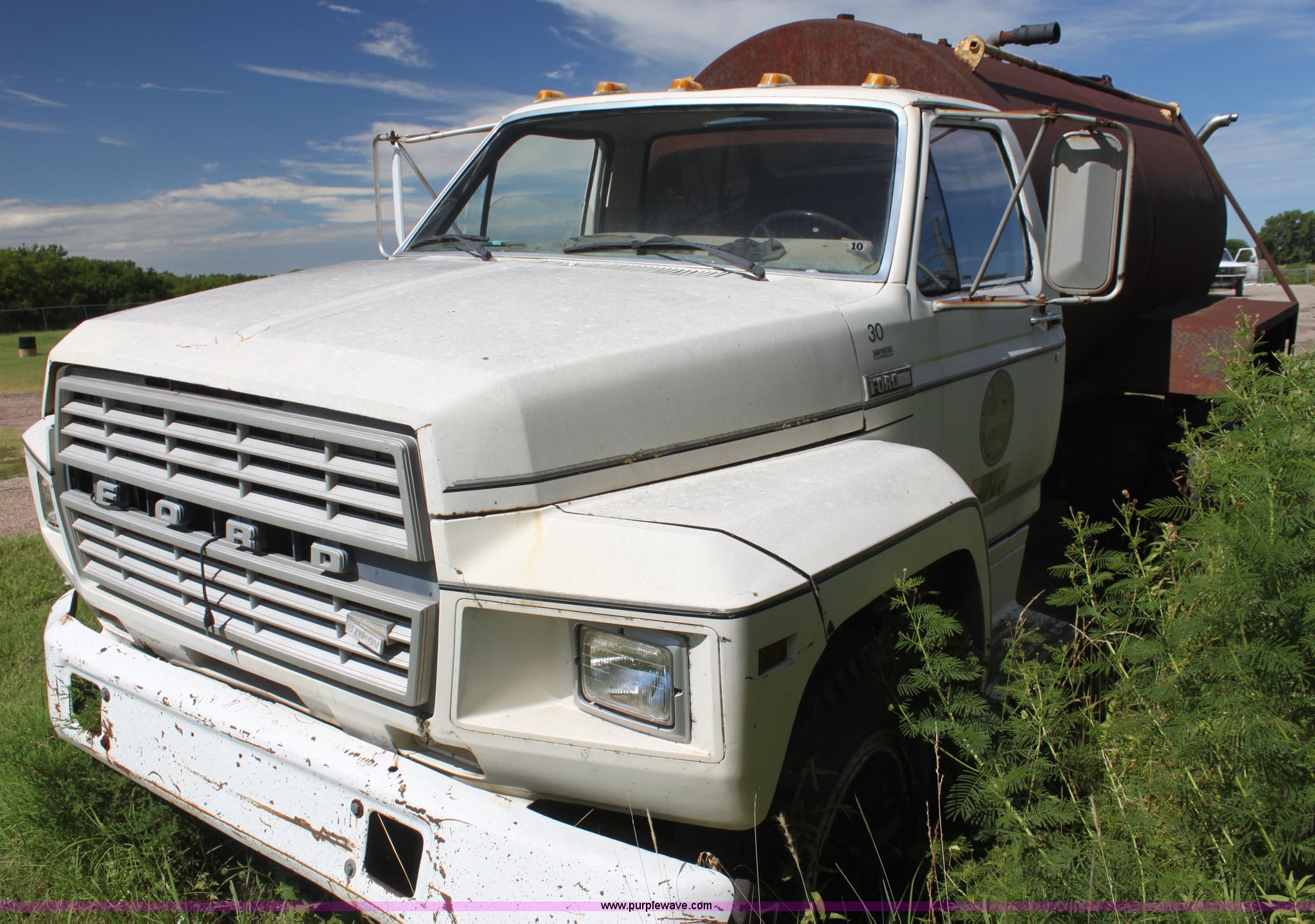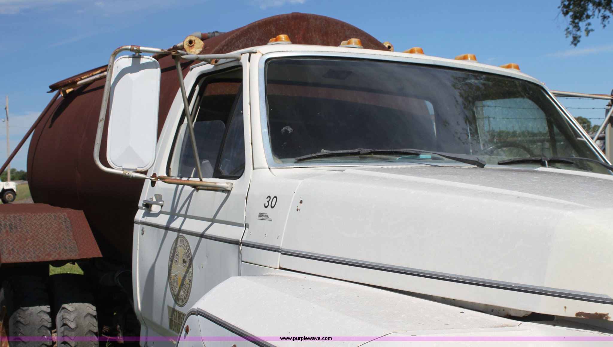 Purple Wave is selling a used Applicator Truck in Kansas. This item is a 1982 Ford F700 Honey Wagon tanker truck with the following: 34,890 miles on odometer, Gas engine, Five speed manual transmission, Two speed rear axle, 12'L x 64" diameter steel tank, Approx. 2,500 gallon capacity, 9.00-20 tires, Interior/exterior cosmetic damage, Non-operational unit, Has sat for 10 years