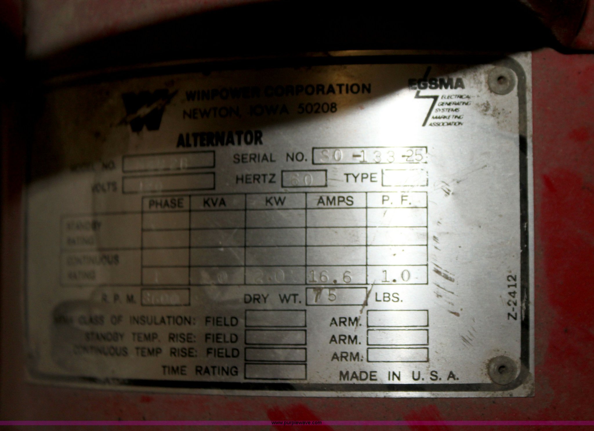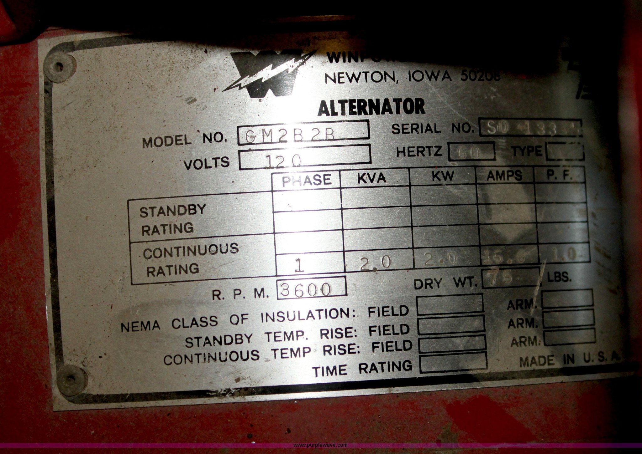 Purple Wave is selling a used Generator Set in Kansas. This item is a Winpower generator with the following: Briggs & Stratton gas engine, Alternator, Model GM2B2B, 120V, 2 kW
