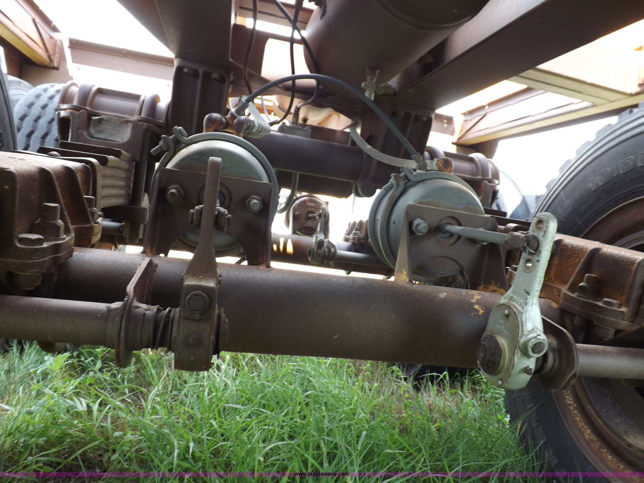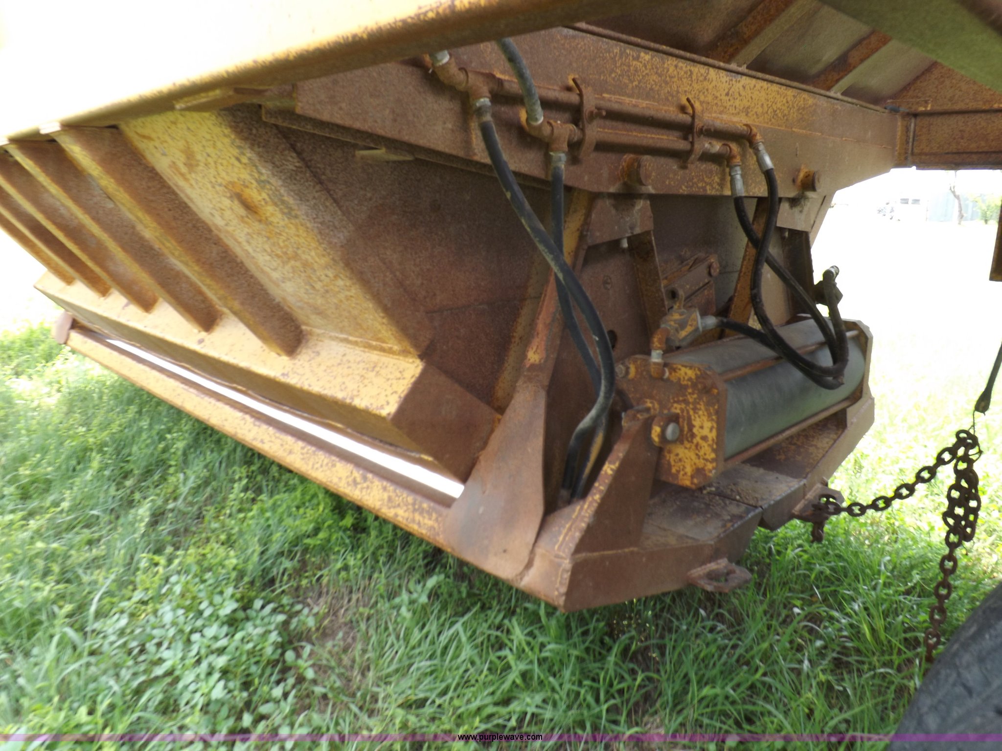 Purple Wave is selling a used Bottom Dump Trailer in Kansas. This item is a 1983 Ranch belly dump trailer with the following: 31.5'L x 7'9"W x 9'H, Rear push block, Left side mounted gate control valve, Pin/post landing gear, Pneumatic operation, Hutch spring suspension, 10.00R20 tires, GVWR 80,000 lbs
